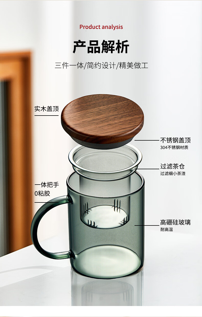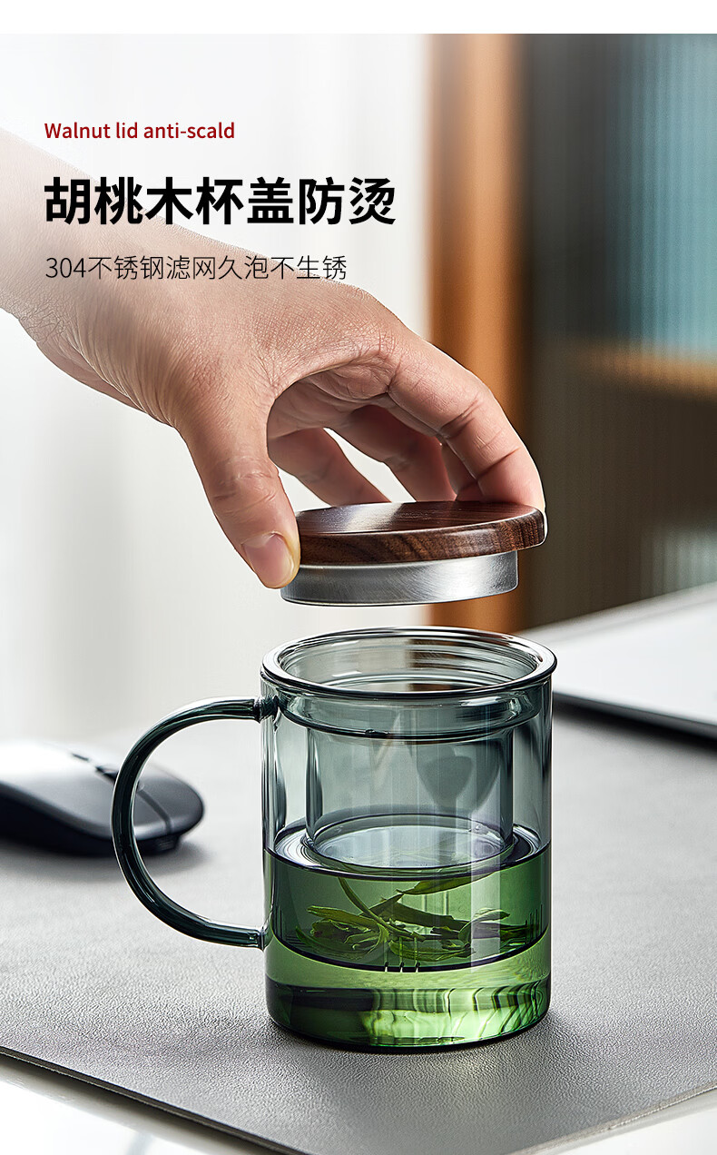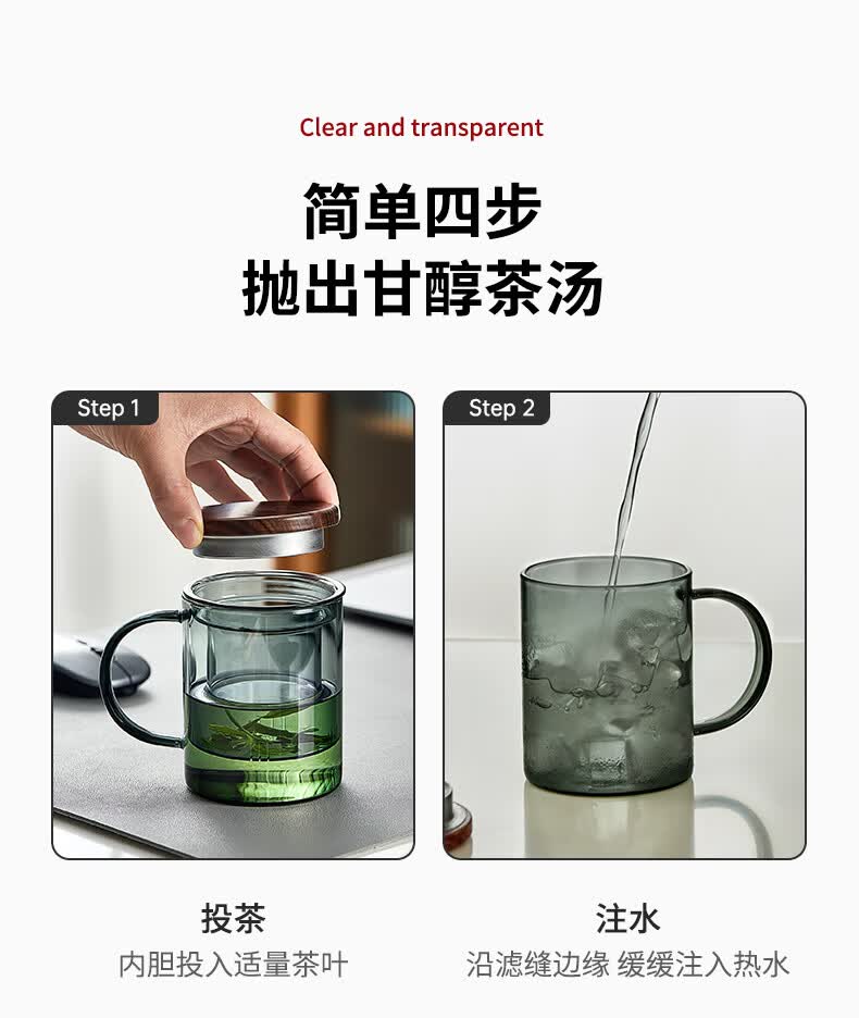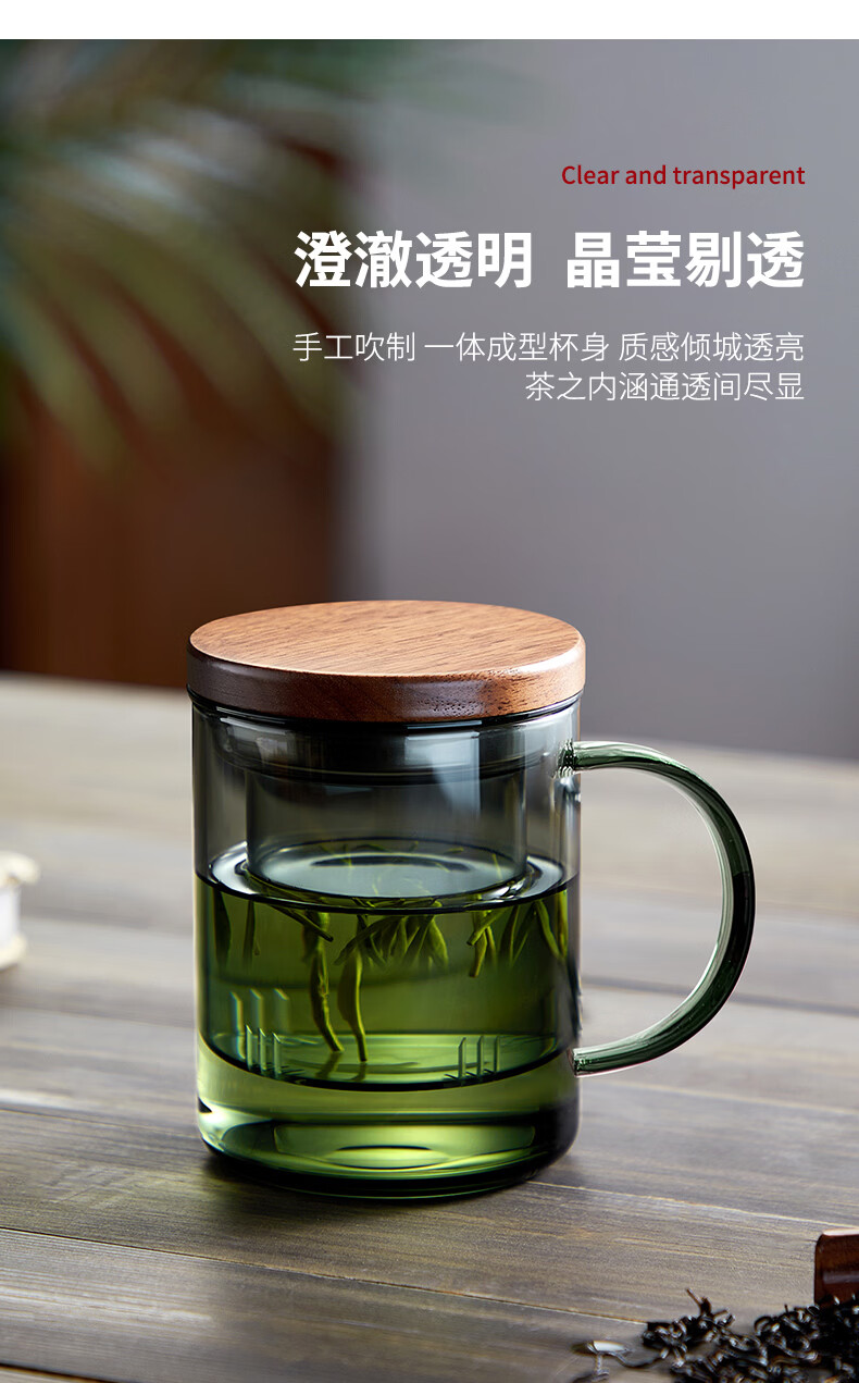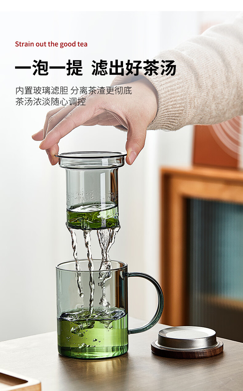 忆壶茶茶杯玻璃泡茶杯茶水分离高硼硅加厚男士高档办公室茶道绿茶杯子 400ML轻奢黑泡茶杯