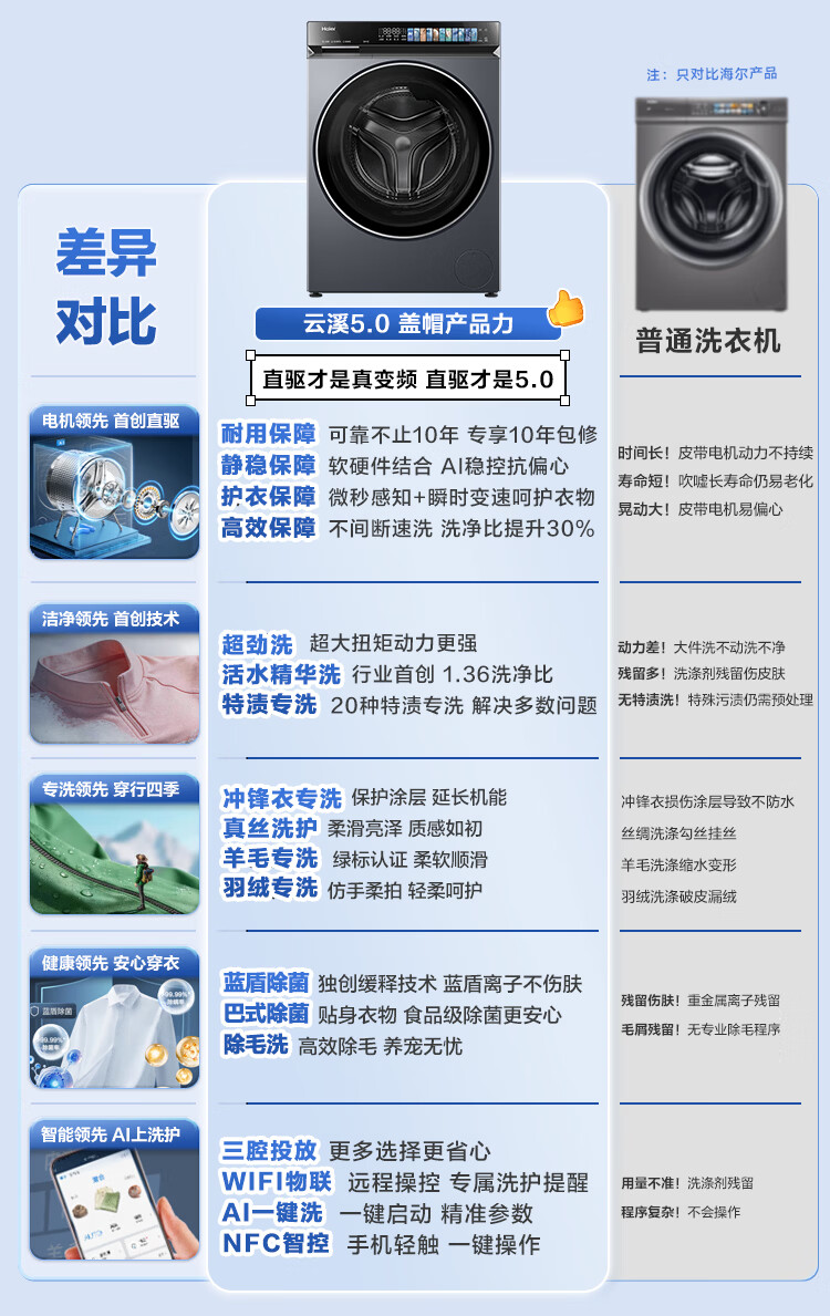 海尔(Haier)云溪5.0 AWE同款 滚筒洗衣机全自动单洗家用 10公斤超薄 国家补贴以旧换新 京东自营独家 直驱7AD1