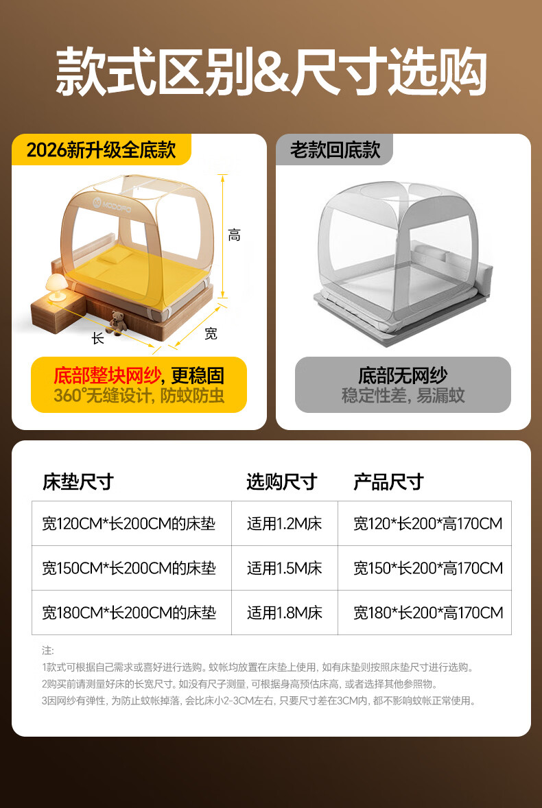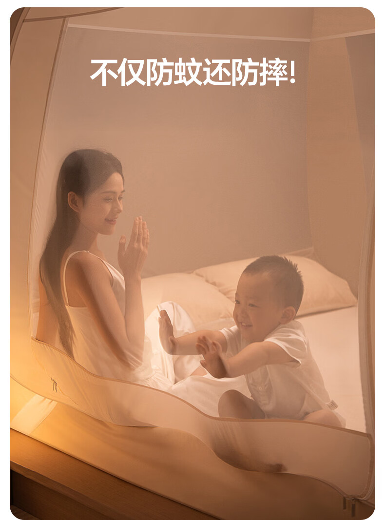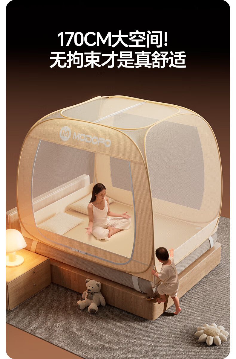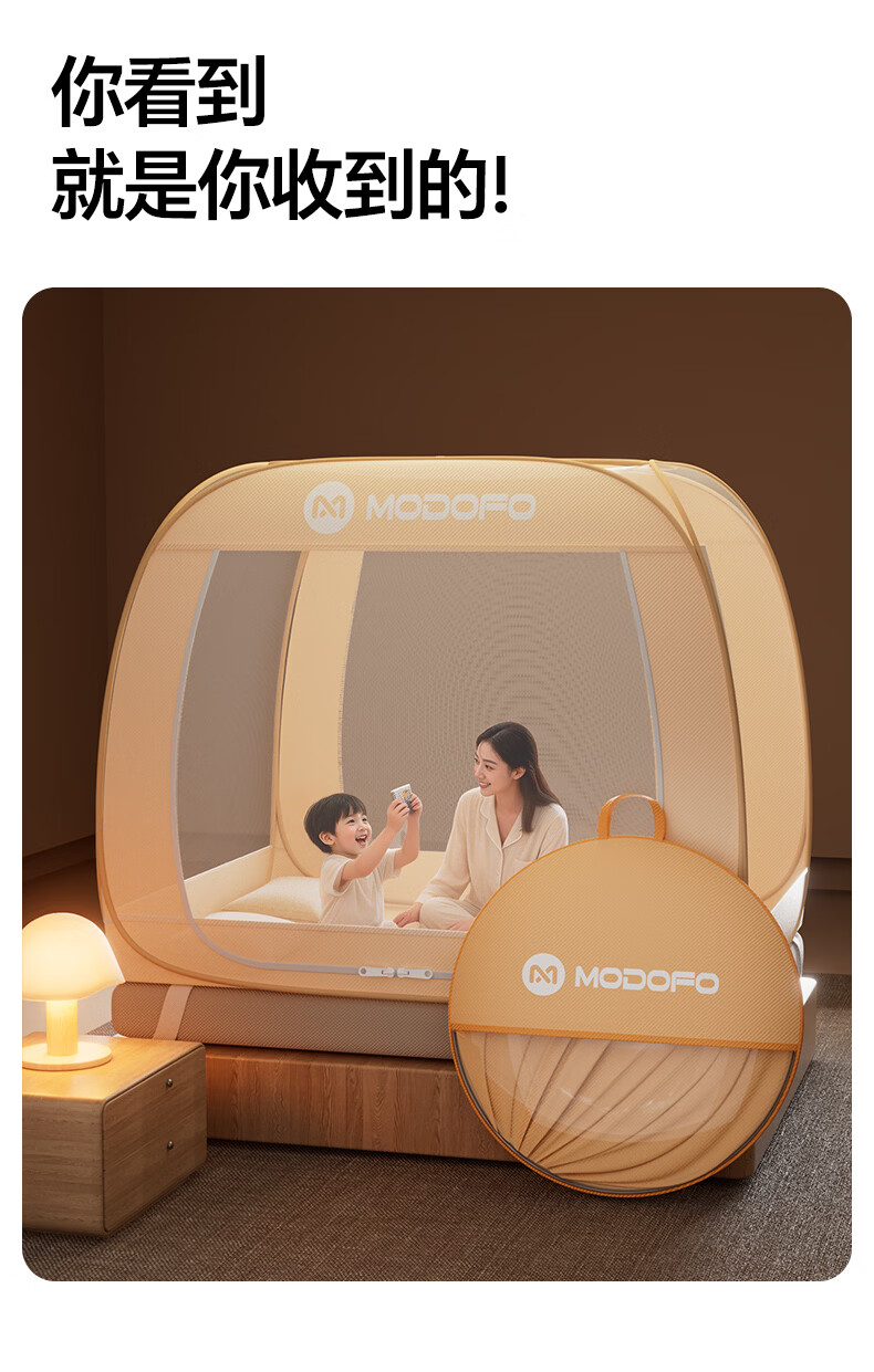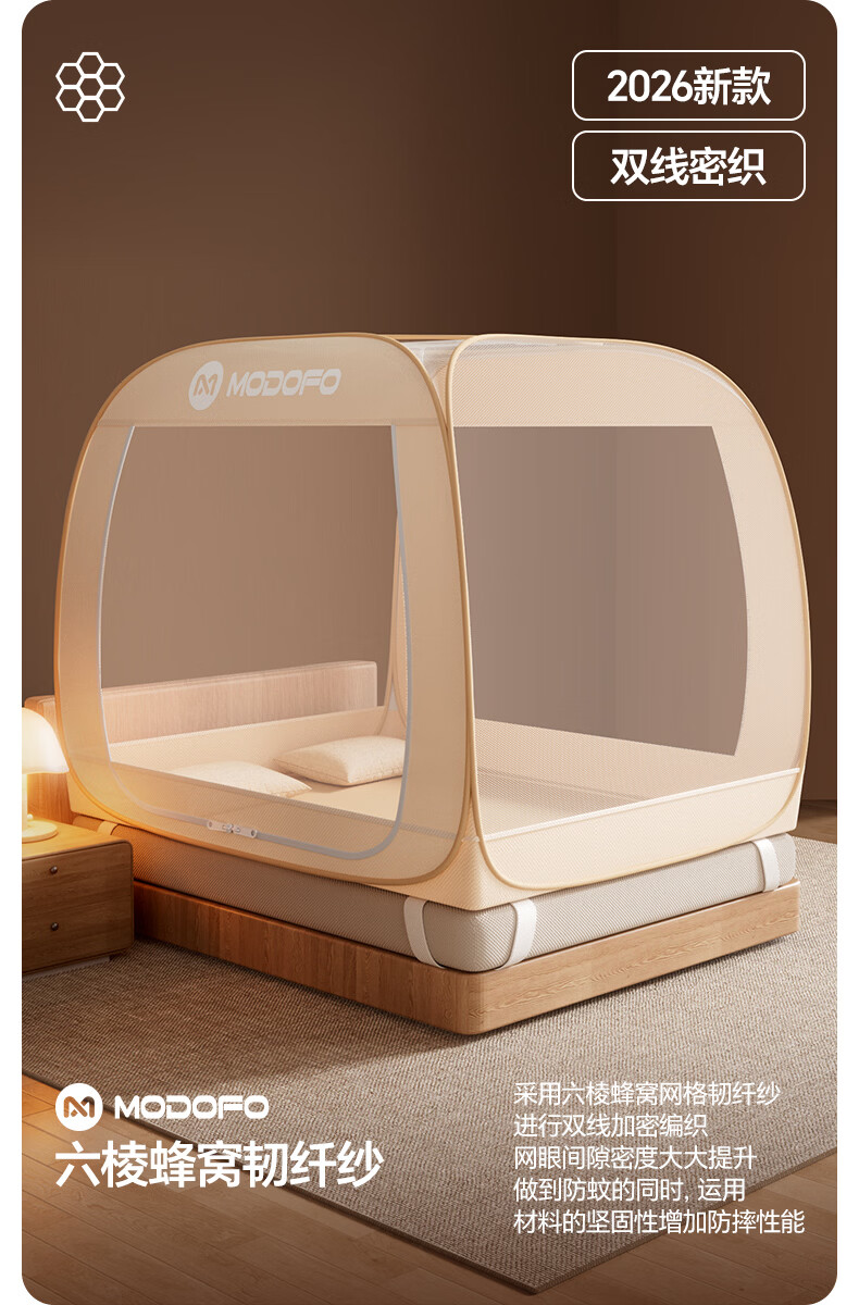 梦多福免安装蒙古包蚊帐2026新款防摔家用卧室全底婴儿全罩式床上帐篷 米黄全底·免安装丨双线超密织丨3.1mm加粗高弹碳钢丝 1.2m*2m*1.7m 一丢即开·无需安装丨真A类母婴级5A抗菌