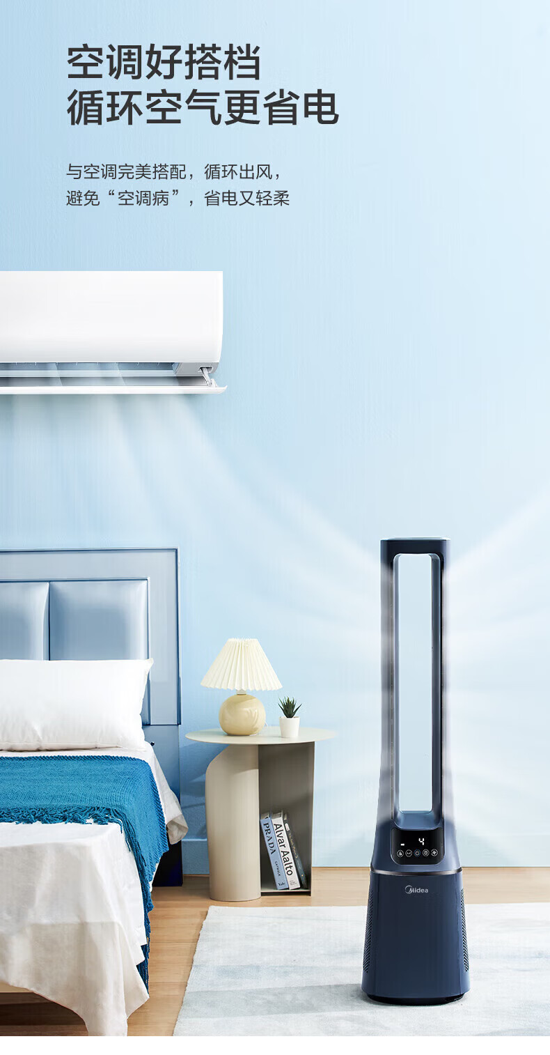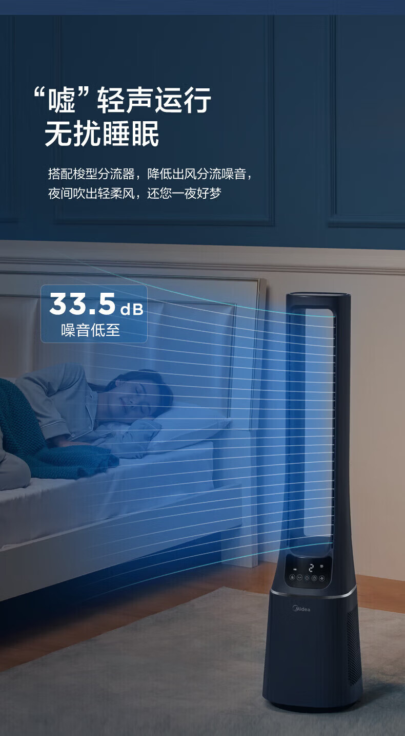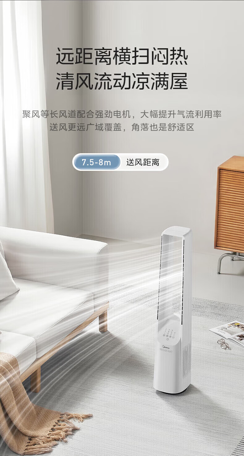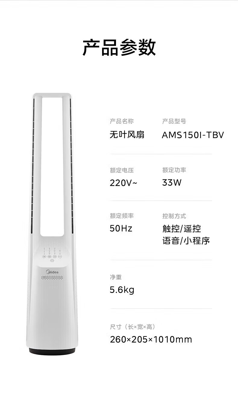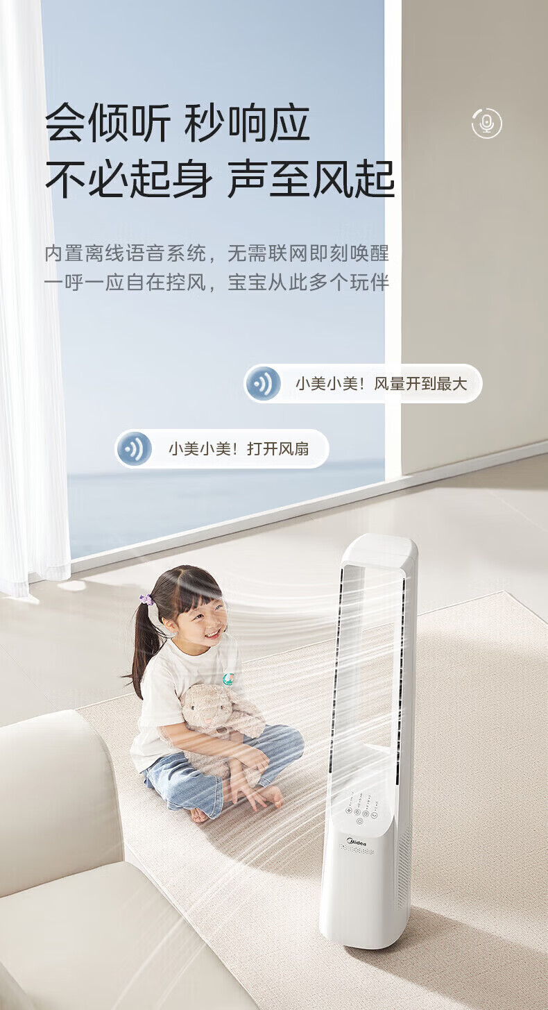 美的(Midea)无叶风扇家用电风扇智能落地扇卧室办公室轻音风随温变定时立式落地塔扇家电一体机APP遥控智控 【白色语音遥控款】7h定时 风随温变