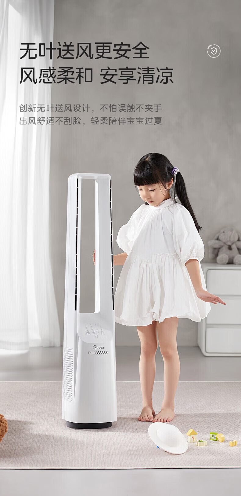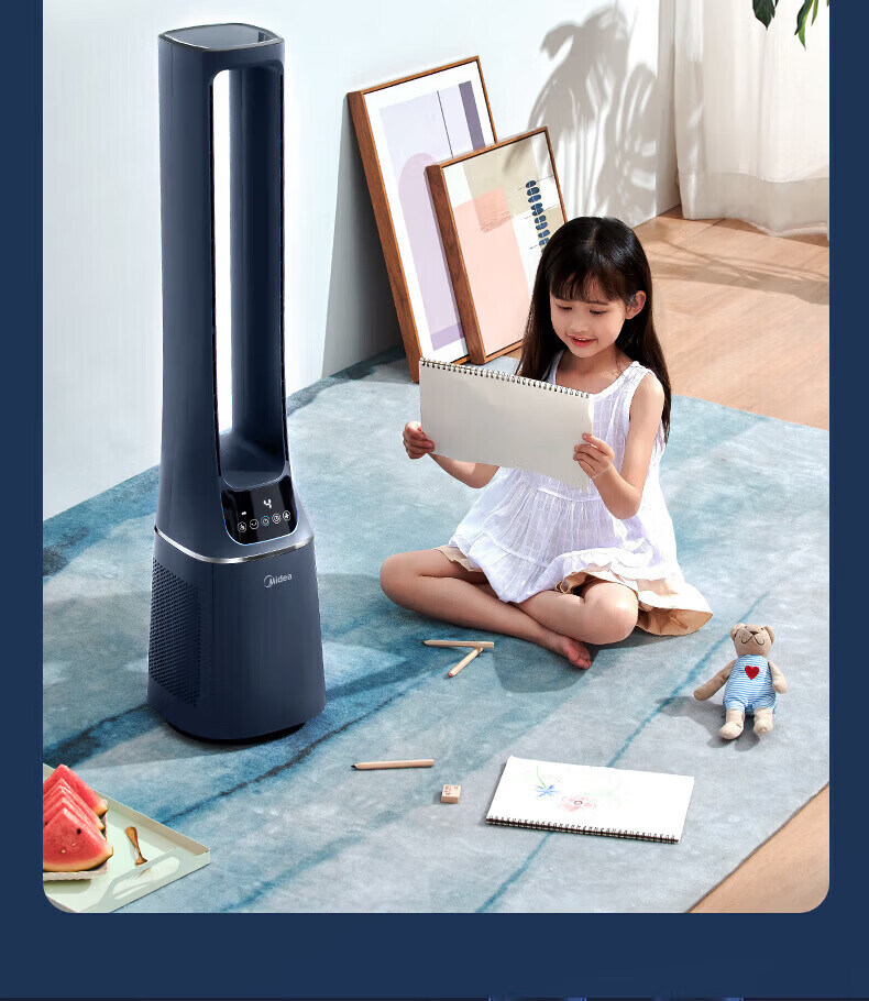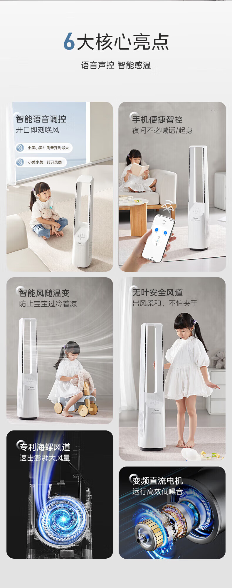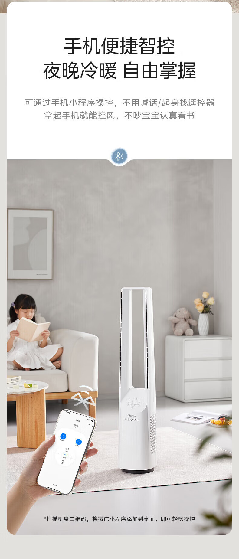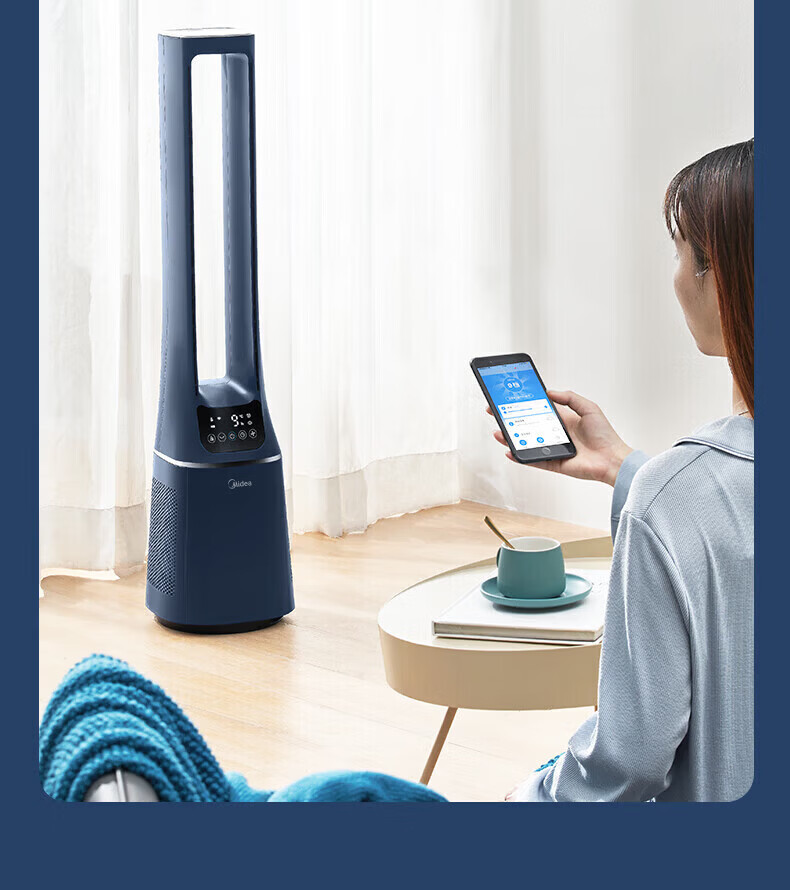 美的(Midea)无叶风扇家用电风扇智能落地扇卧室办公室轻音风随温变定时立式落地塔扇家电一体机APP遥控智控 【白色语音遥控款】7h定时 风随温变