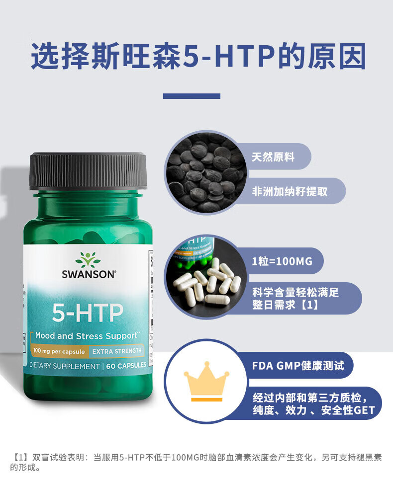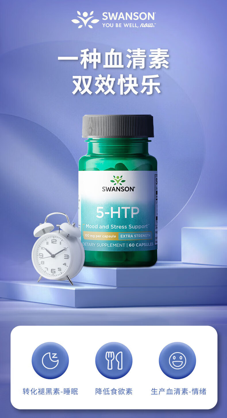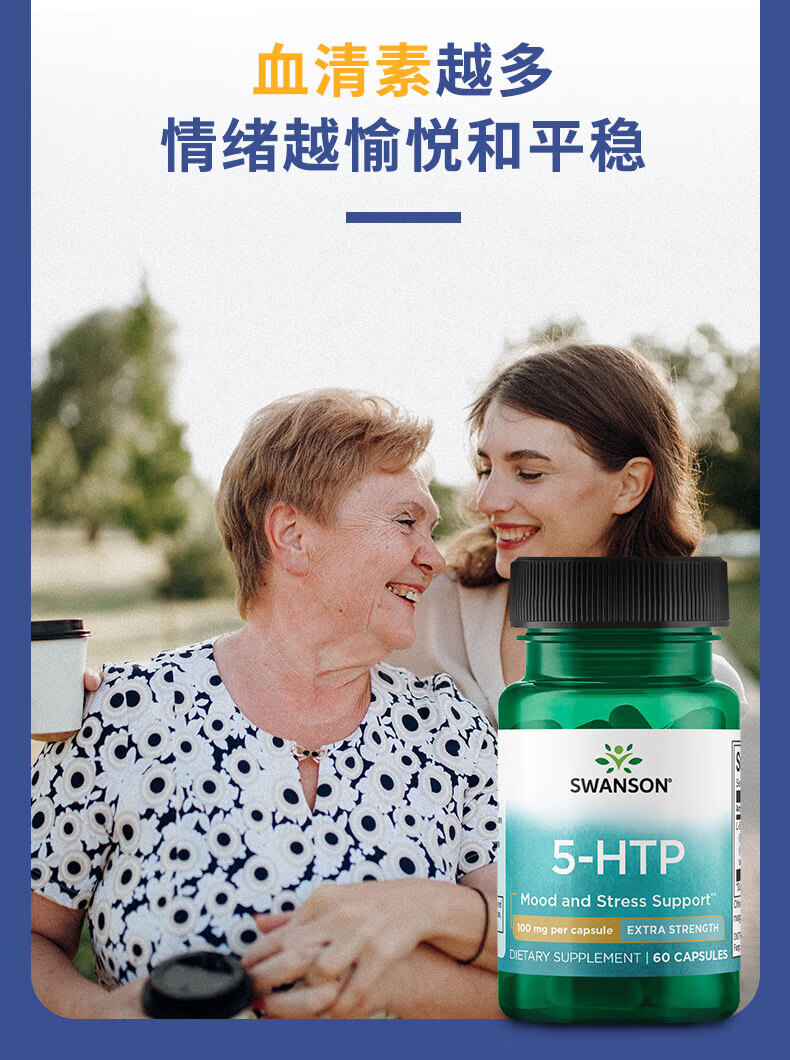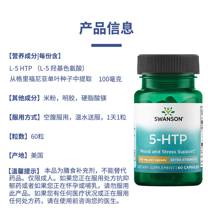 斯旺森(SWANSON)L-5htp羟基色氨酸100mg血清素60粒改善睡眠平静舒缓情绪 缓解焦虑 【强效型稳心绪】血清素5-HTP 60粒*1瓶
