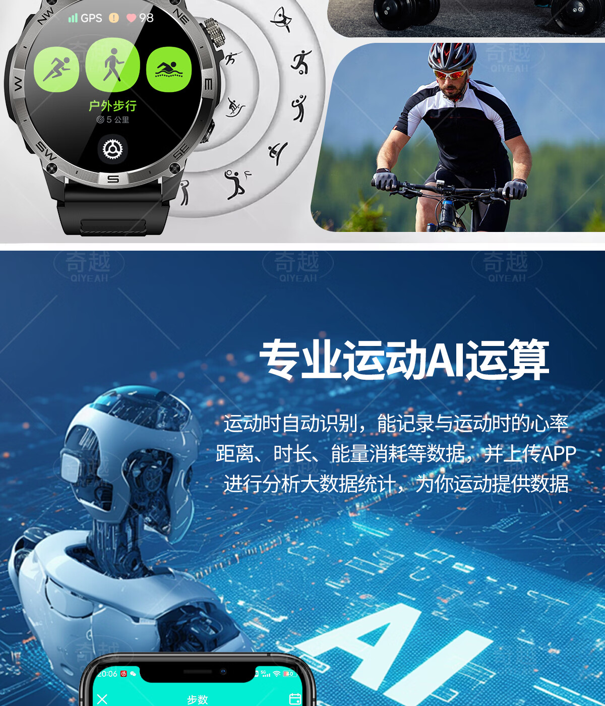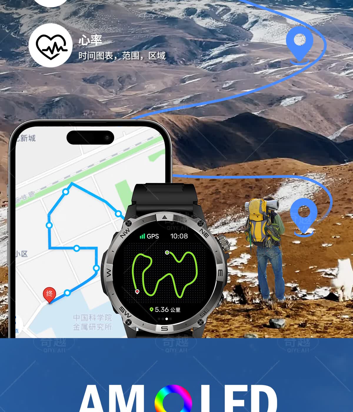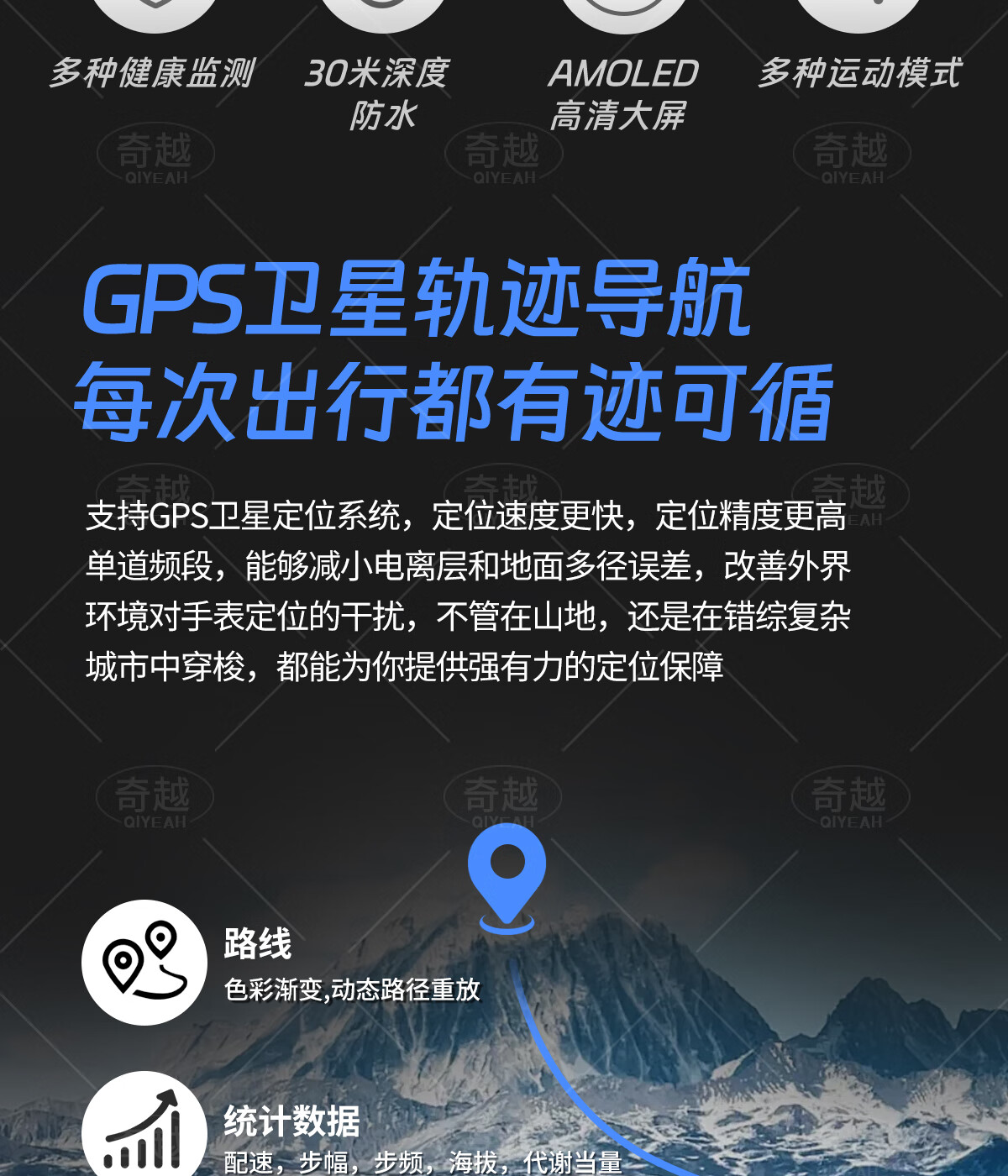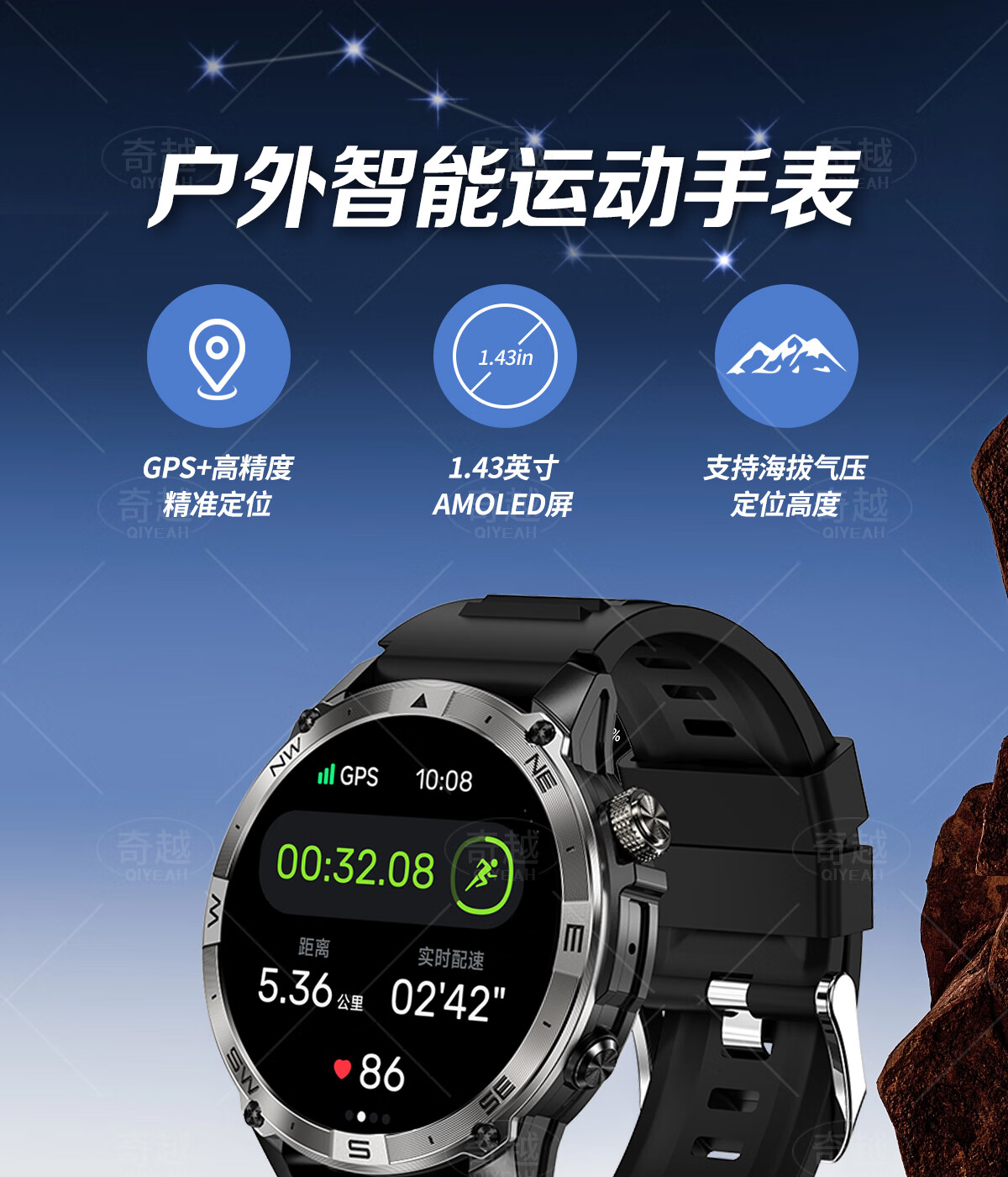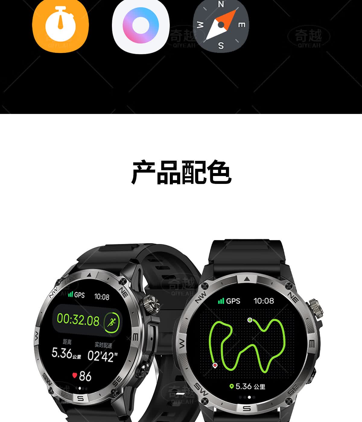 QIYEAH奇越运动手表智能跑步心率监测血氧睡眠GPS定位轨迹蓝牙接打电话离线支付防水消息提醒穿戴手环 运动款 GPS定位运动轨迹