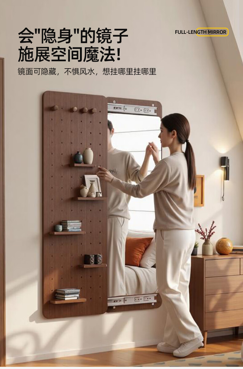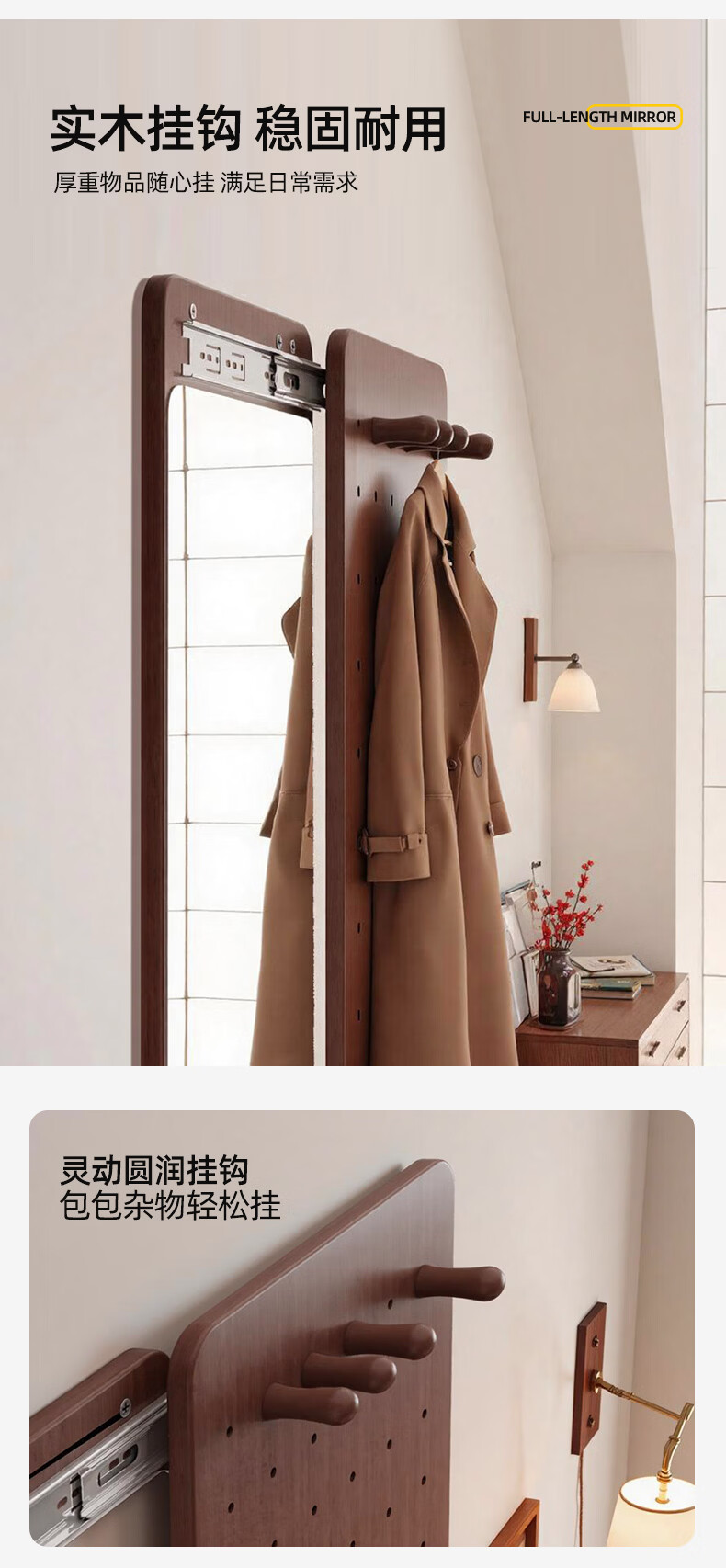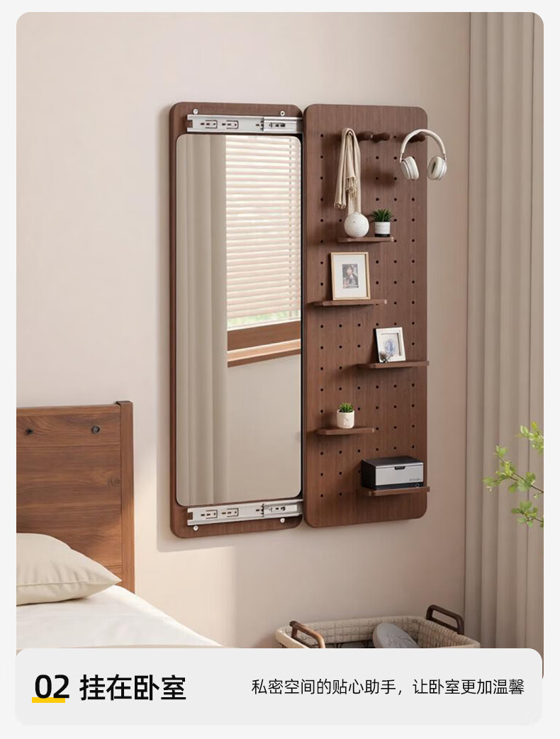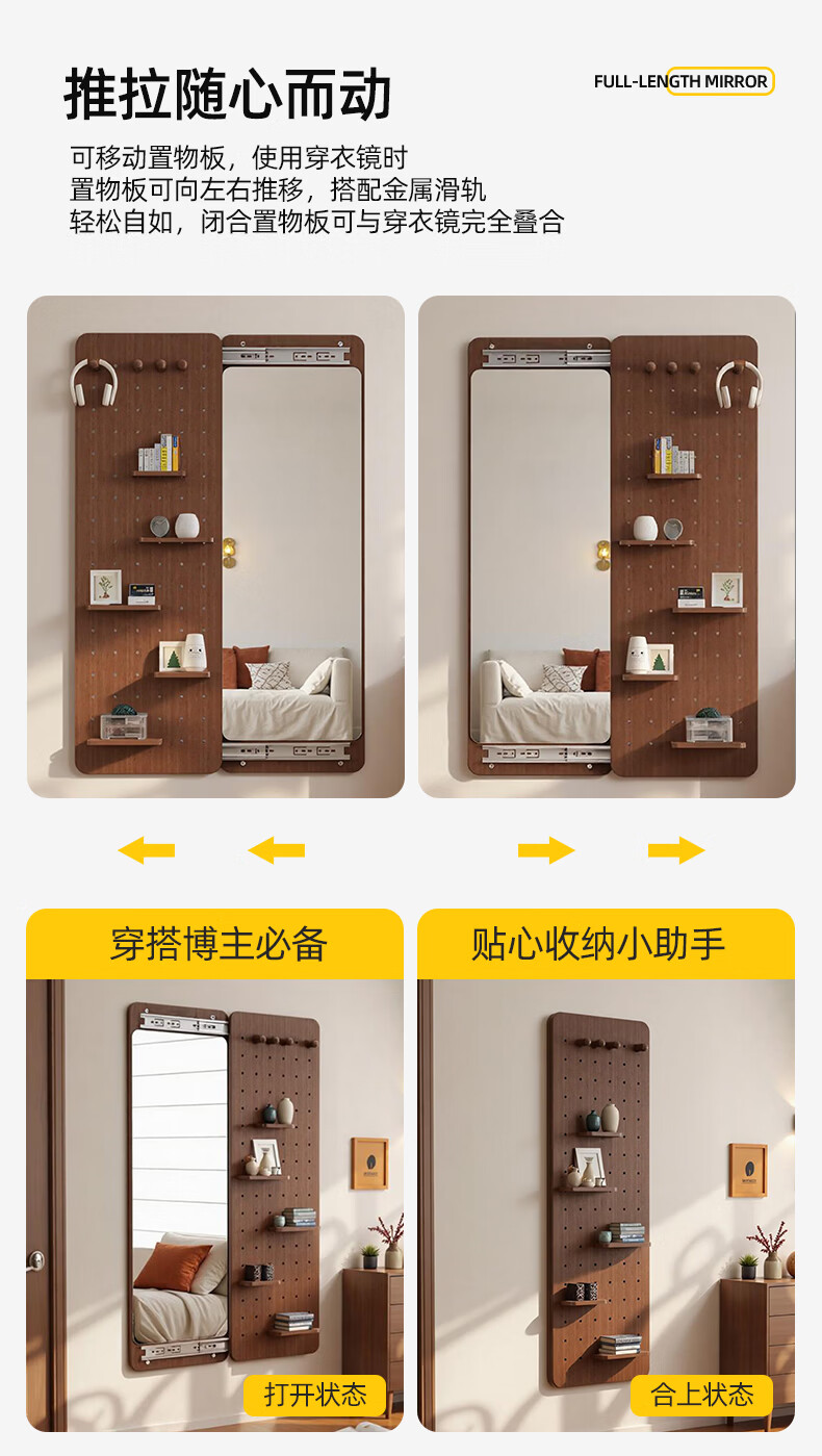 诗元实木洞洞板穿衣镜一体隐形推拉可关闭隐藏入户门口装饰玄关全身镜 【实木-橡胶木】胡桃色-高150cm宽30cm
