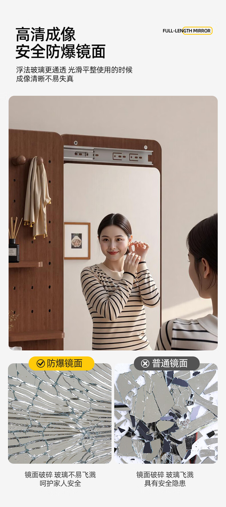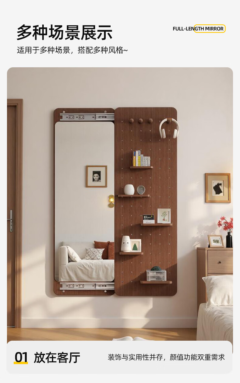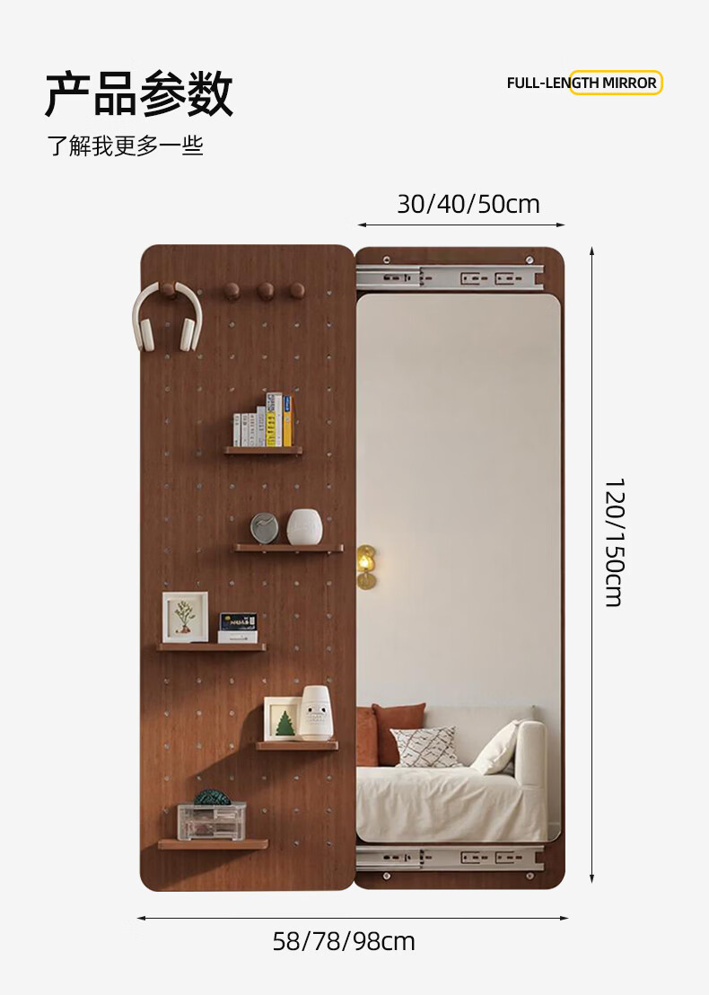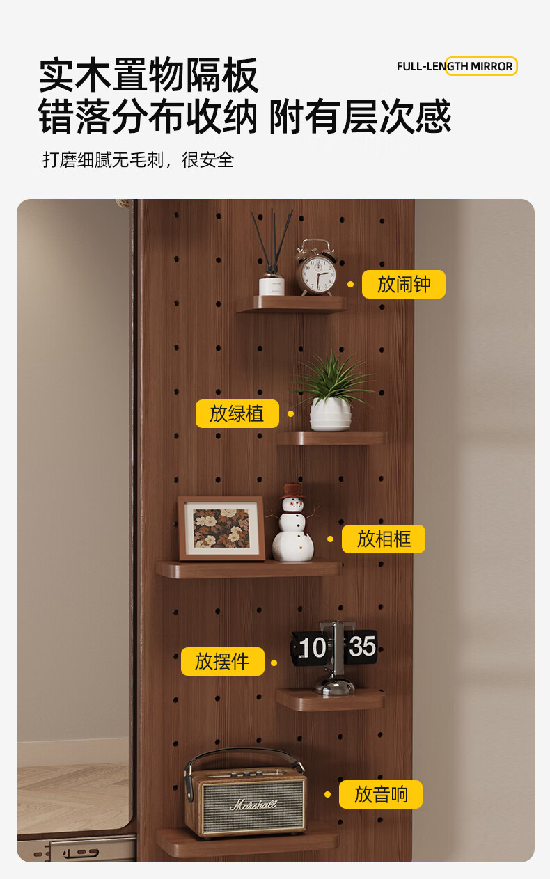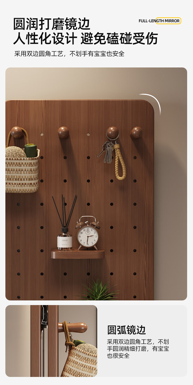 诗元实木洞洞板穿衣镜一体隐形推拉可关闭隐藏入户门口装饰玄关全身镜 【实木-橡胶木】胡桃色-高150cm宽30cm