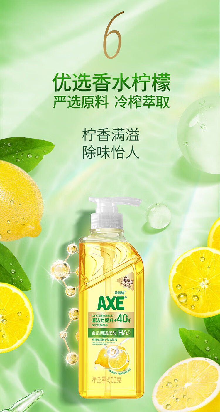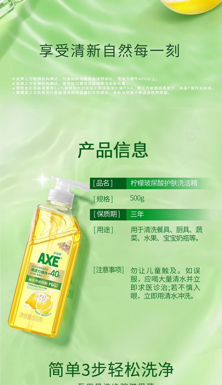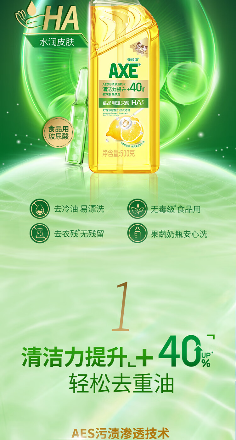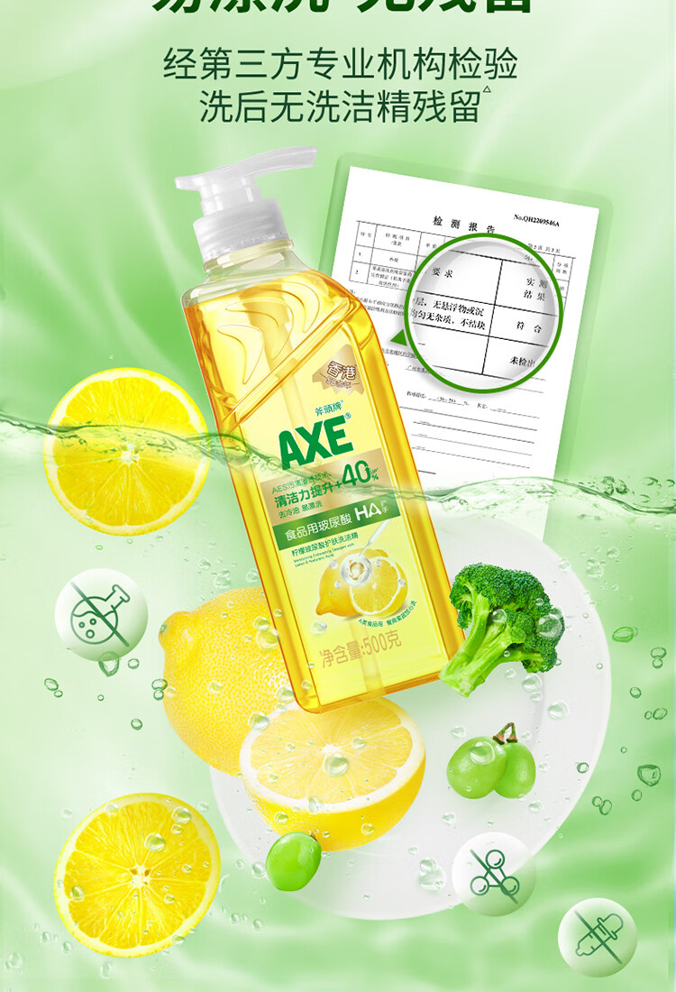 AXE斧头牌柠檬玻尿酸护肤洗洁精500g泵果蔬安心洗清洁力+40%