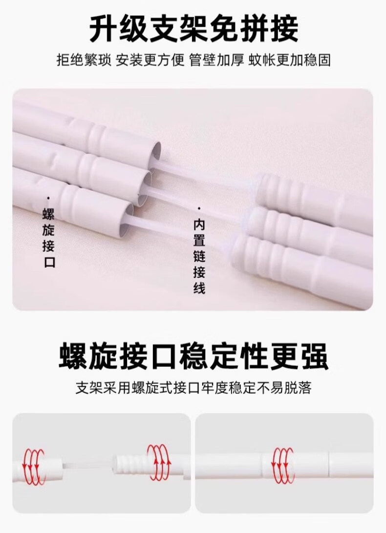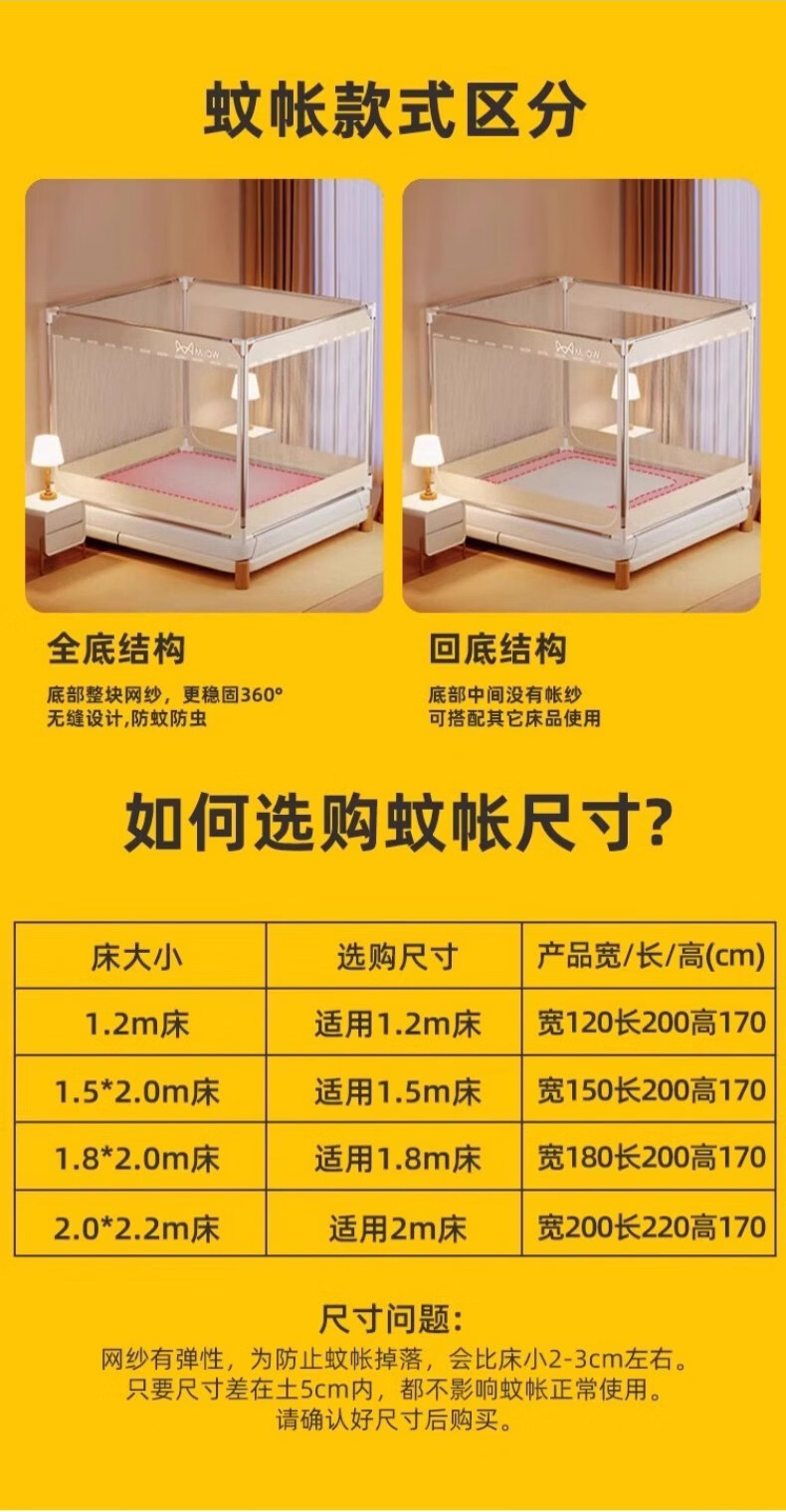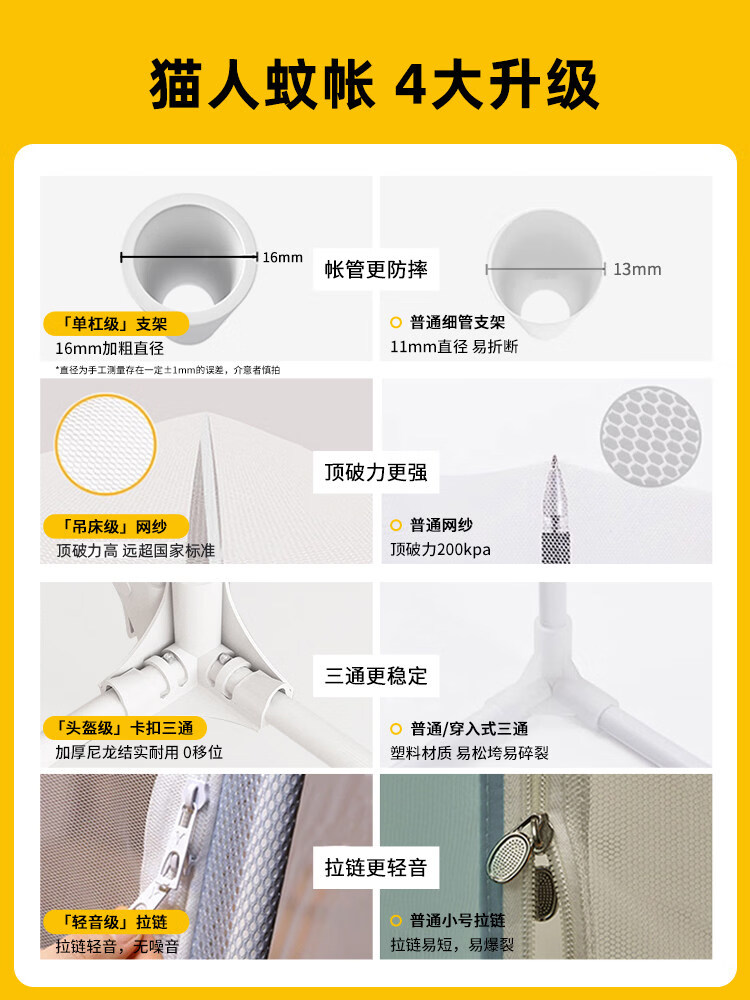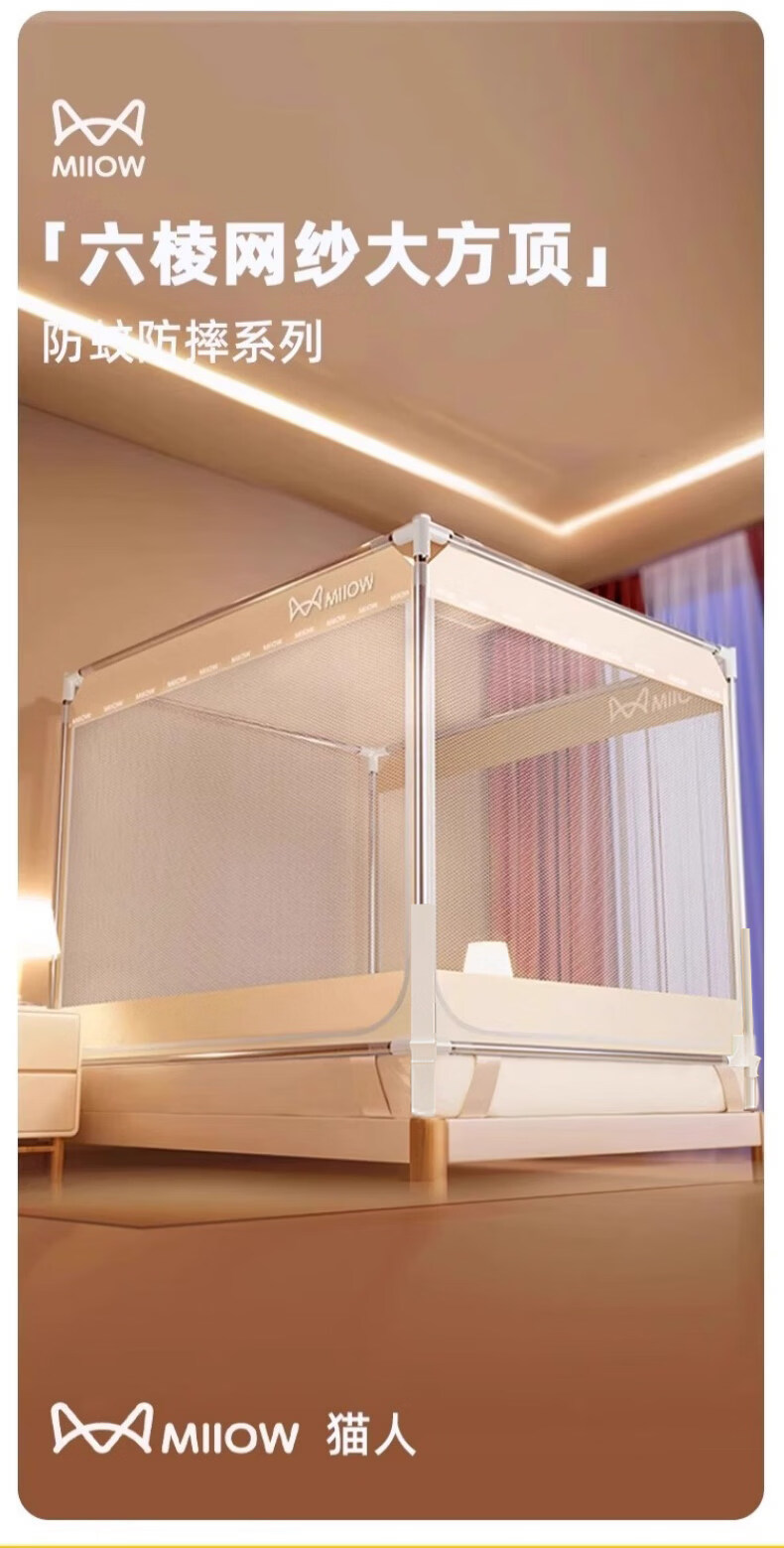 猫人(MiiOW)婴儿防摔蚊帐1.8x2米家用一体式免安装全包床围栏1.5米带支架纹帐 【MIIOW米黄】A类全底帐纱加粗防摔支架 适用1.8m床-180x200x170cm【加粗免安装支架】