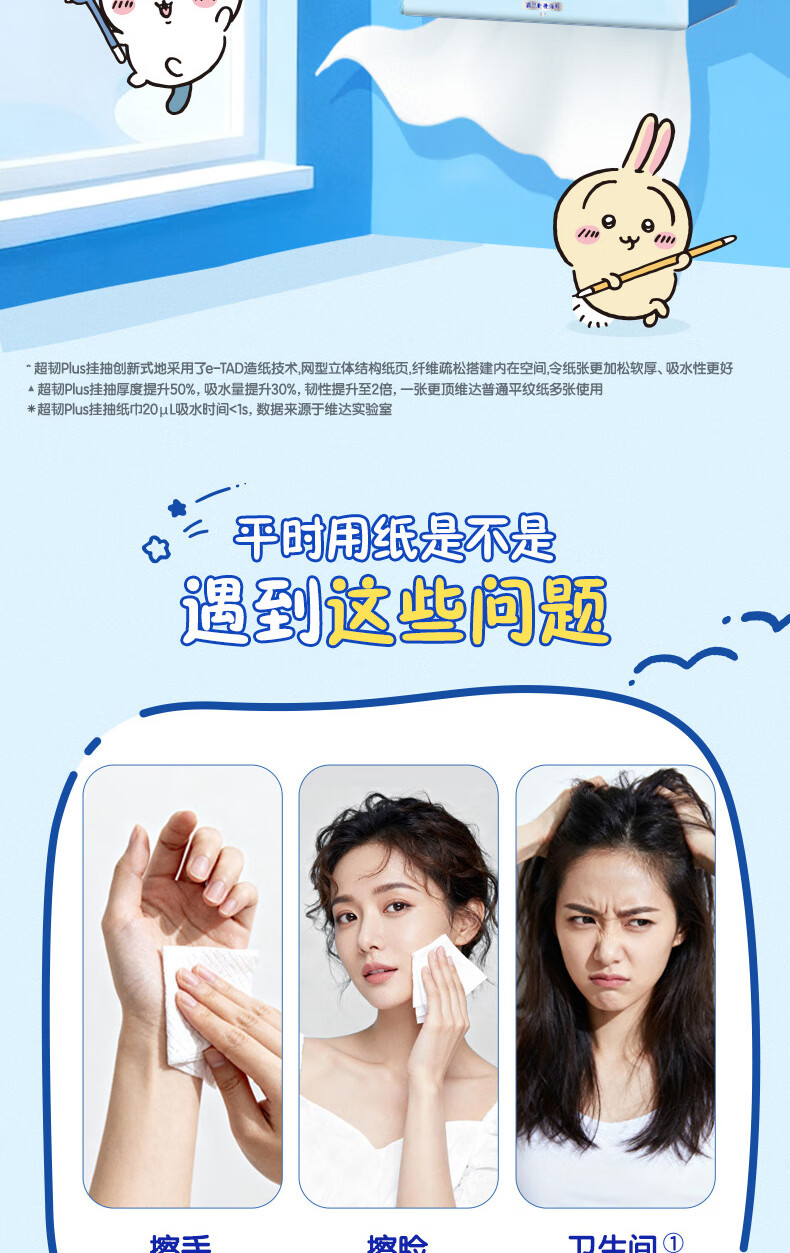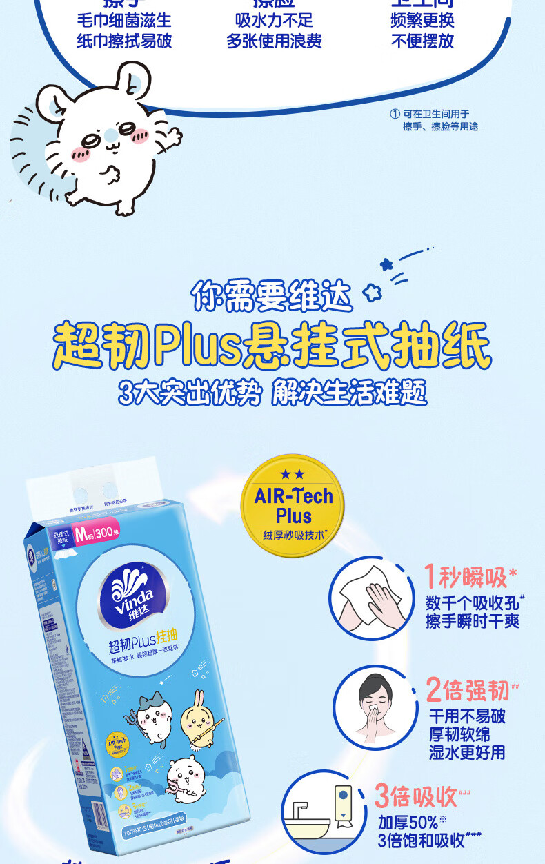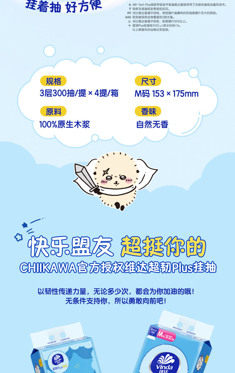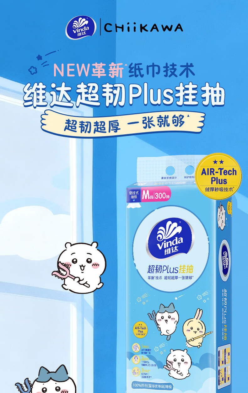维达(Vinda)|CHIIKAWA 抽纸 超韧Plus挂抽3层300抽*4提M码 悬挂式纸巾 整箱