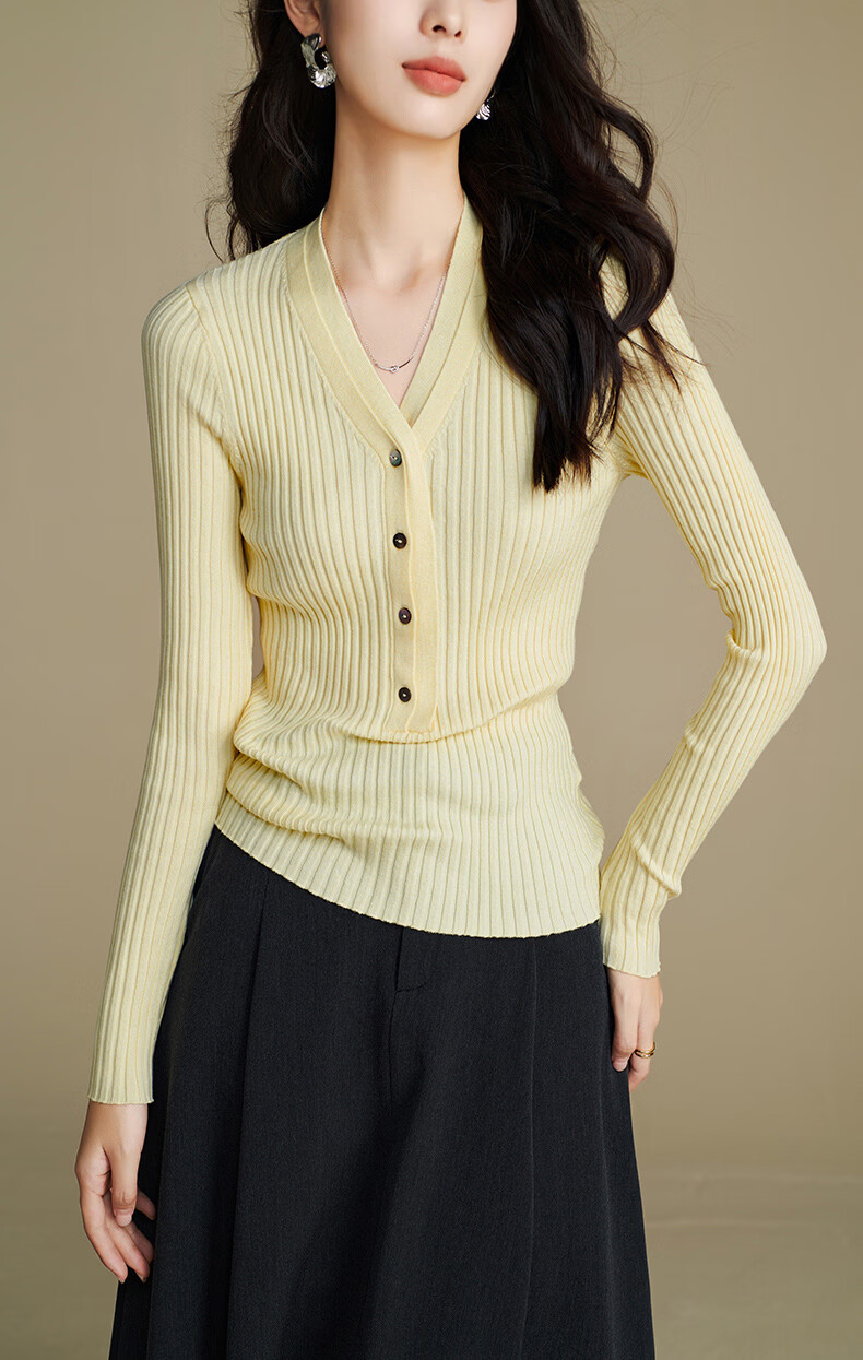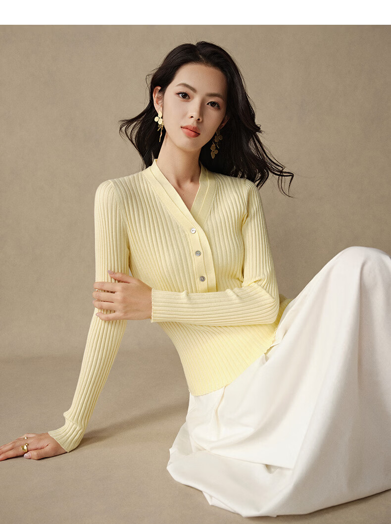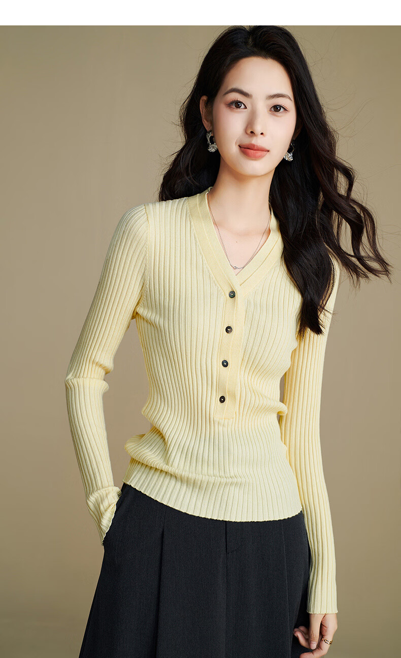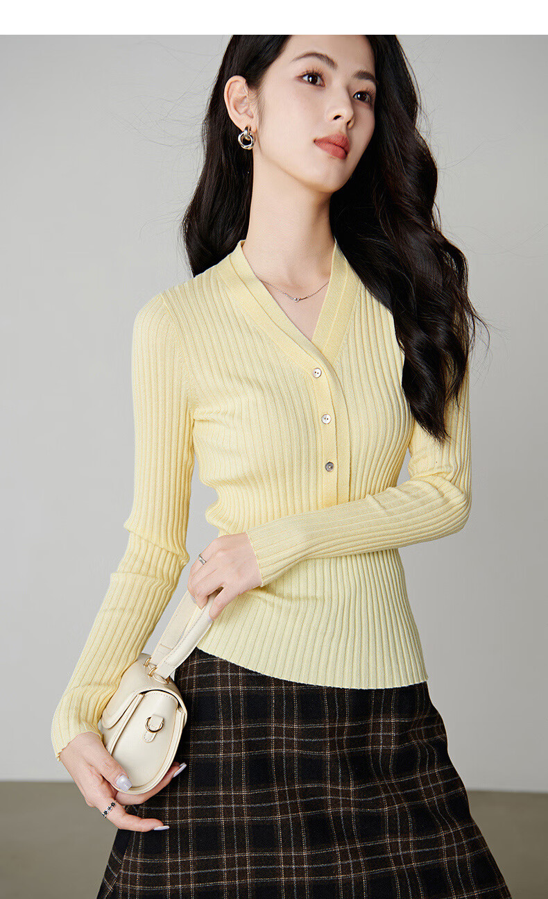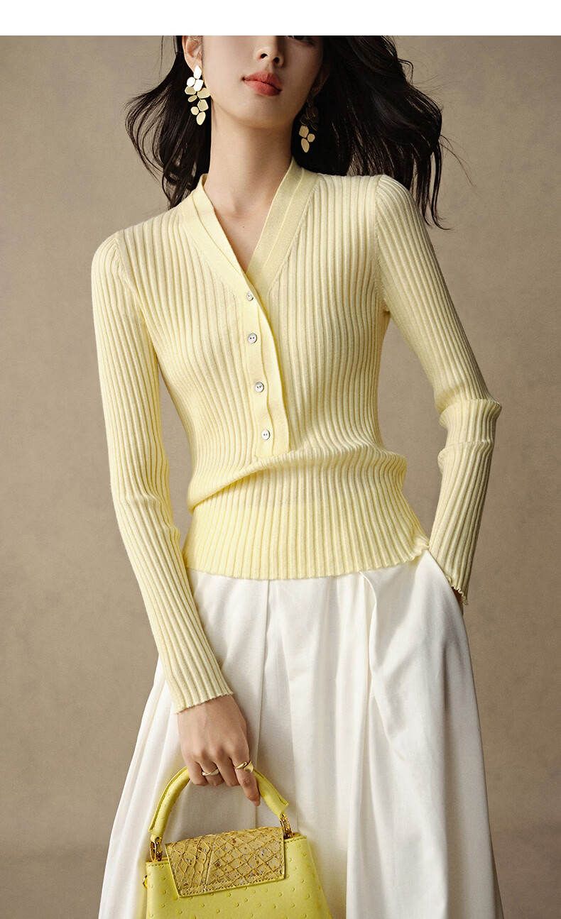 晚白【新品】2026年春款时尚V领毛衣含羊毛高弹修身亲肤百搭针织衫女 黄色 M