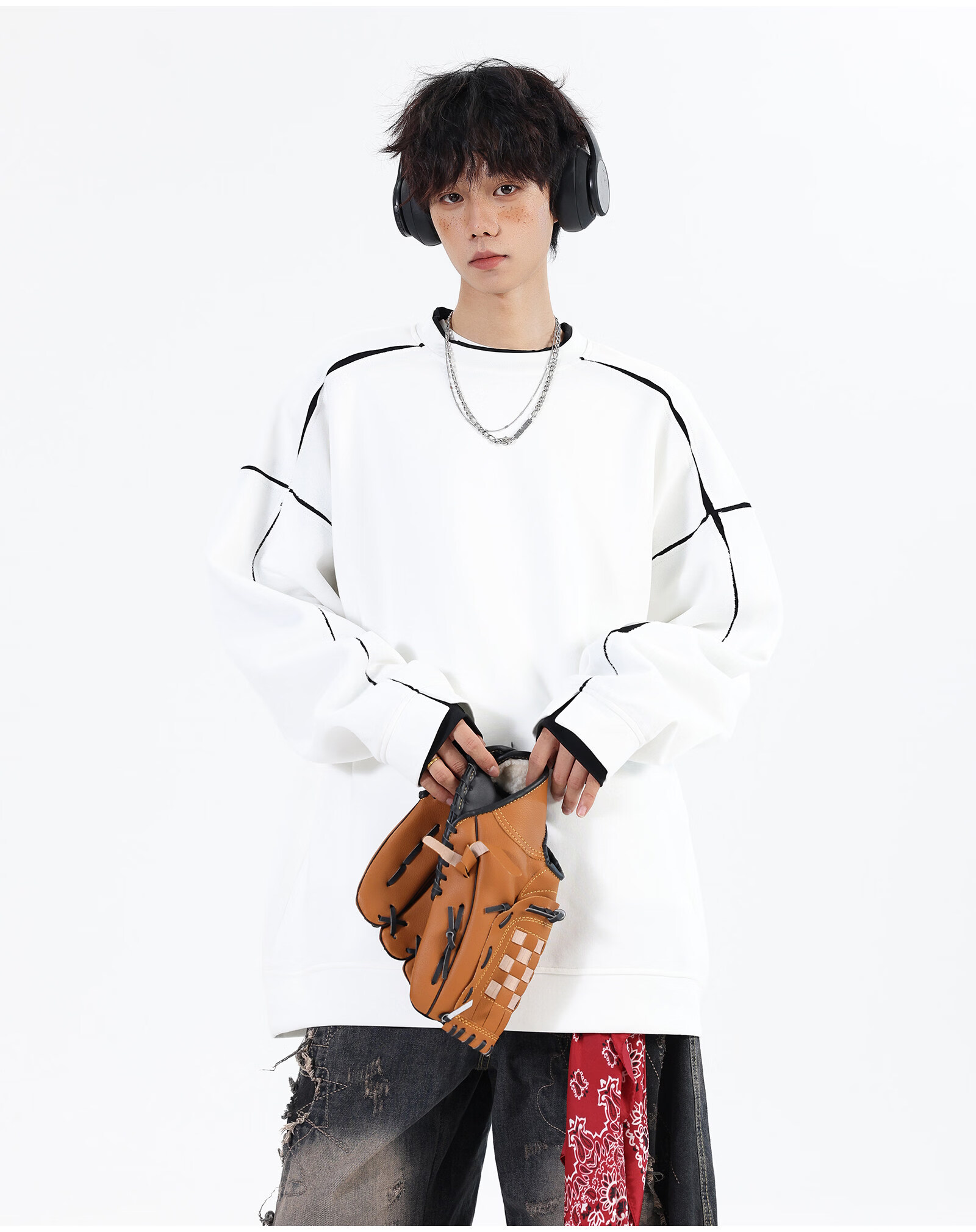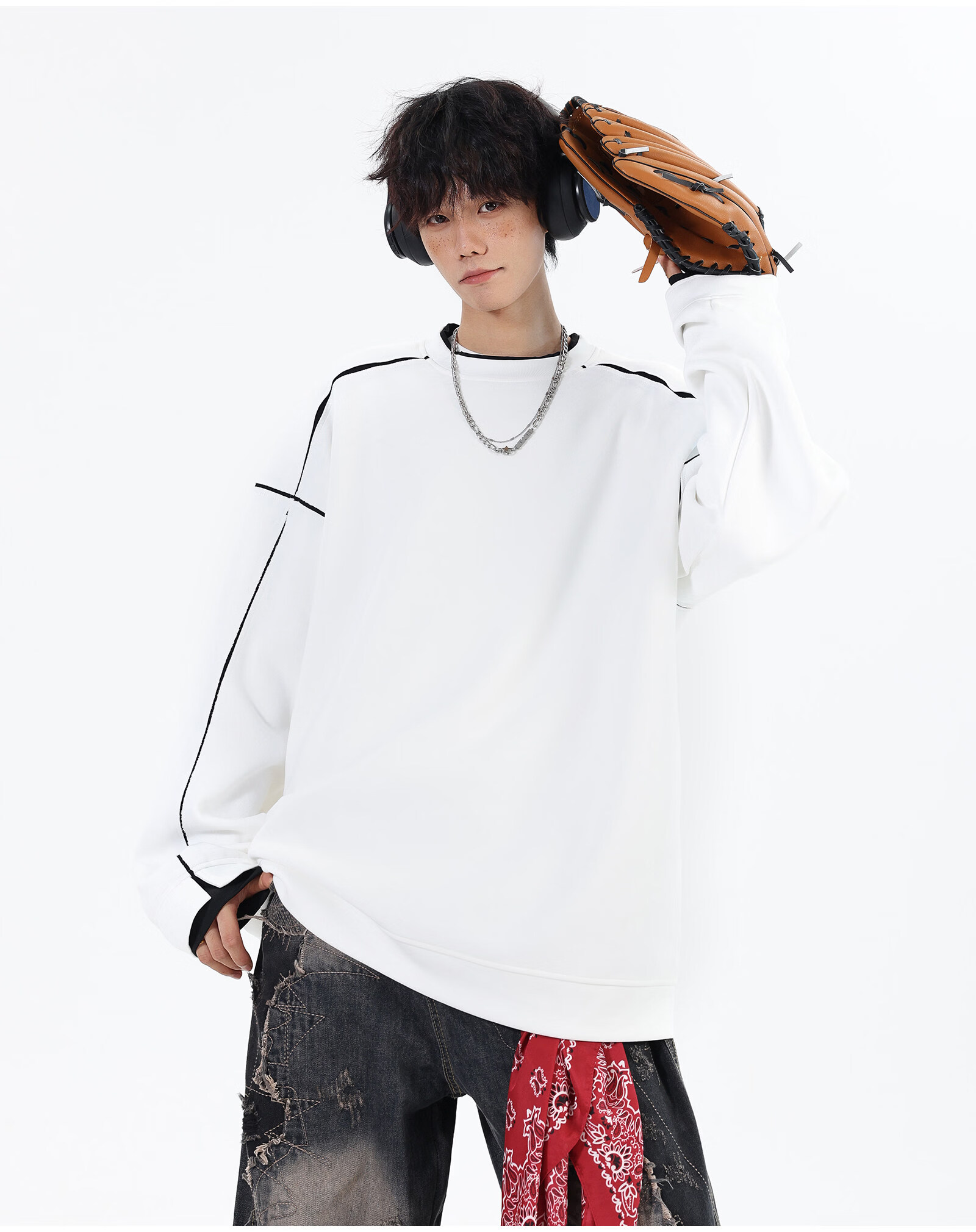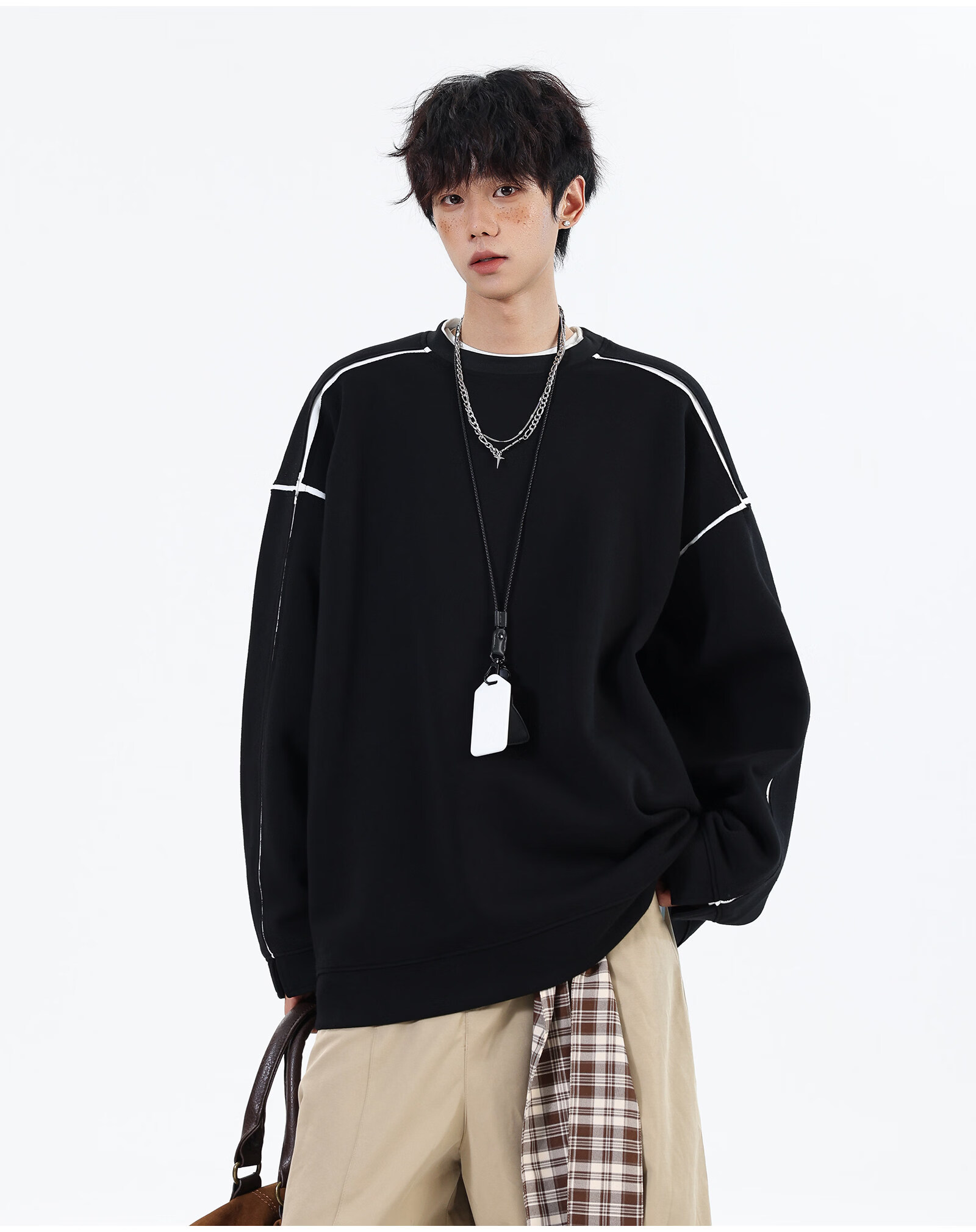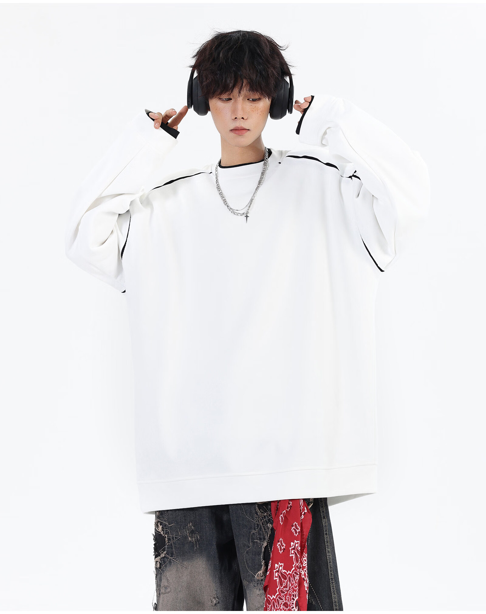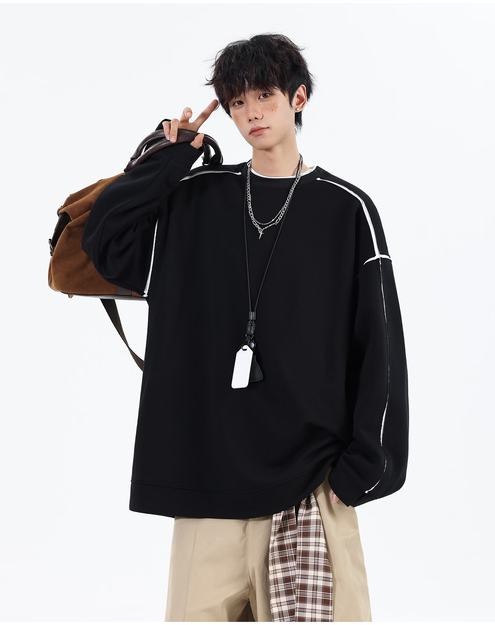 NEW OR MODE假两件切割设计圆领卫衣男春季新款美式潮流痞帅宽松大码上衣外套 黑色【高品质】 M 【建议90-110斤】