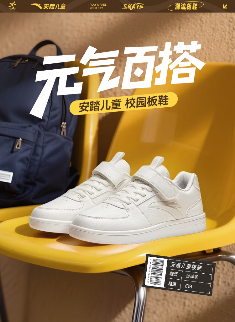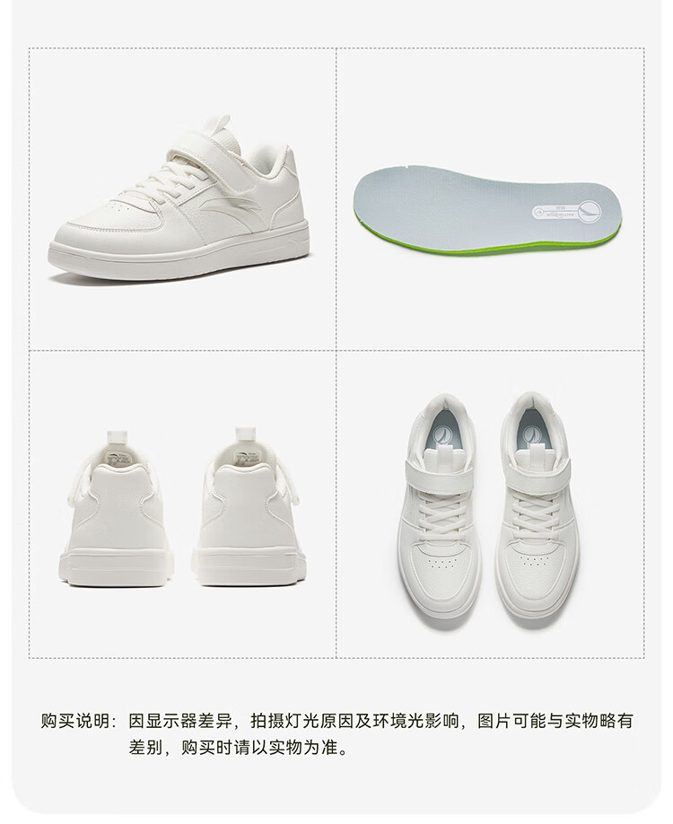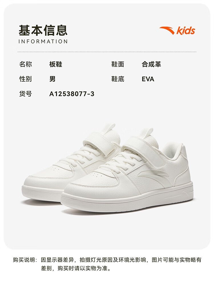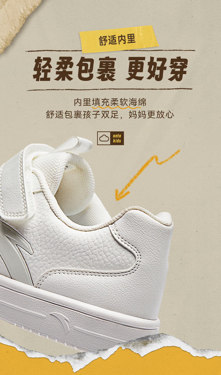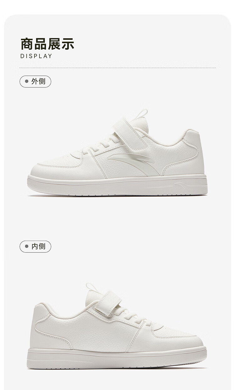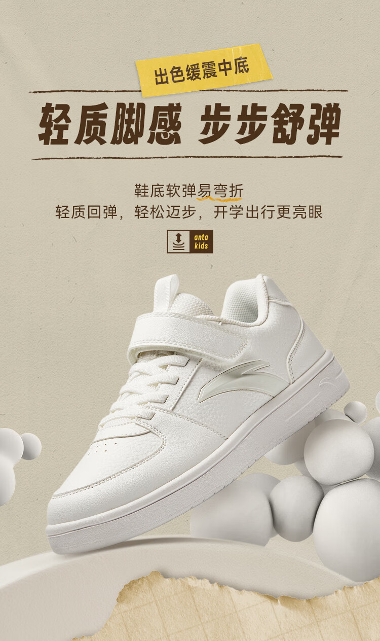 安踏儿童运动鞋男女大童鞋2026春季新款元气百搭魔术贴小白鞋校园板鞋 纸莎白-3 33 鞋内长20.5cm