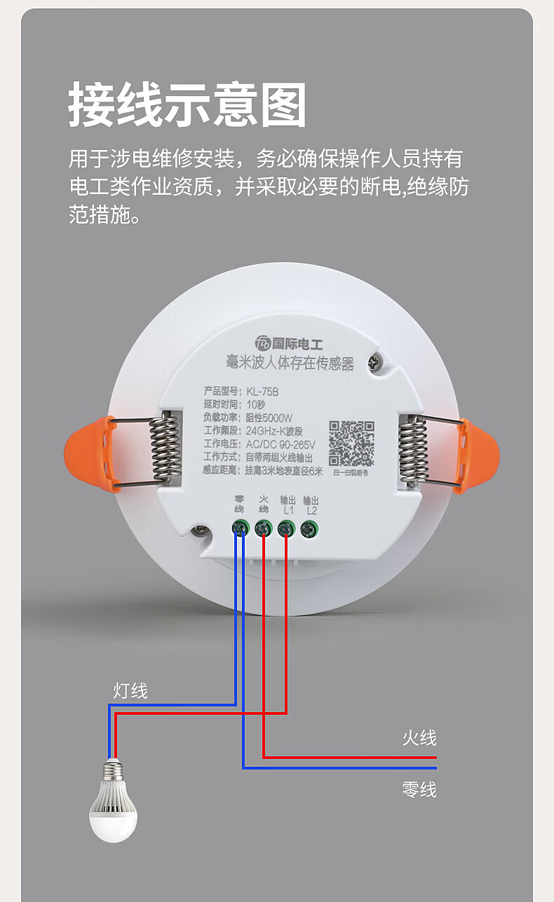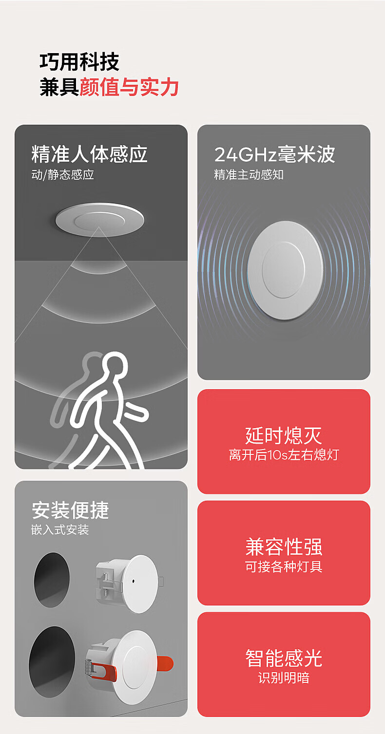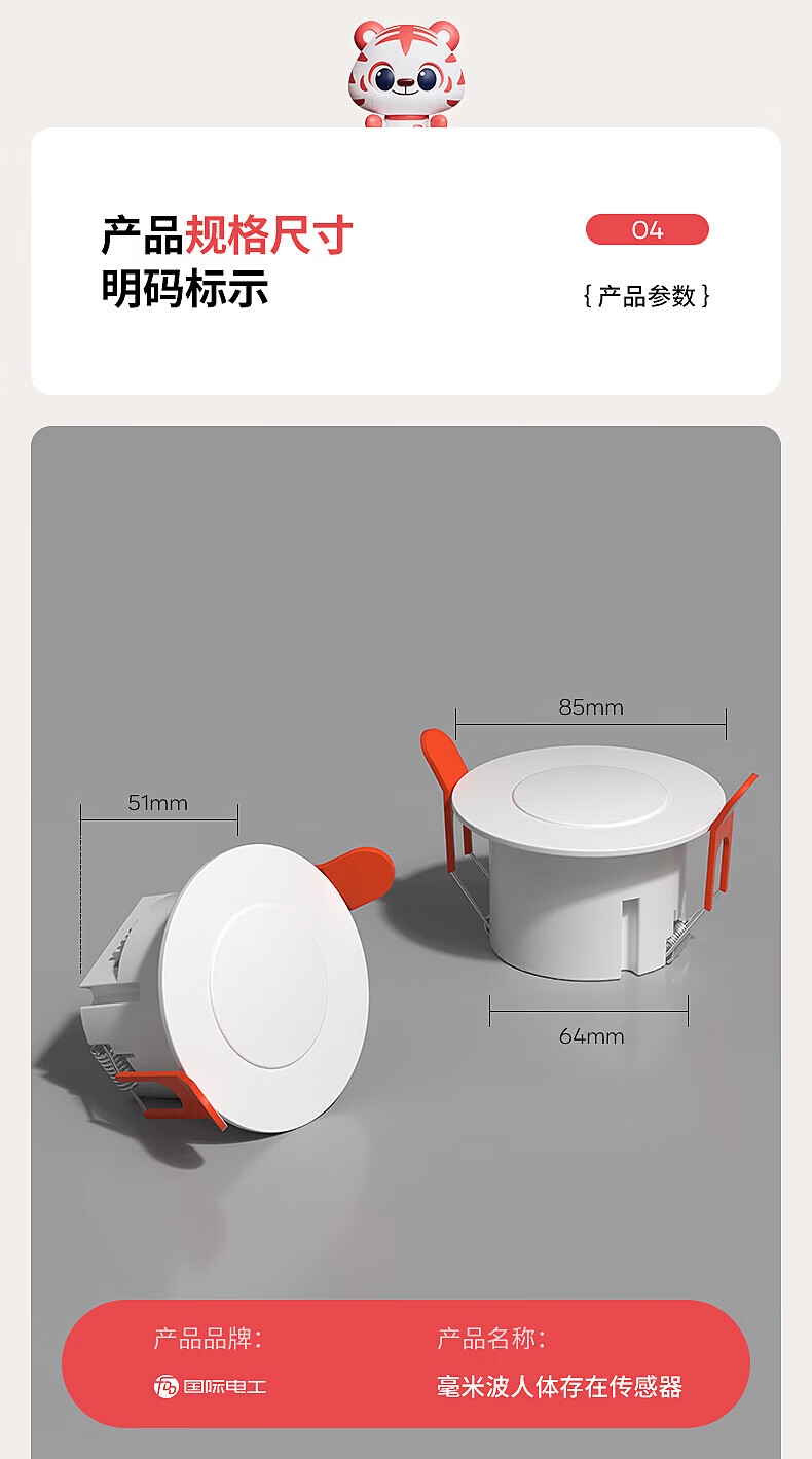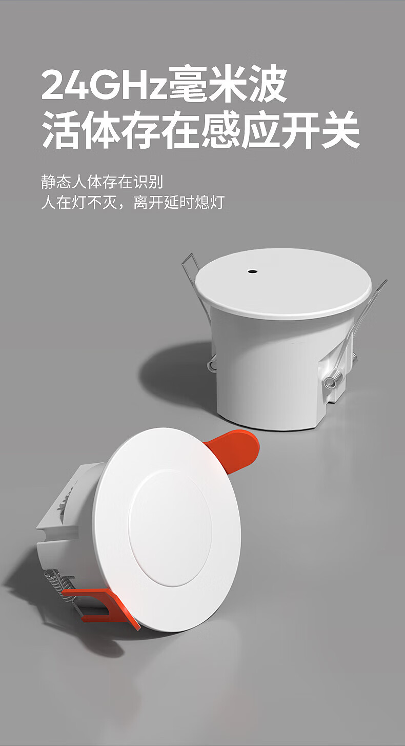 国际电工人体存在感应器办公家用24G毫米波吸顶嵌入传感器人在灯不灭开关 开孔【50-55mm】 16A人体存在感应器(带光敏)