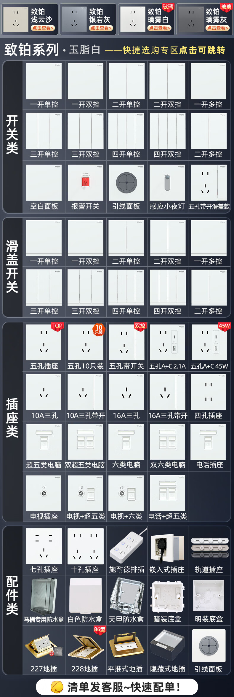 施耐德开关插座面板 家用86型 二三五孔墙壁电源插座 致铂系列玉脂白色 单开单控(滑盖式)
