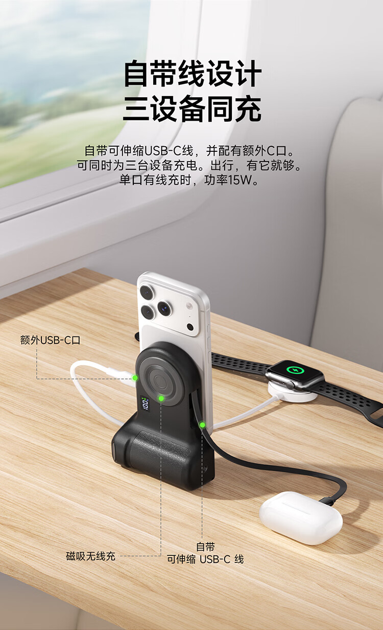 用维(AWEI)充电宝35W快充自带线三合一Qi2磁吸magsafe支架超薄式移动电源适用苹果【国家3C认证可上飞机】 【银灰色】Qi2磁吸丨35W快充丨自带支架 10000mAh