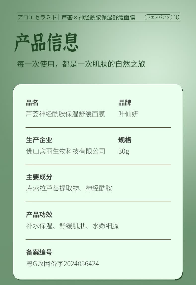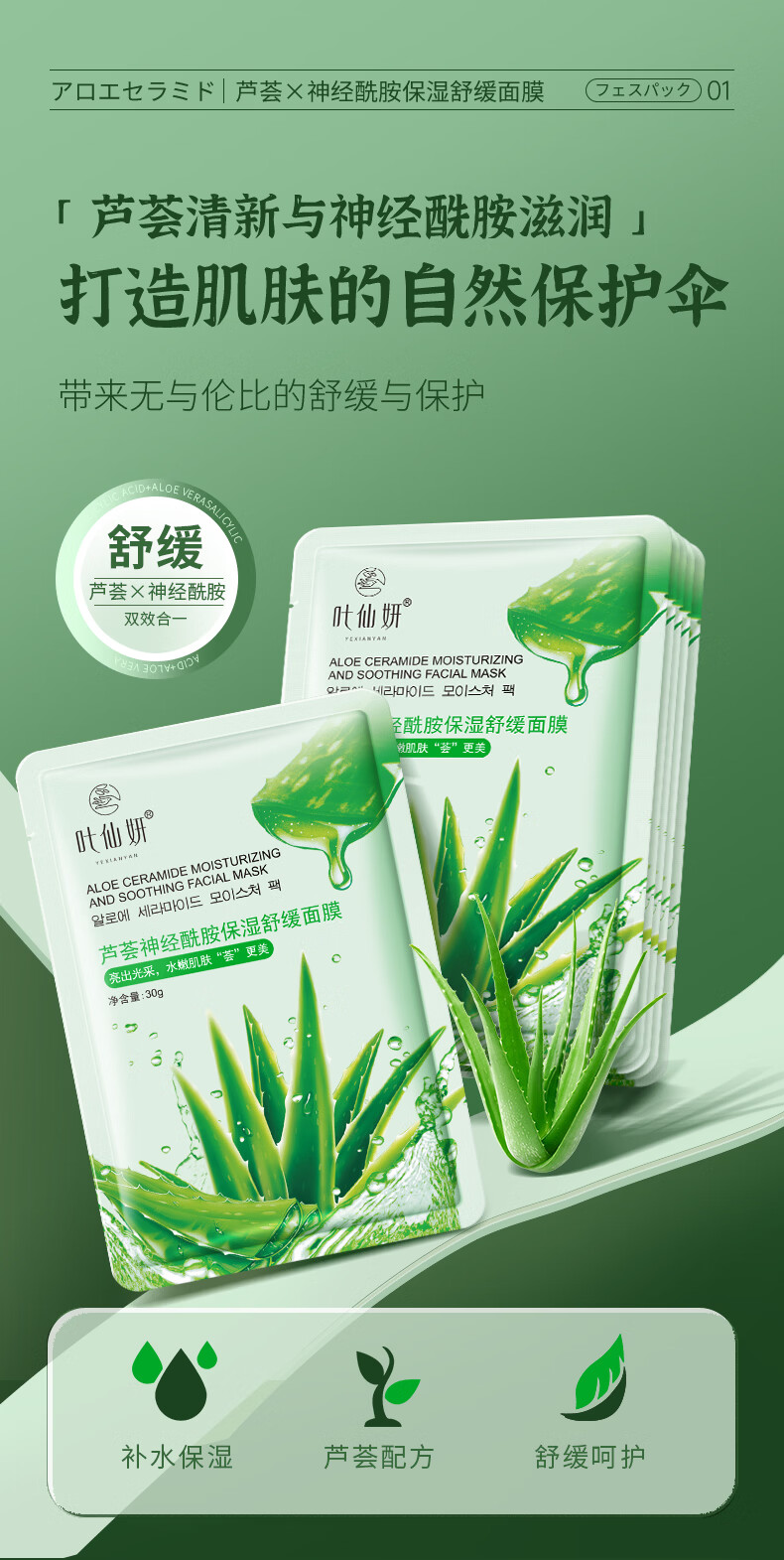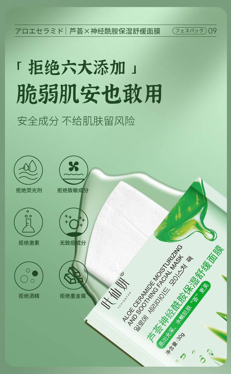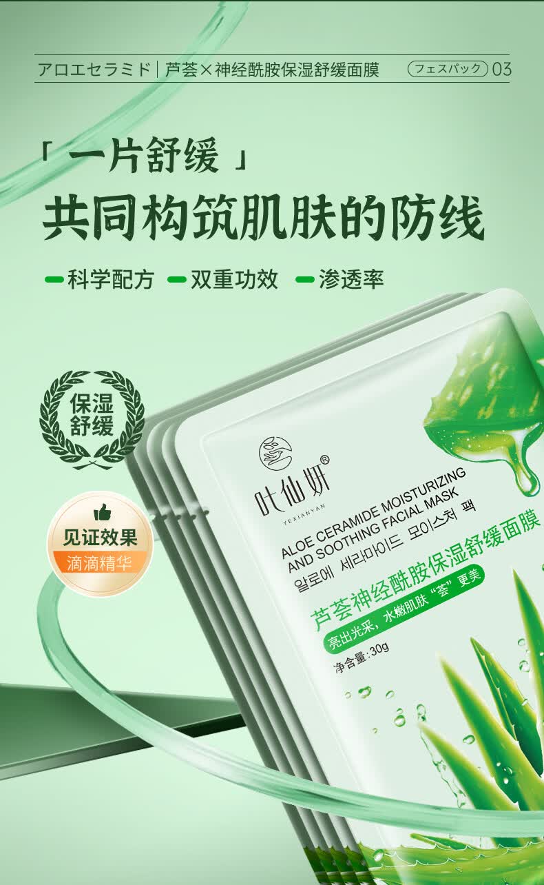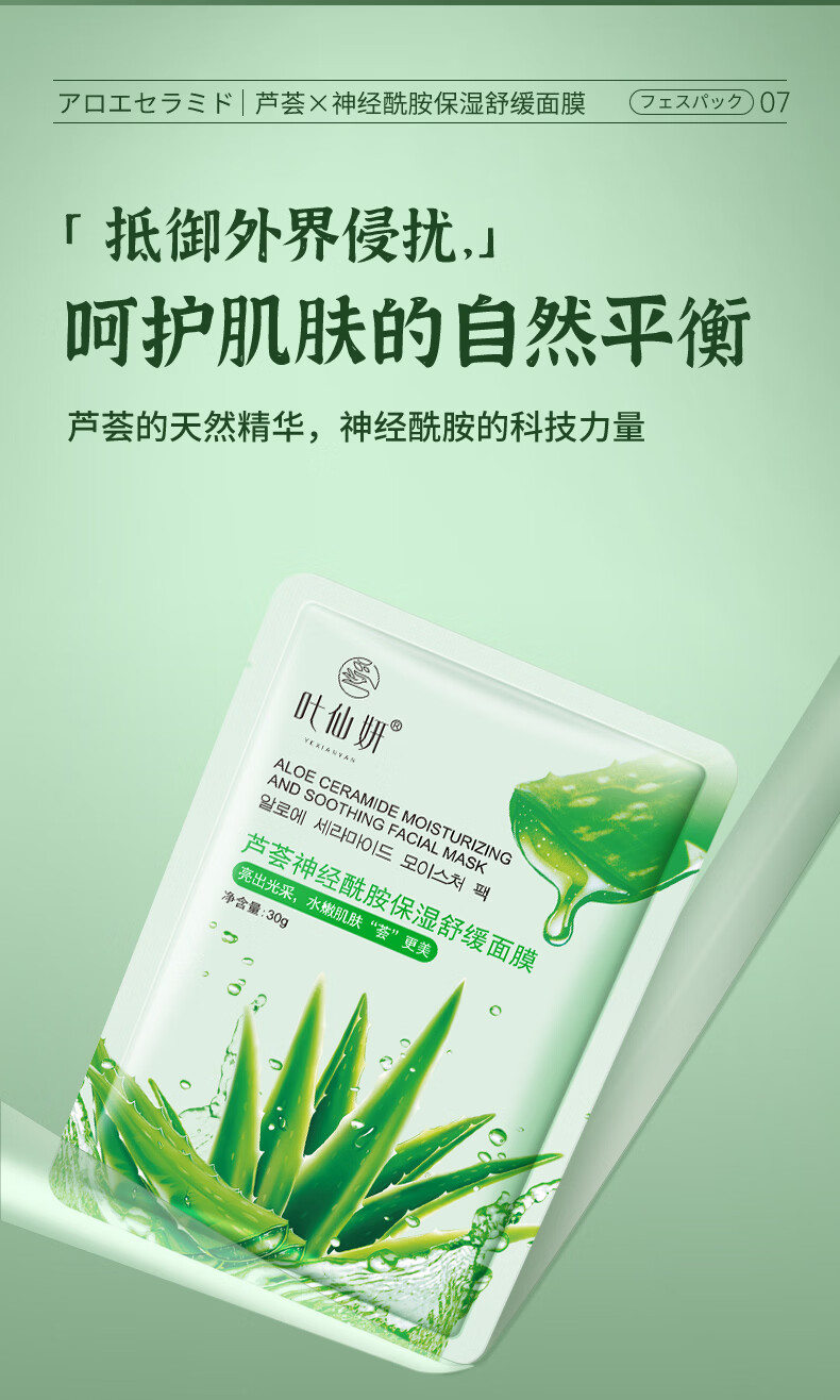 叶仙妍面膜芦荟神经酰胺保湿舒缓肌肤30g片装保湿润泽面膜 30g*5片