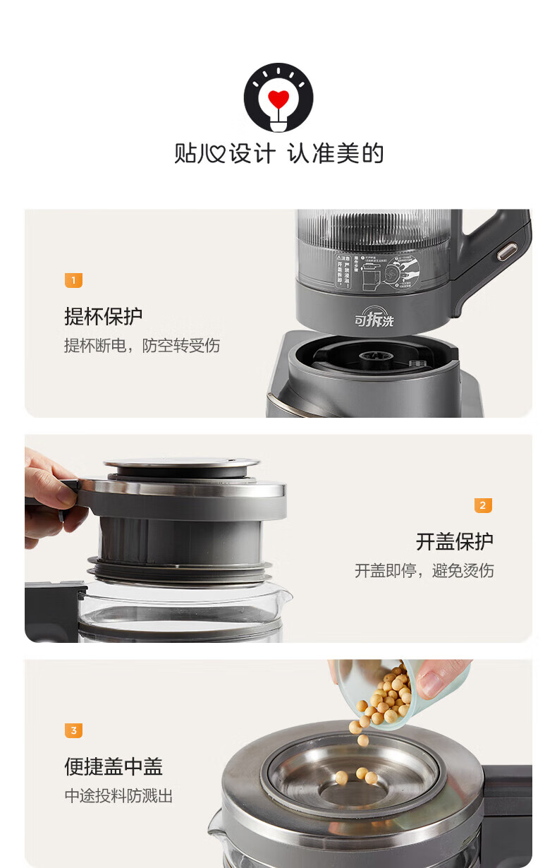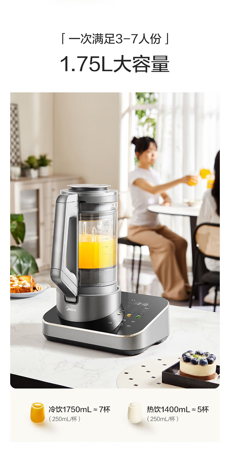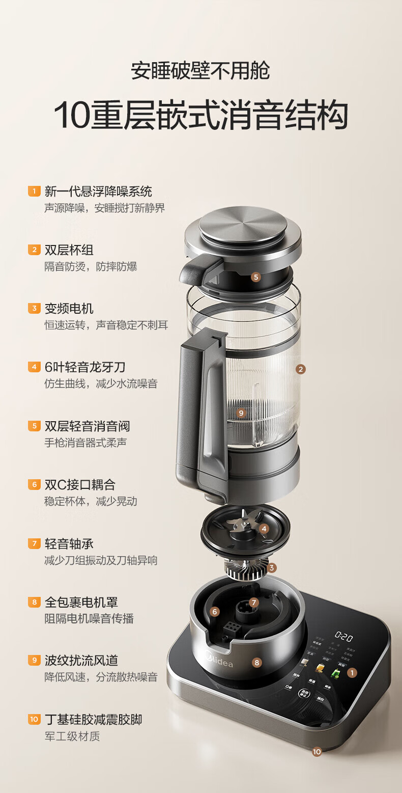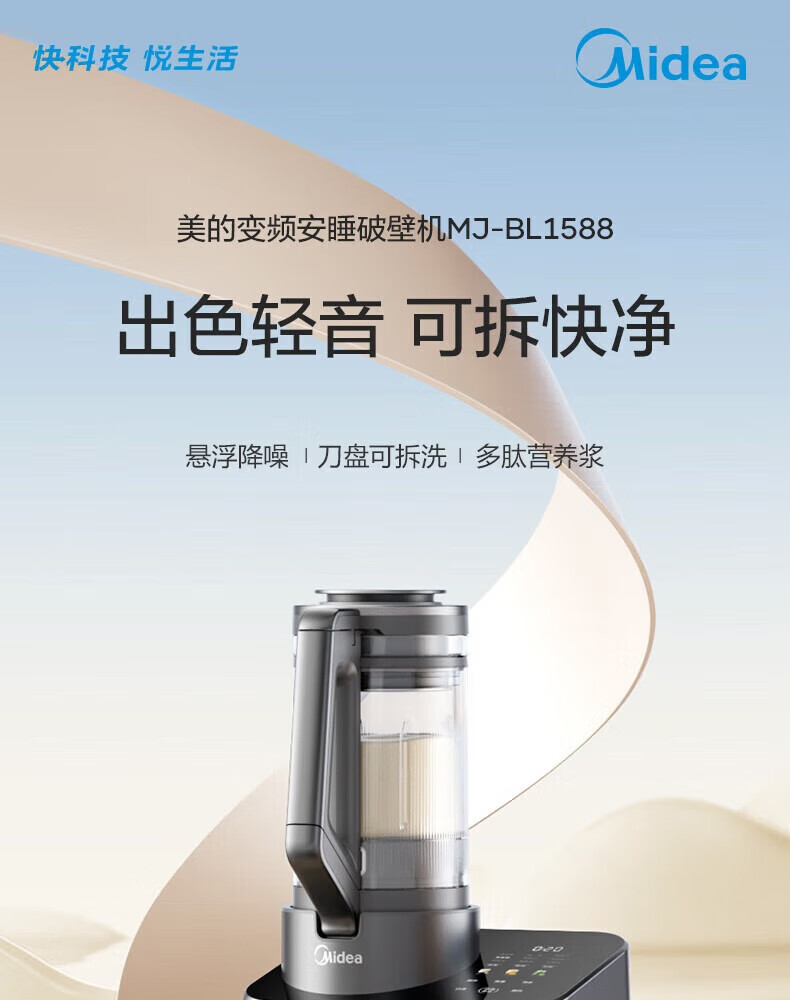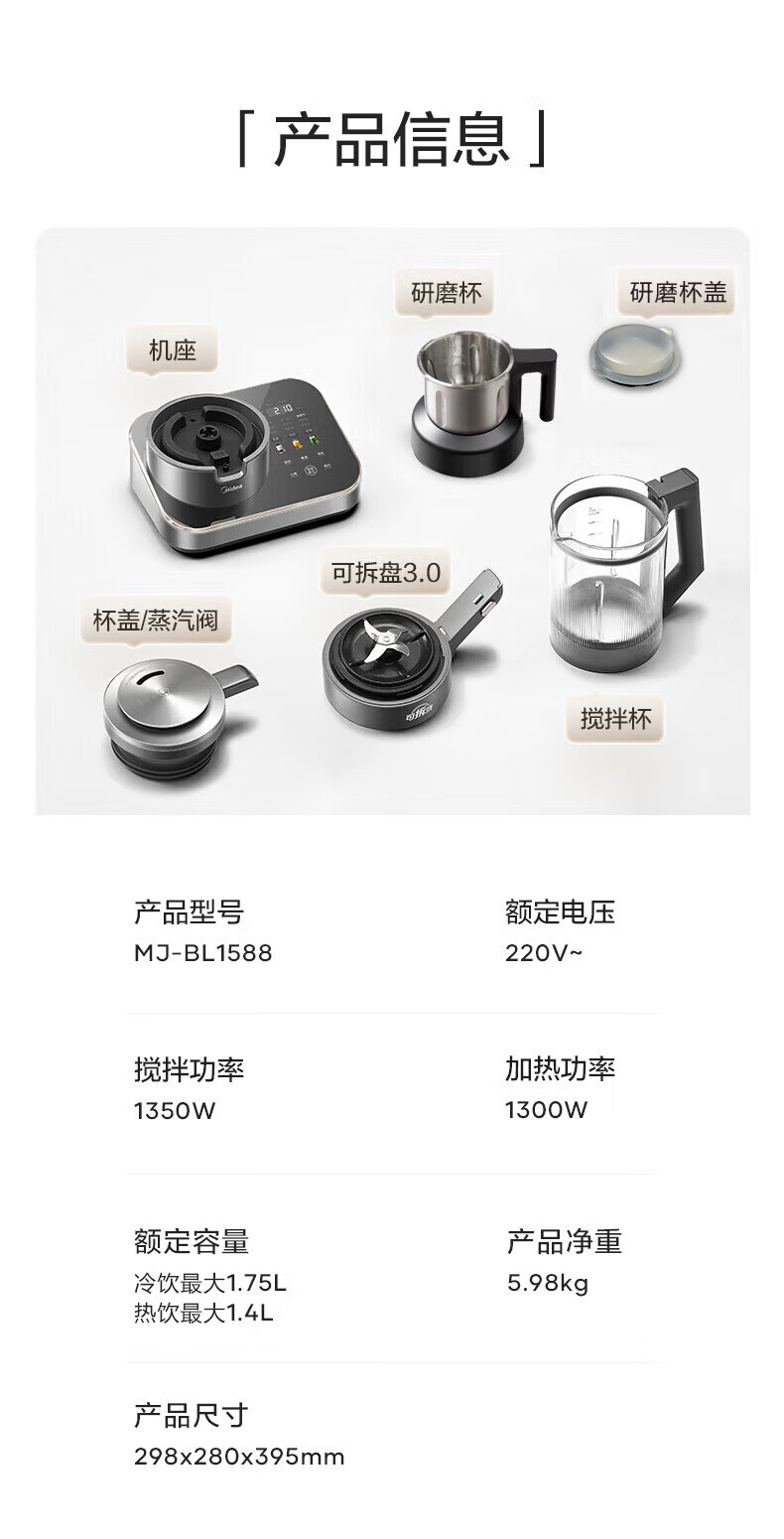 美的(Midea)安睡破壁机 低音悬浮降噪 可拆洗加热早餐机辅食机 1.75L大容量家用破壁豆浆机 BL1588【变频悬浮降噪-可搭配研磨杯】