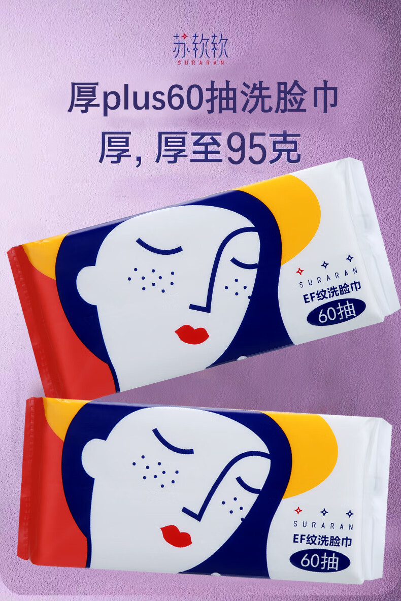苏软软加厚加大洗脸巾一次性擦脸洁面洗面巾抽取式面巾纸厚Plus 厚Plus60抽*3包(95g超厚EF纹)