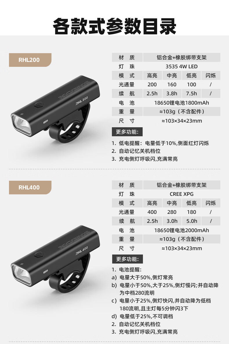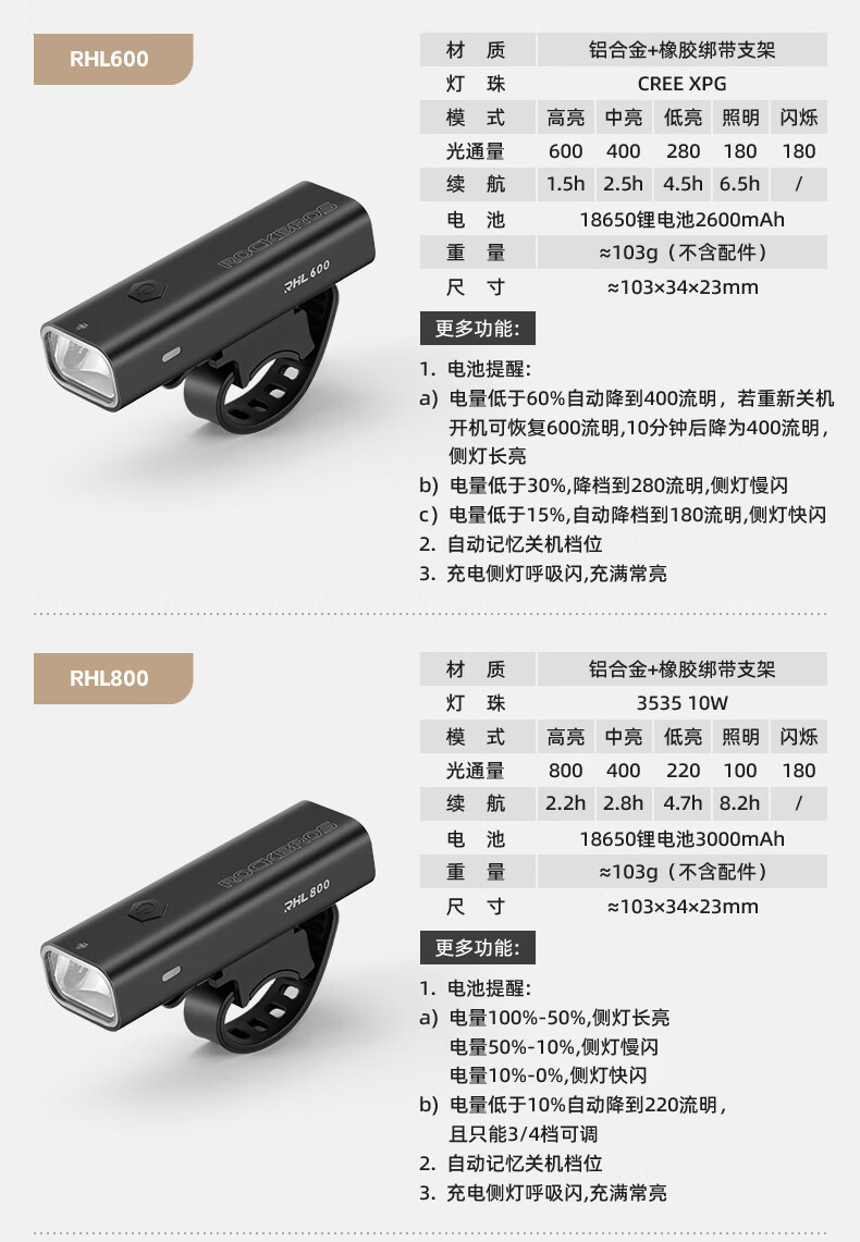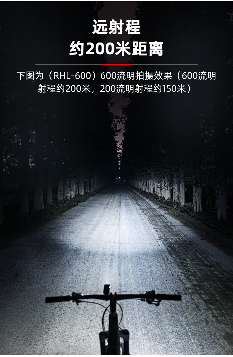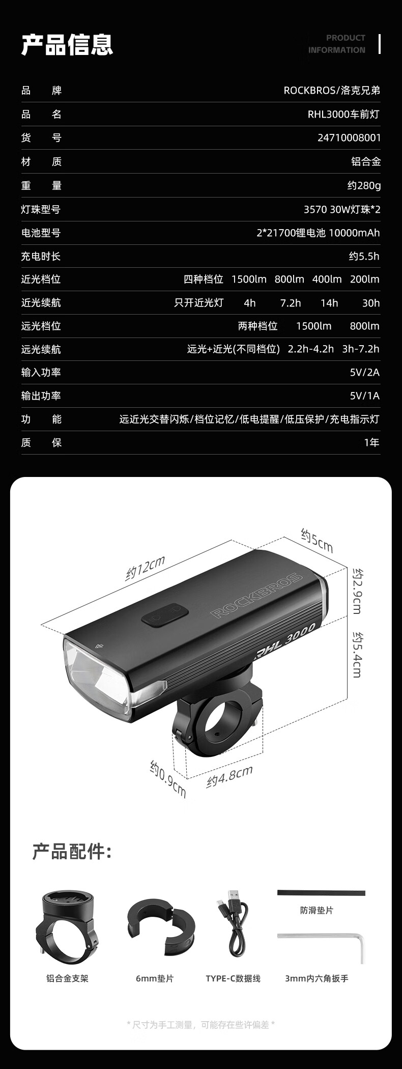 洛克兄弟自行车灯前灯夜骑行高亮强光手电筒TYPE-C充电防雨山地公路车照明 RHL1000流明-智能温控/铝合金支架/赠吊装基座
