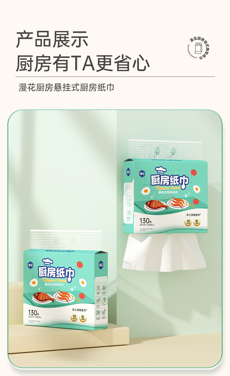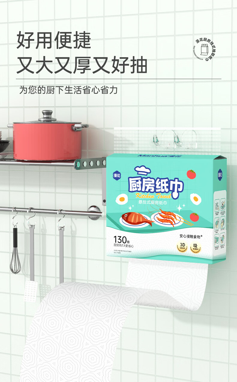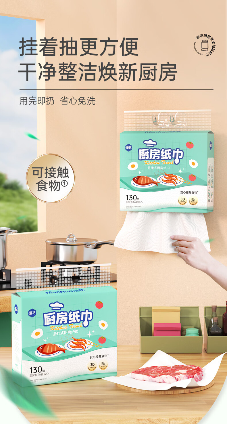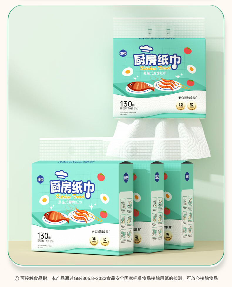 漫花厨房用纸悬挂式厨房纸巾抽纸吸油吸水加大加厚大包一次性厨房纸 【绿色】 2层 130抽*3提