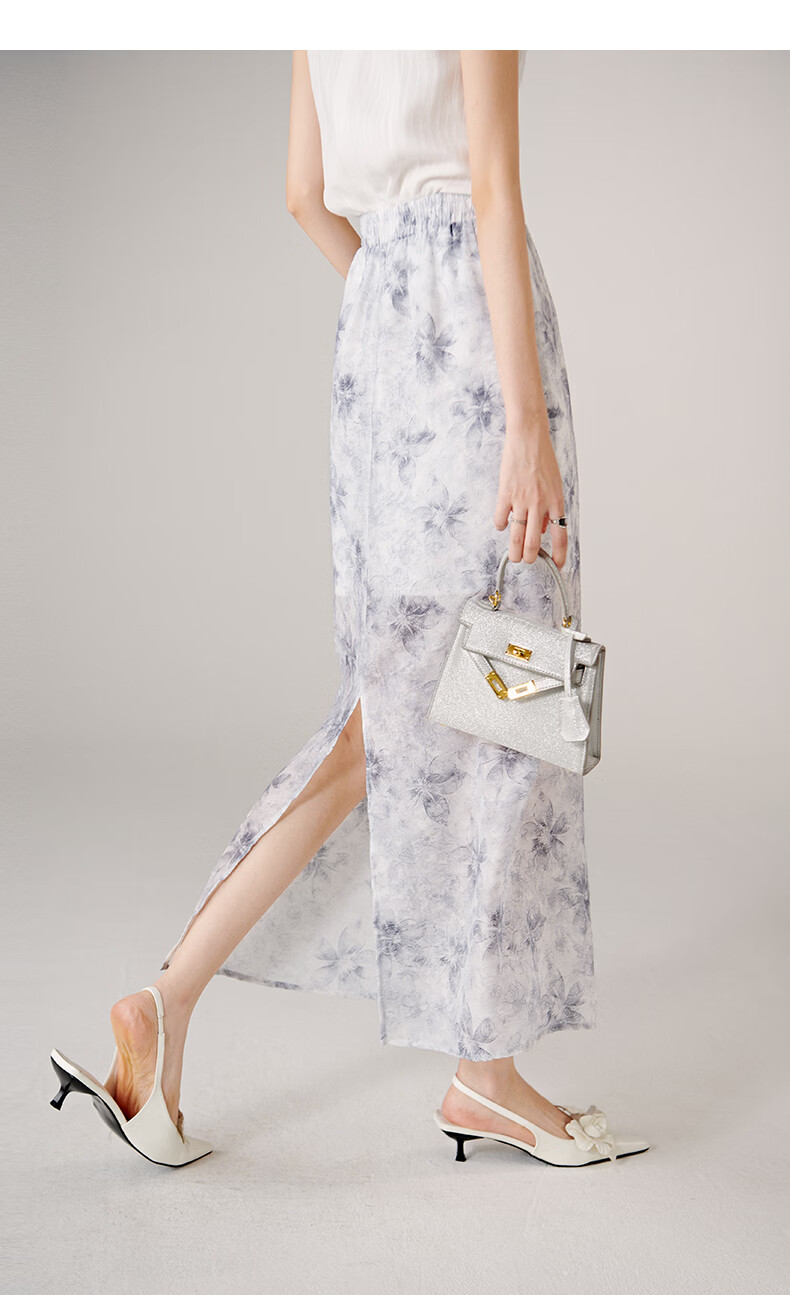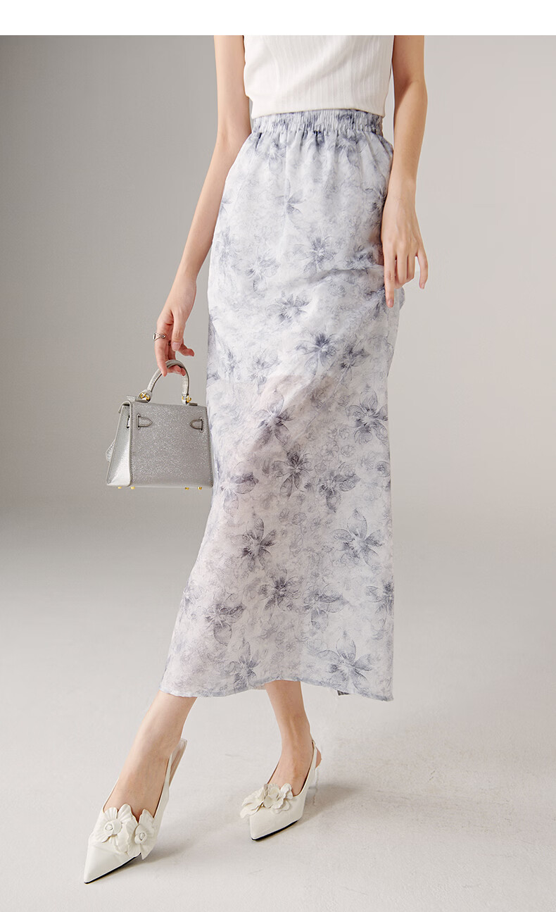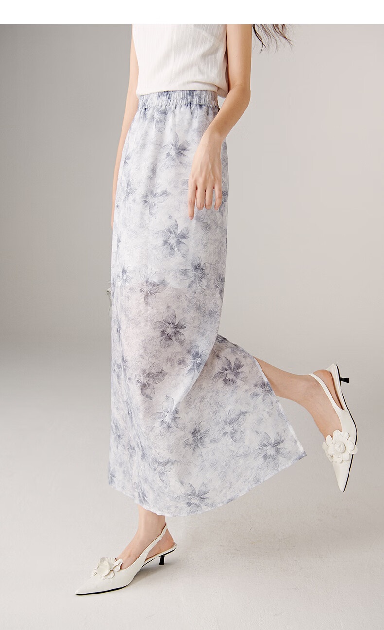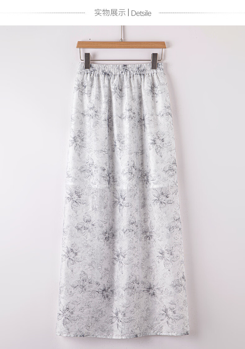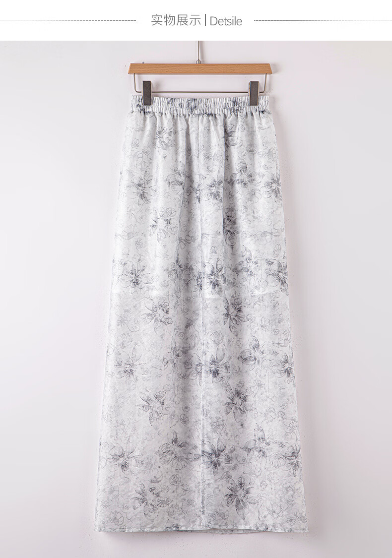 晚白2026年春夏款轻薄仙气水墨印花直筒裙松紧腰后开叉直筒半身裙 花色 S