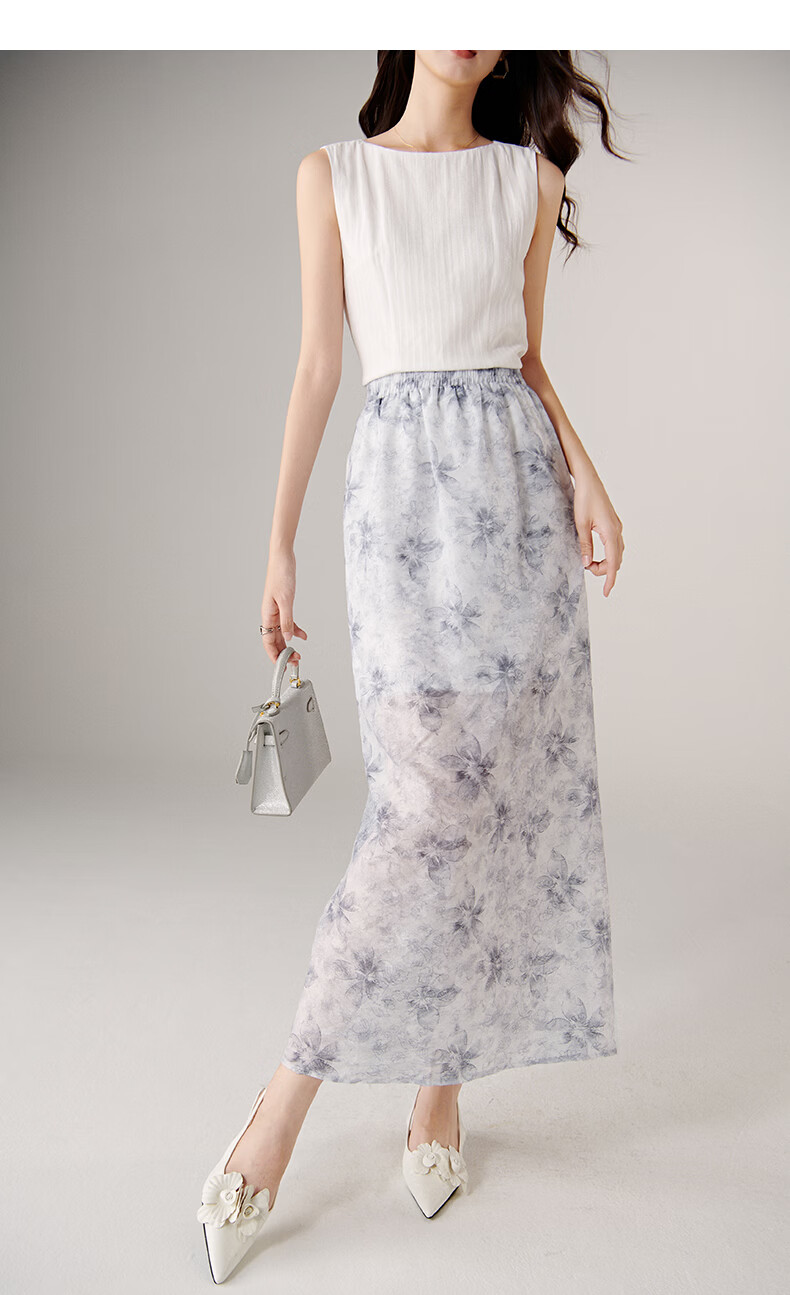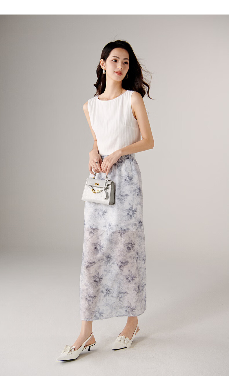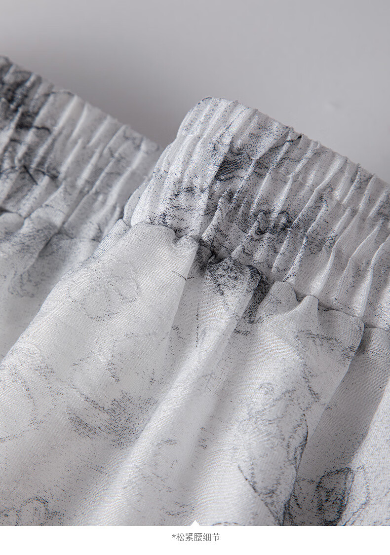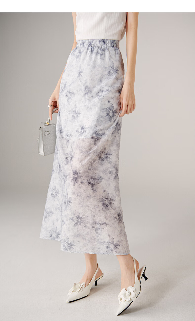 晚白2026年春夏款轻薄仙气水墨印花直筒裙松紧腰后开叉直筒半身裙 花色 S