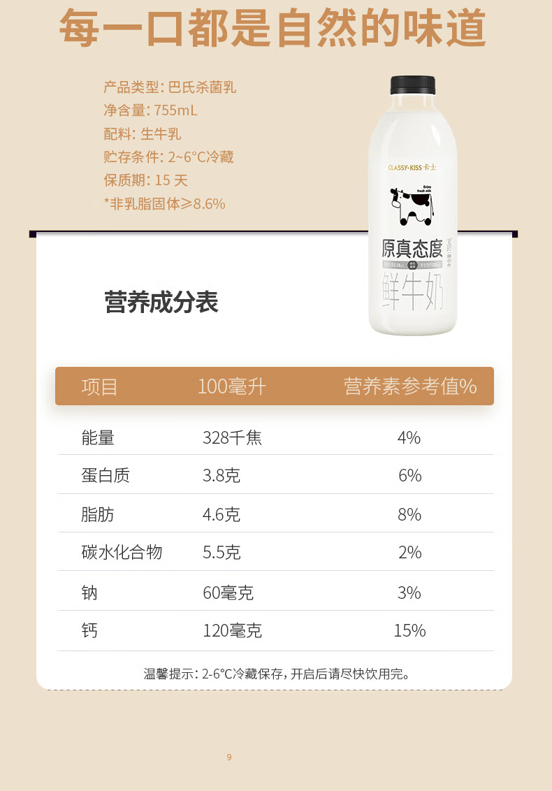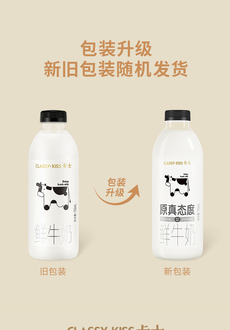 卡士(CLASSY.KISS)原真态度鲜牛奶755mL 3.8g原生乳蛋白 巴氏杀菌鲜奶