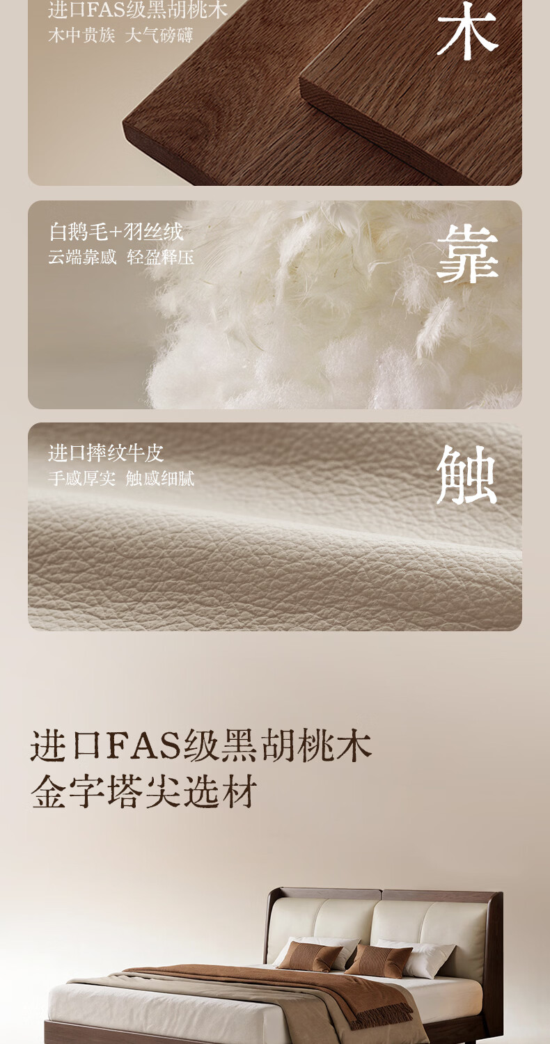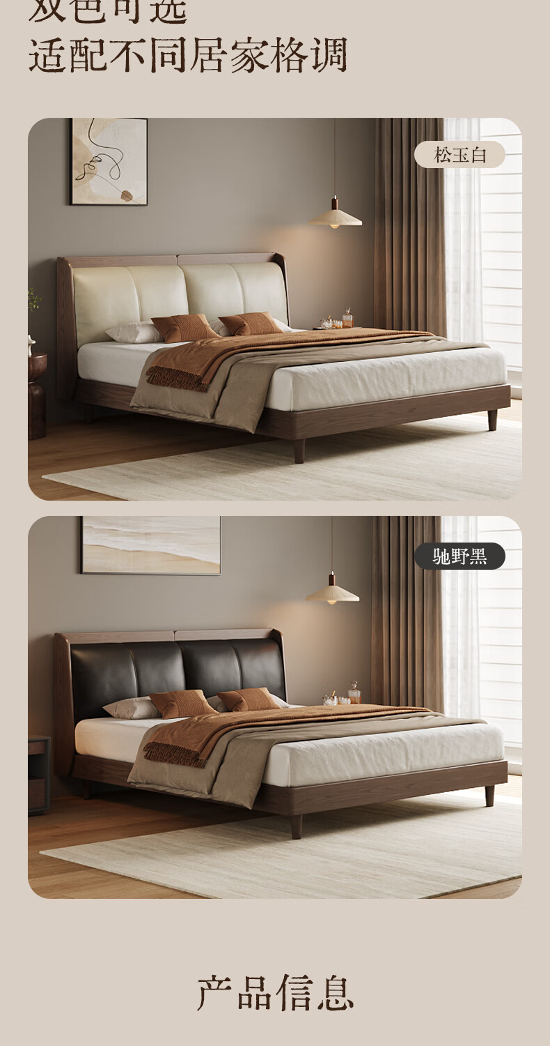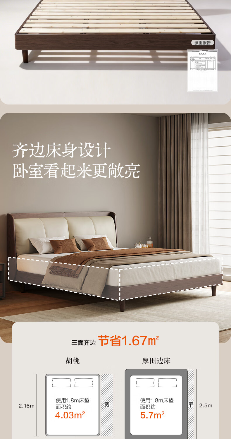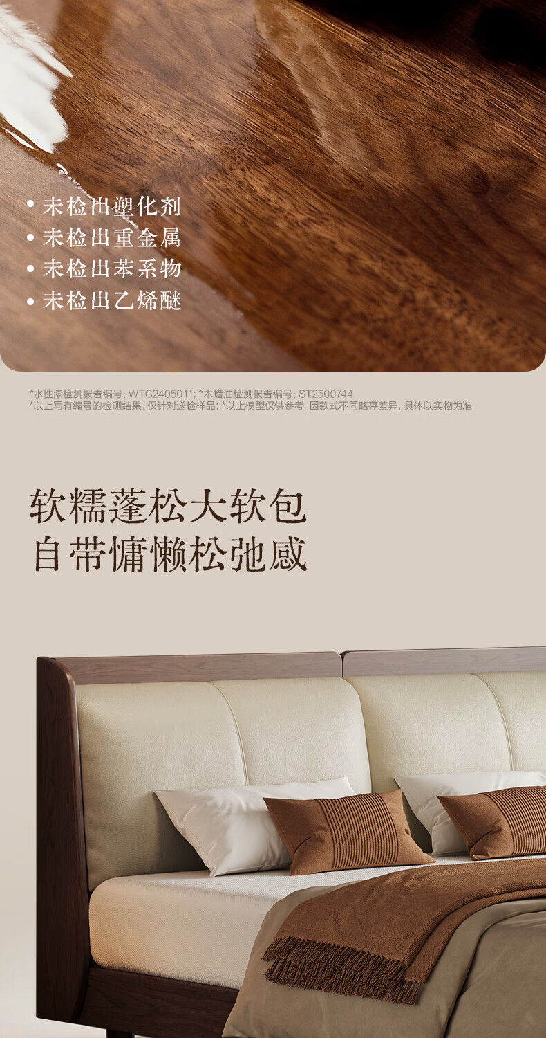 喜临门实木床黑胡桃木简约双人床主卧大床真皮实木软包床 胡桃 松玉白+白骑士plus床垫 1.5*2米