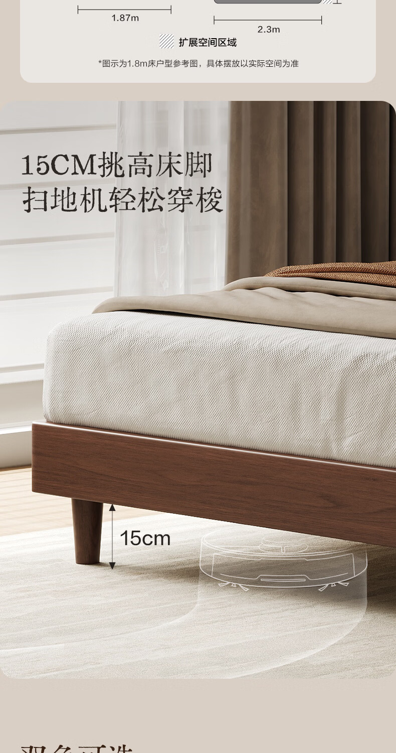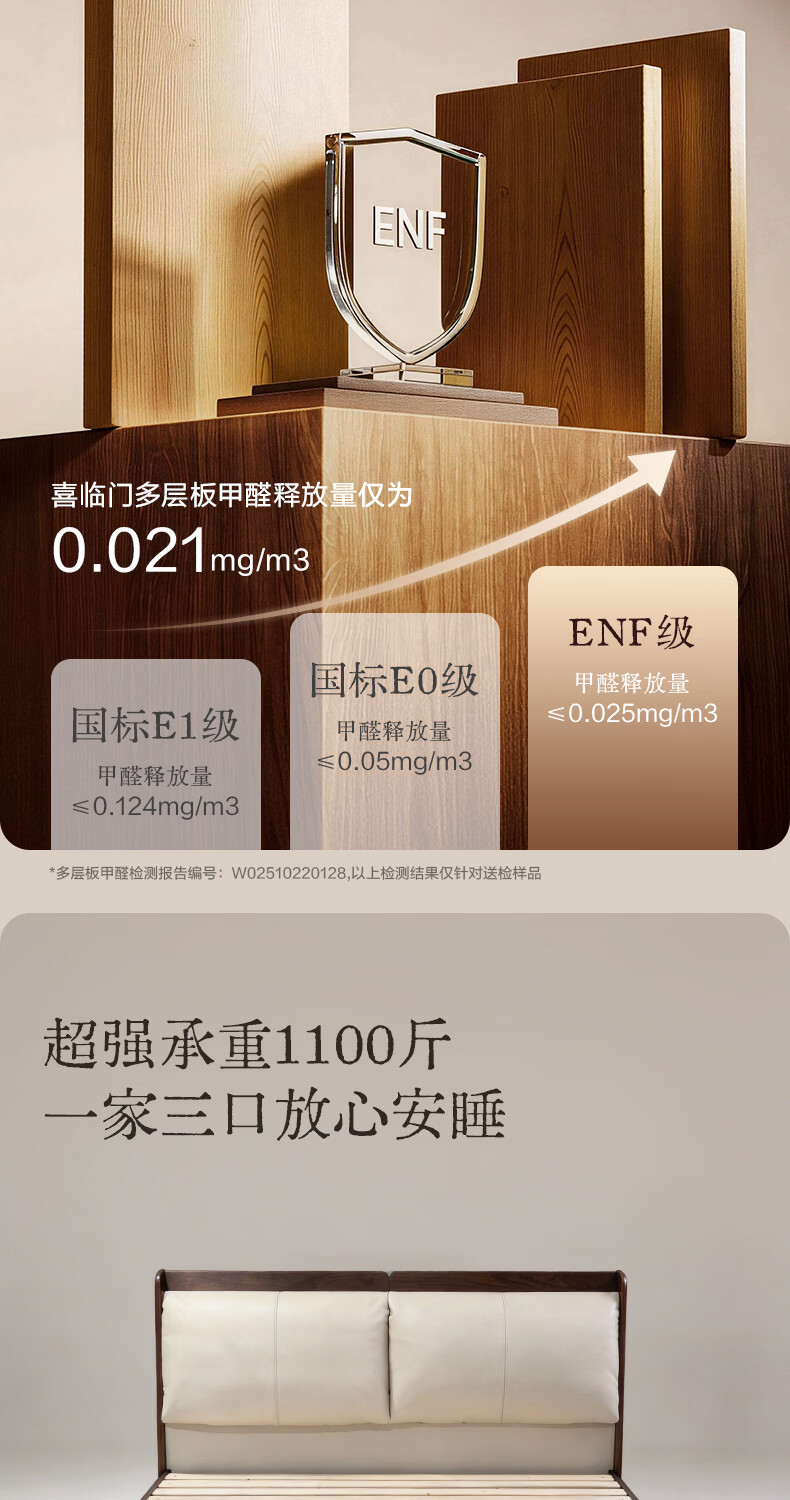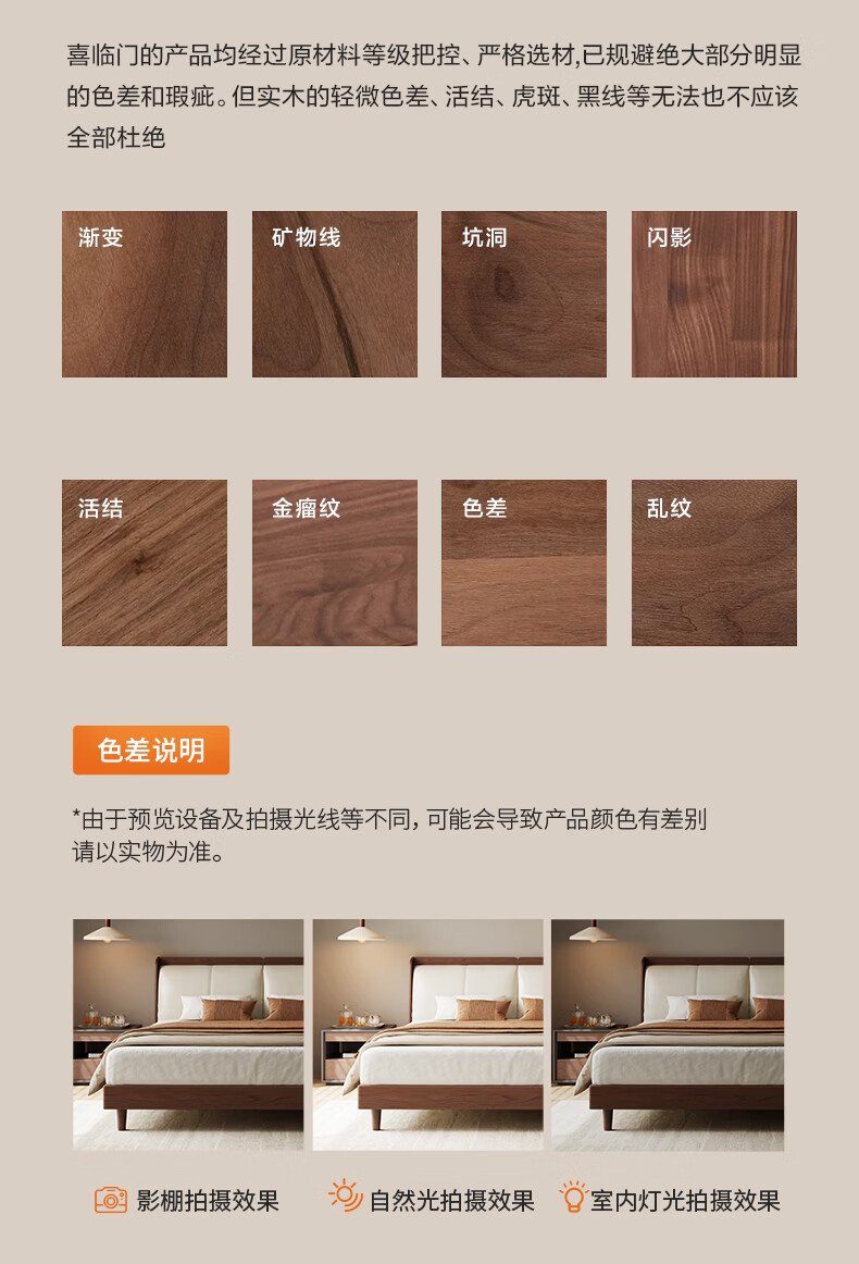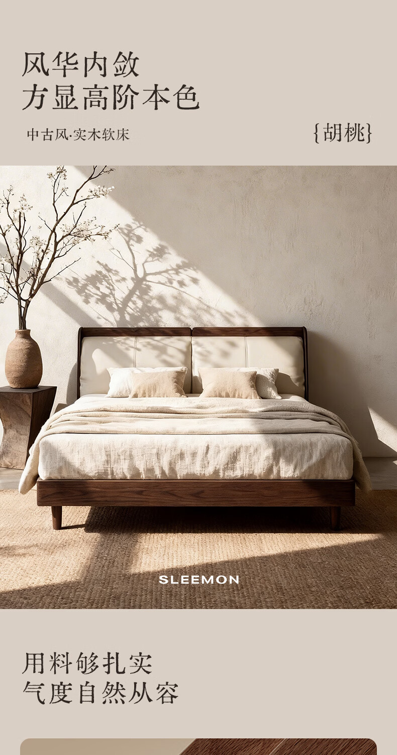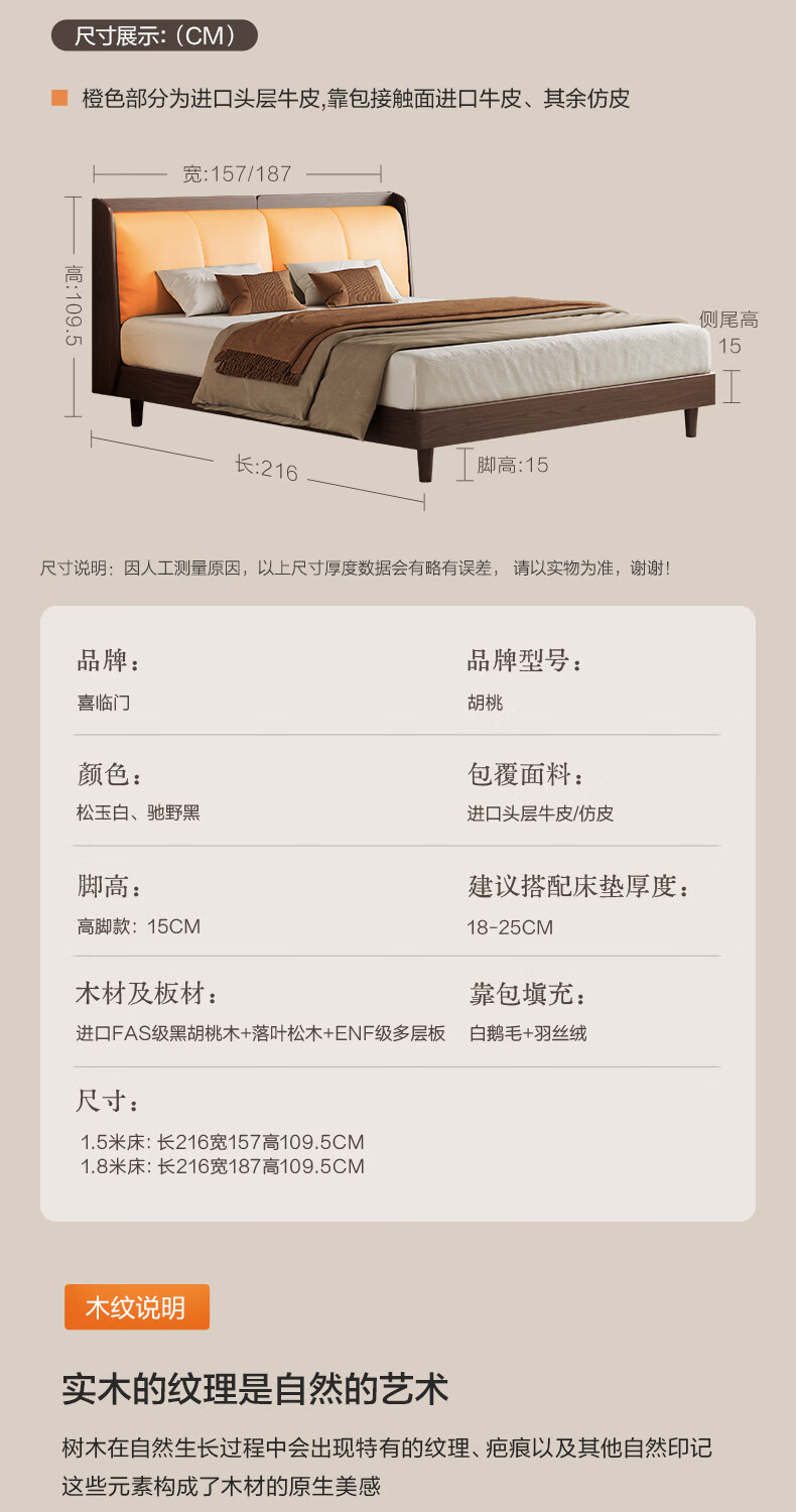 喜临门实木床黑胡桃木简约双人床主卧大床真皮实木软包床 胡桃 松玉白+白骑士plus床垫 1.5*2米