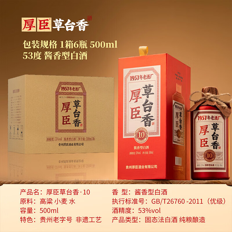 厚臣【喜宴专享】厚臣草台香老酒贵州酱香型 白酒 年货送礼纯粮食窖藏 53度500mL*6瓶厚臣草台香酒老酒