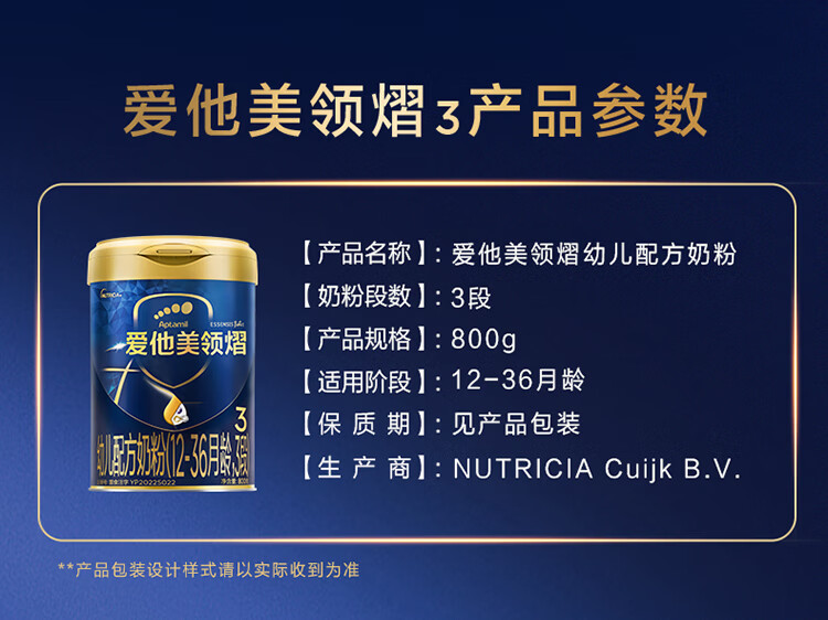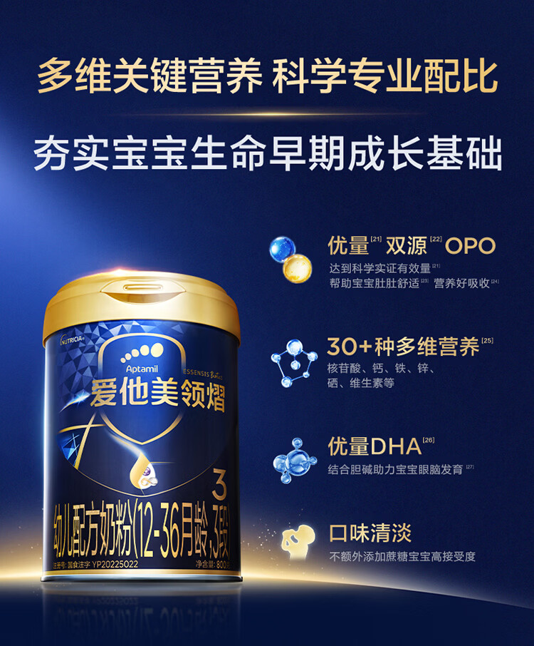 爱他美(Aptamil)领熠幼儿配方奶粉3段(12-36月龄)800g*3罐 2400g 母源自护菌