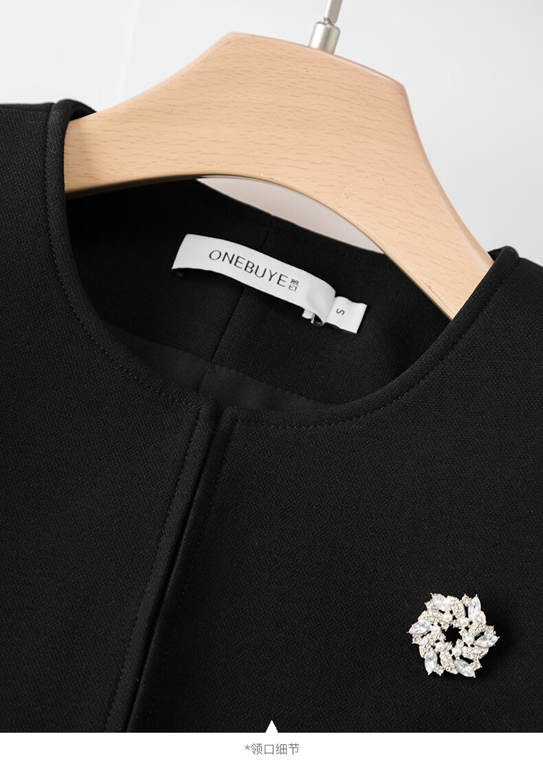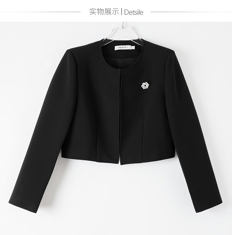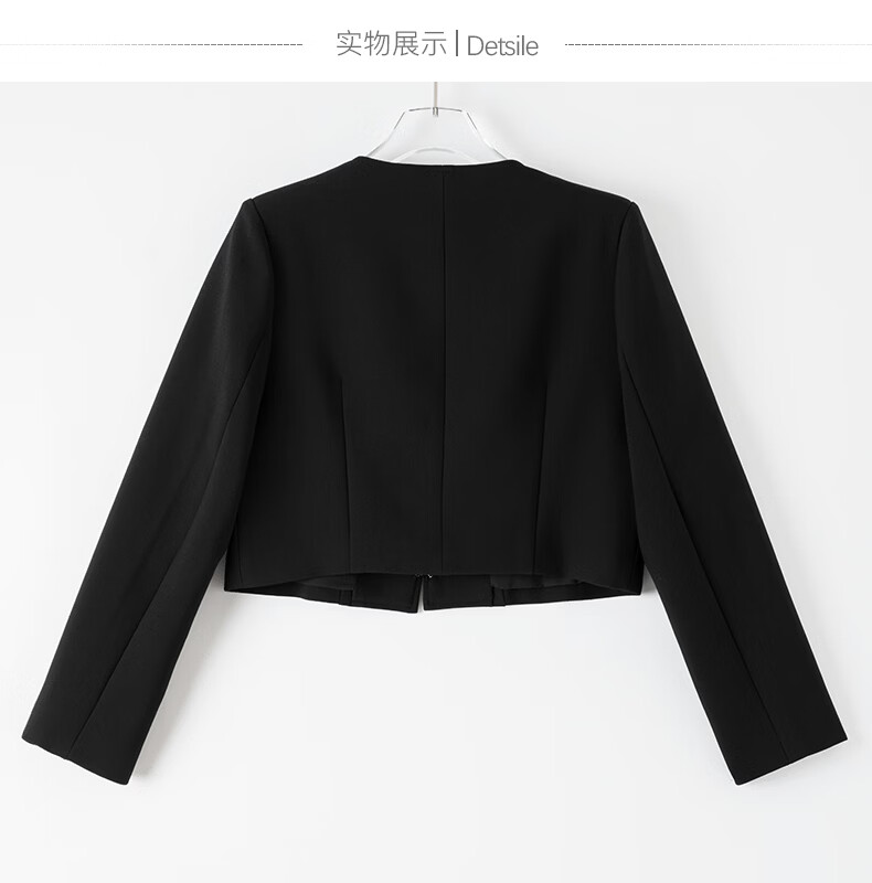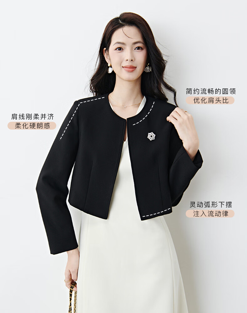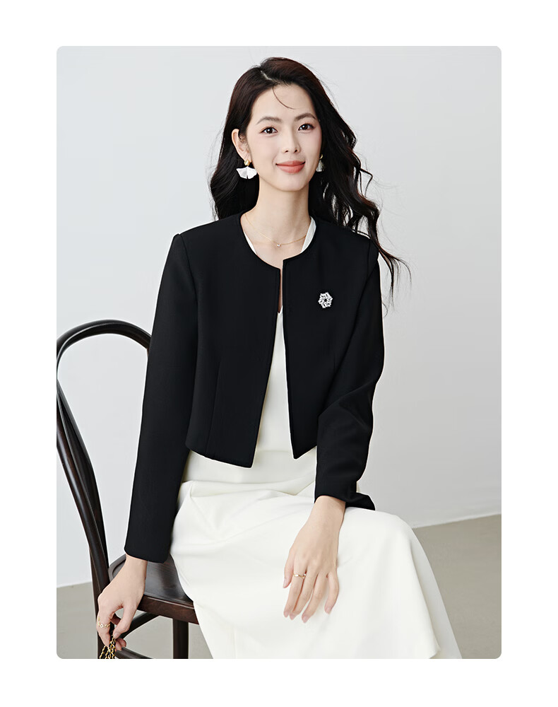 晚白【配胸针】2026春通勤圆领都市极简风上衣时尚小个子显高短外套女 黑色 M