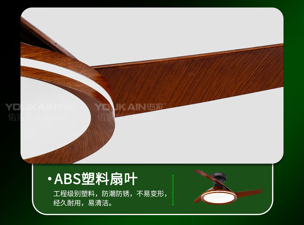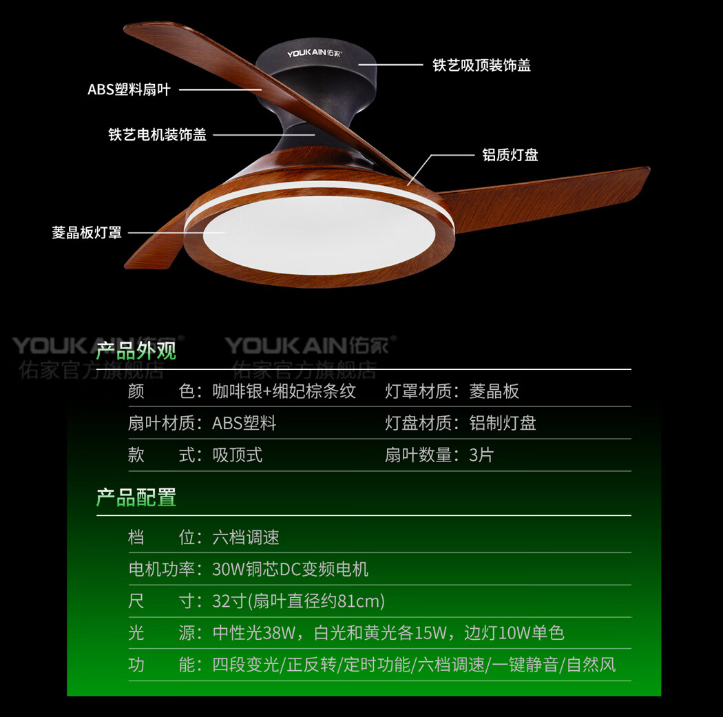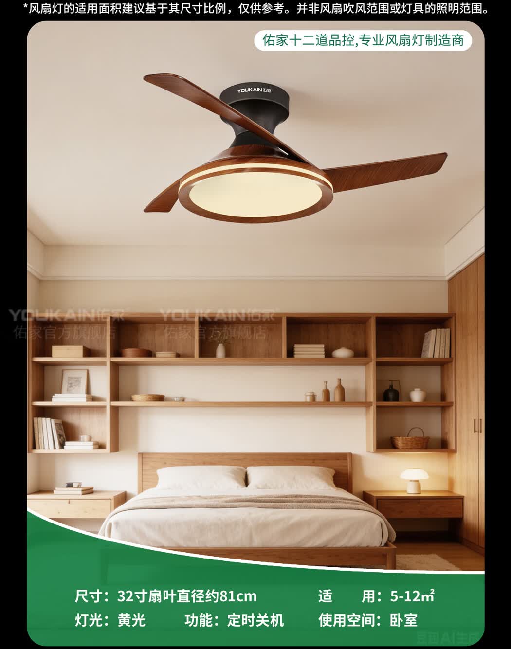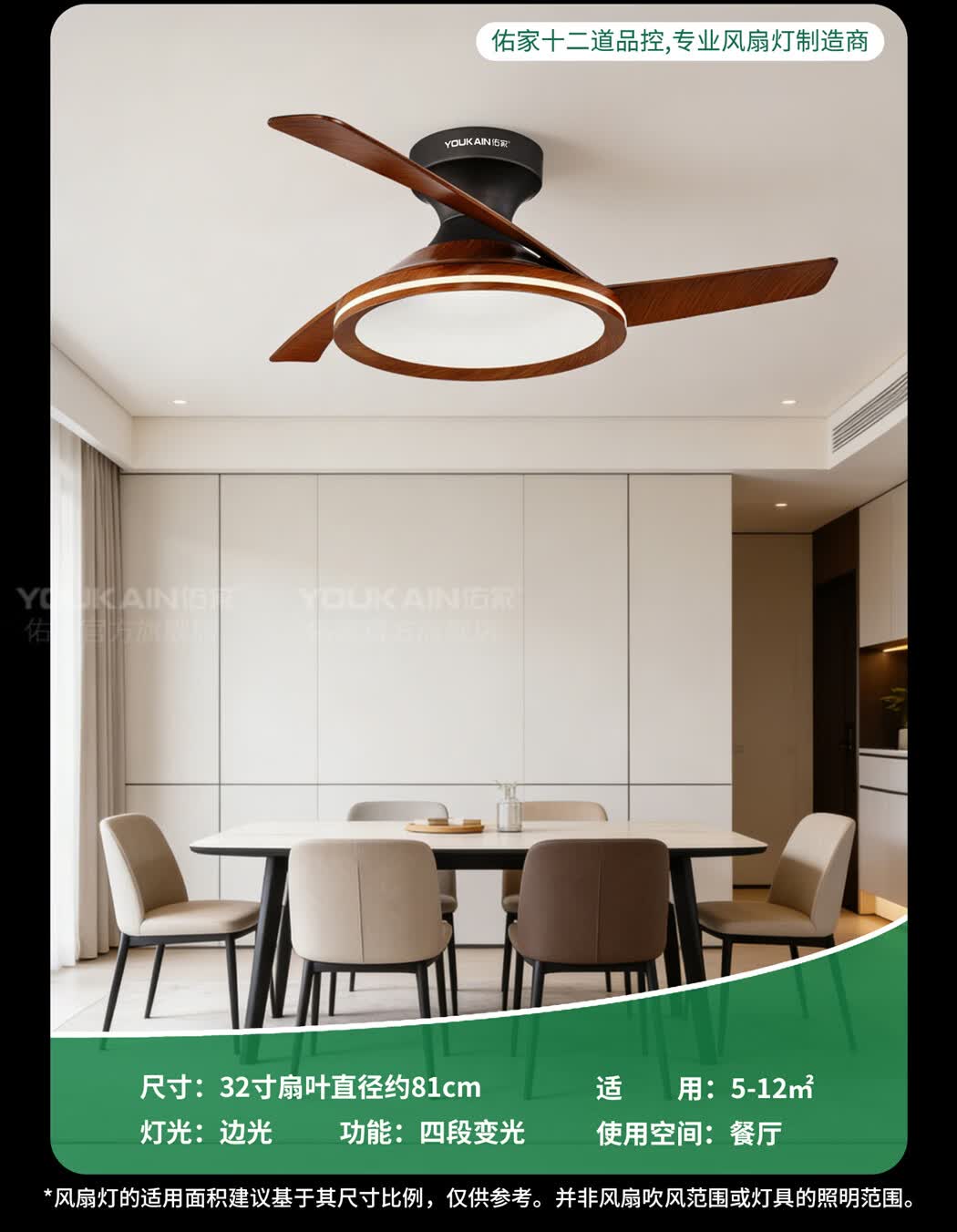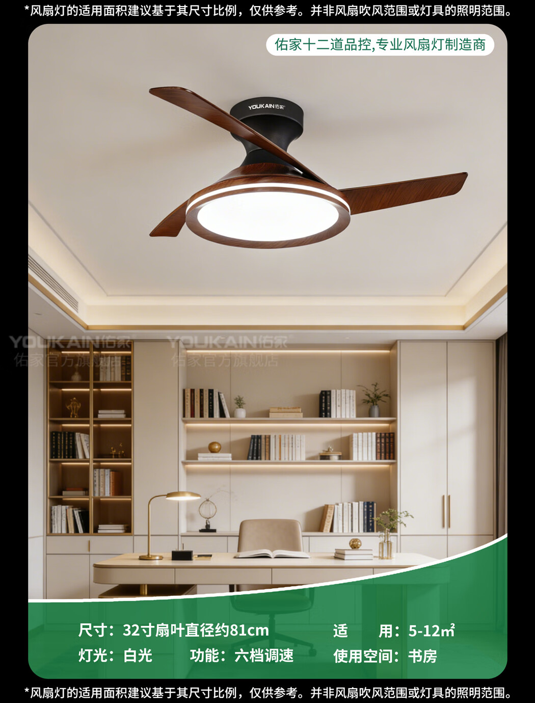 佑家(YOUKAIN)吸顶卧室静音风扇灯房间三防吊扇灯小餐厅变频遥控吊扇 32寸吸顶 铝制三防38w全光谱
