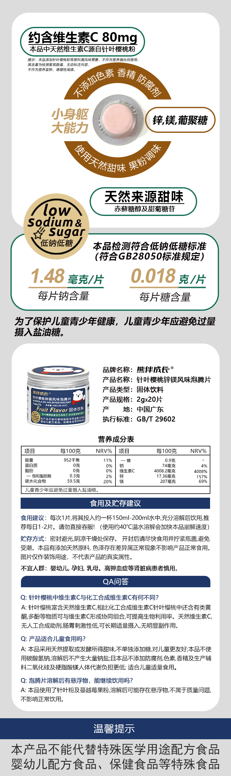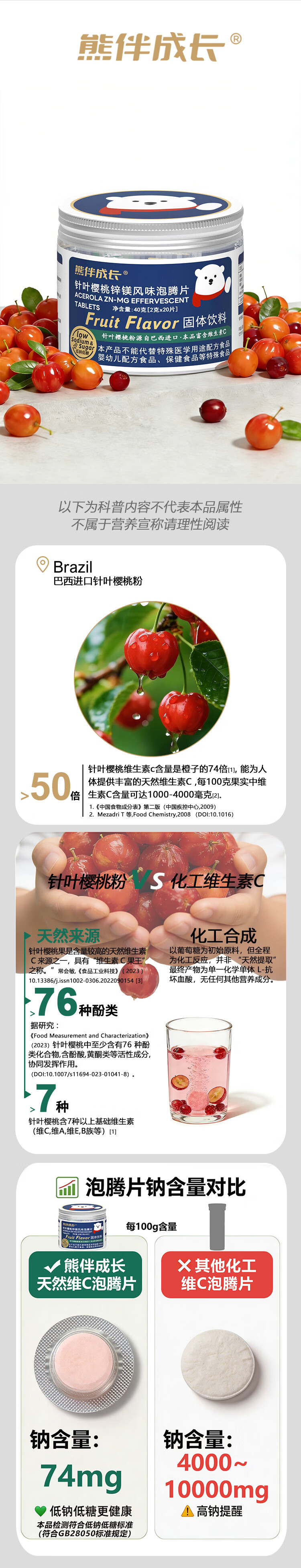 熊伴成长针叶樱桃儿童低钠低糖果味泡腾片20片