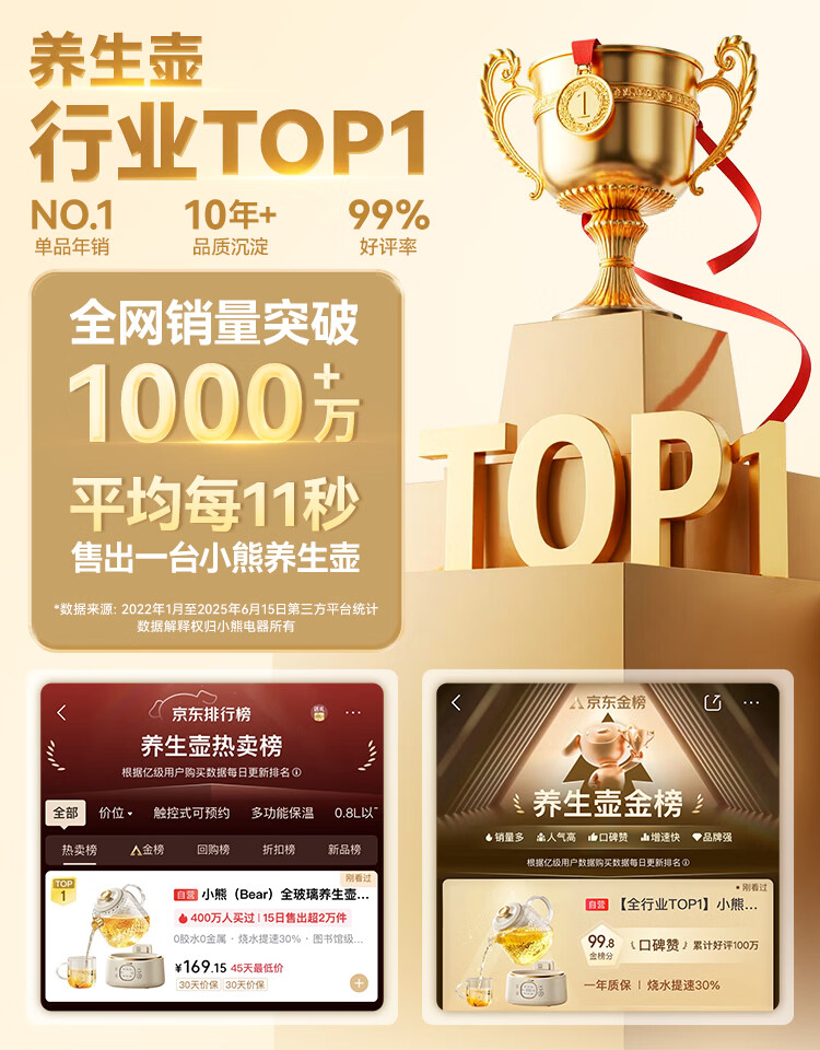 小熊(Bear)全玻璃养生壶 纯玻璃多功能恒温烧水壶 办公室轻音炖煮茶壶 1L YSH-J10D1 女神节礼物