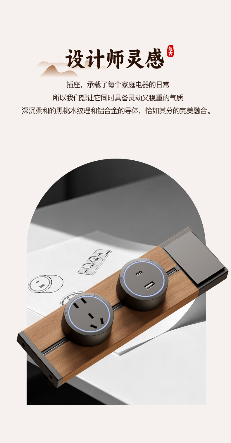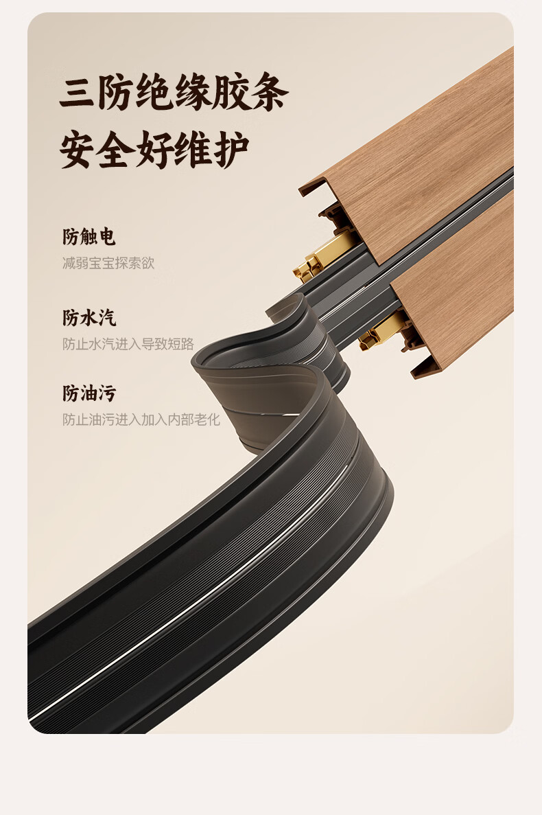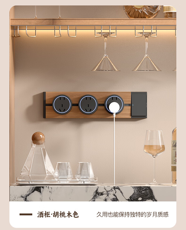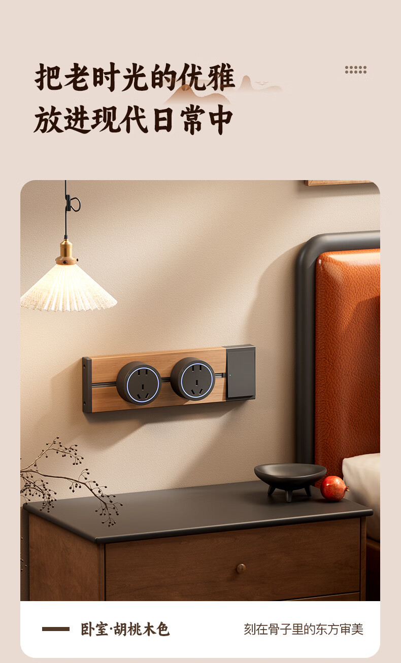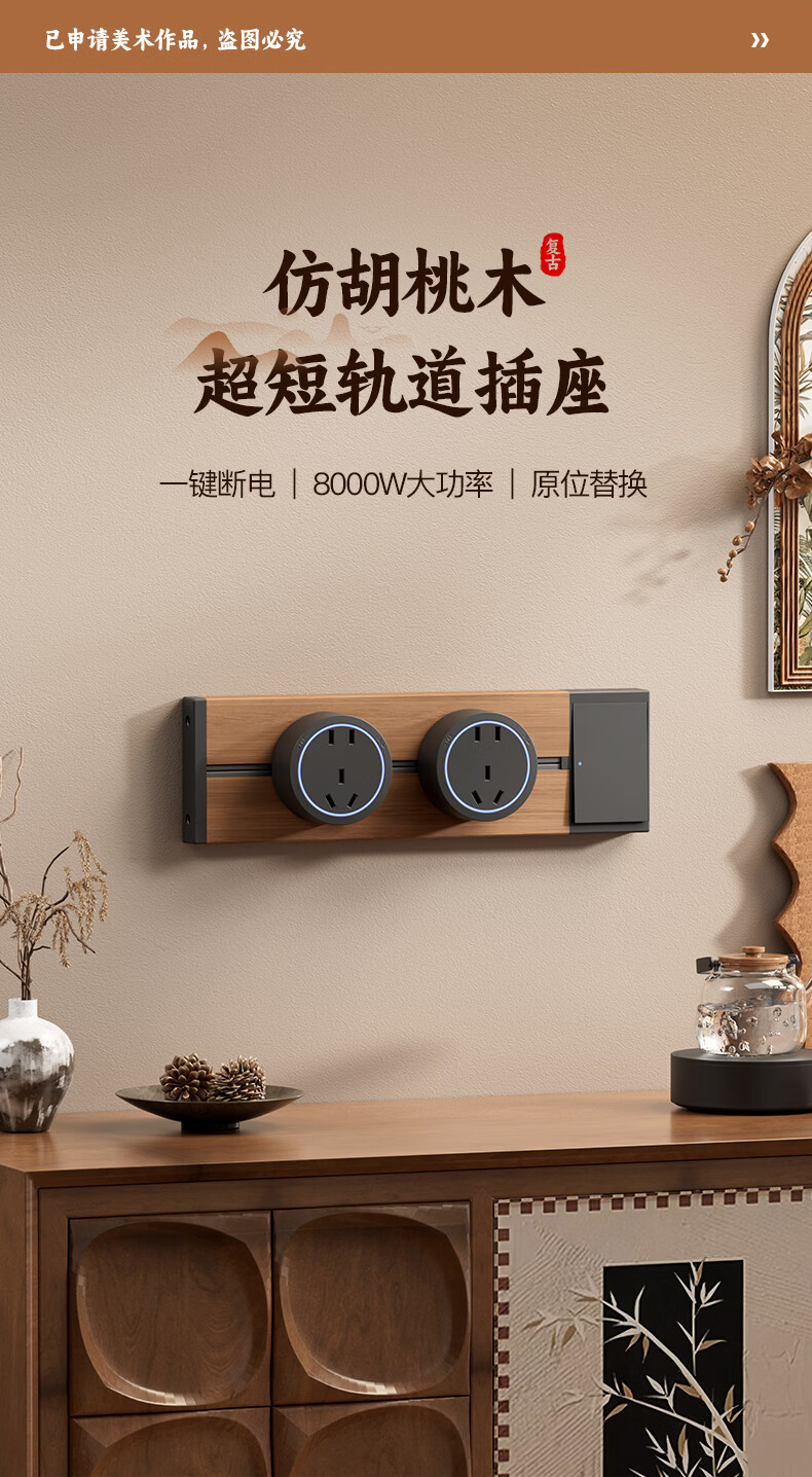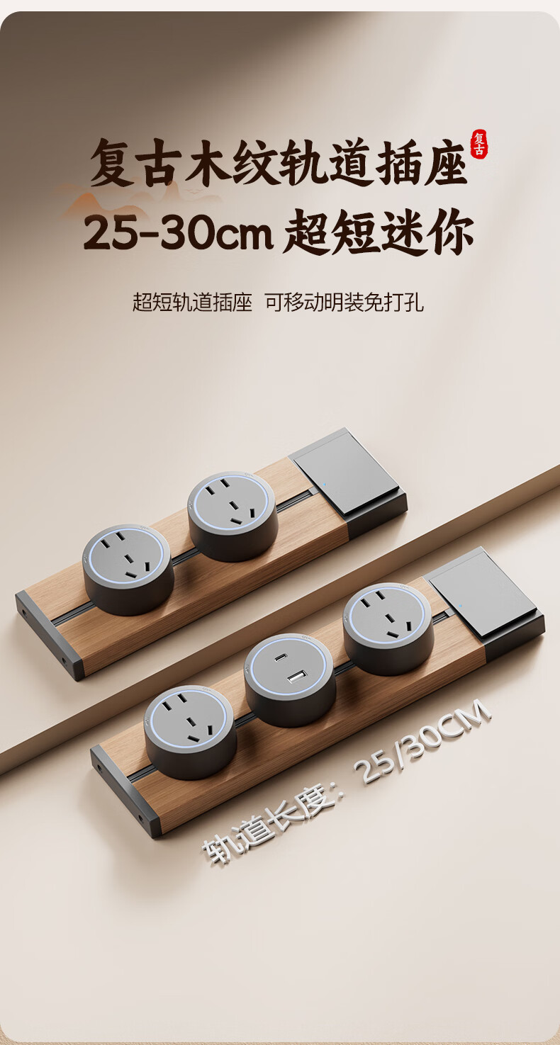国际电工木纹轨道插座迷你款25cm超短可移动明装家用滑轨磁吸排插小尺寸 【复古木纹】25cm+2个大五孔