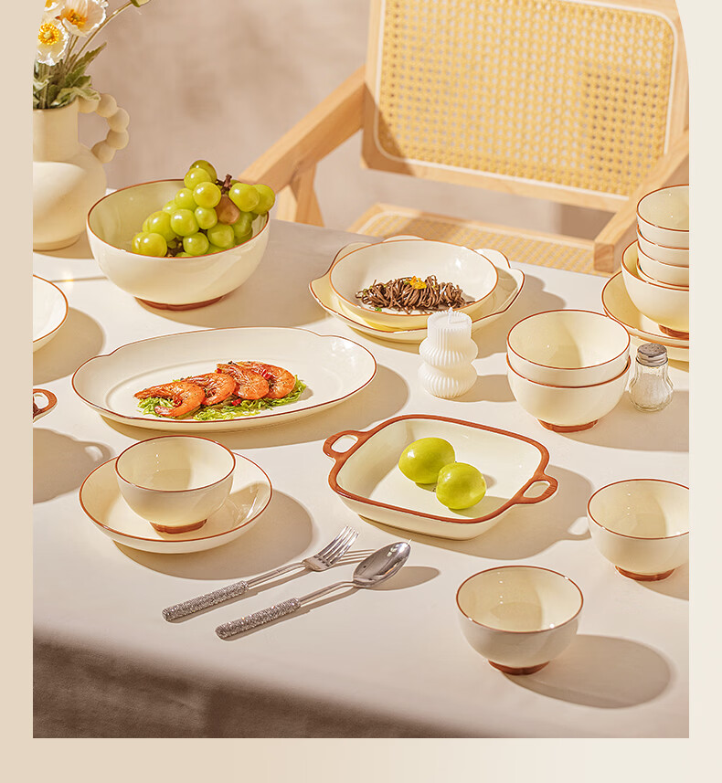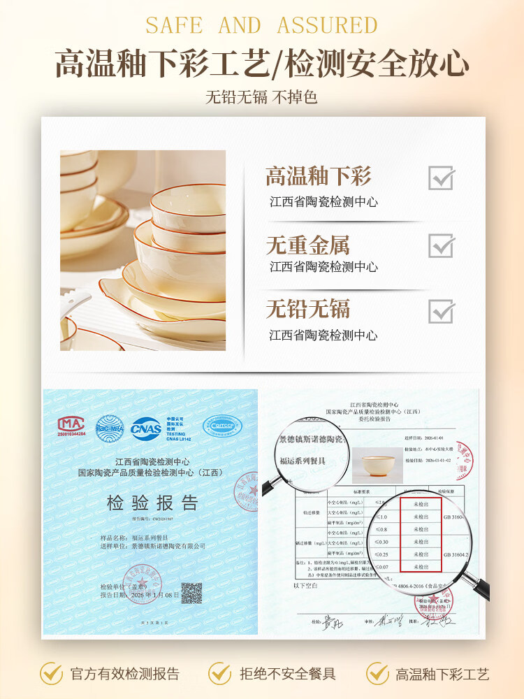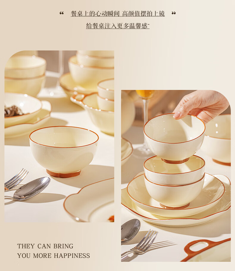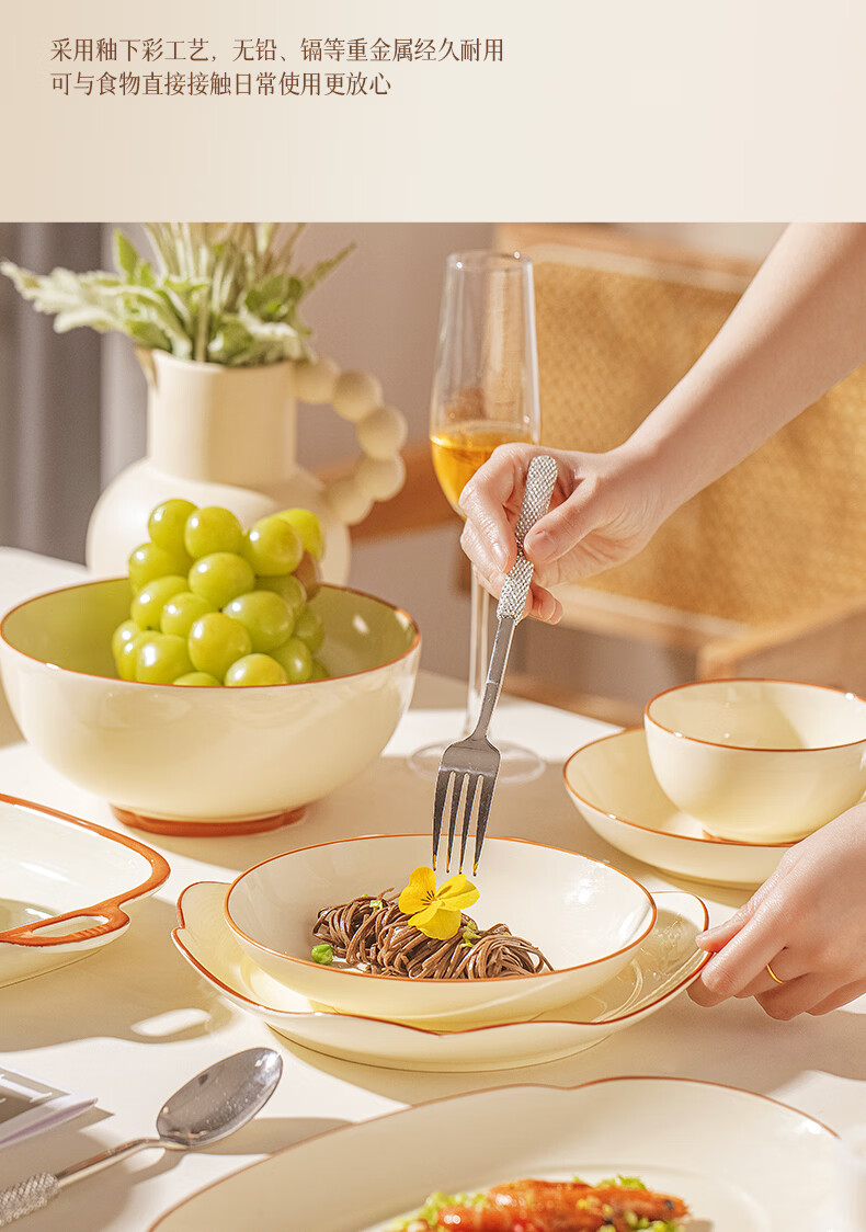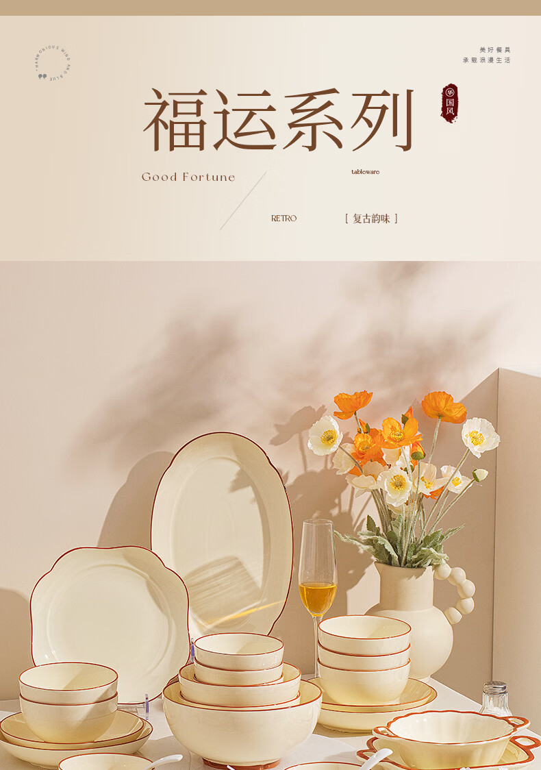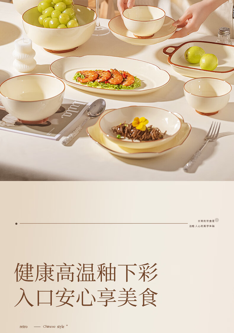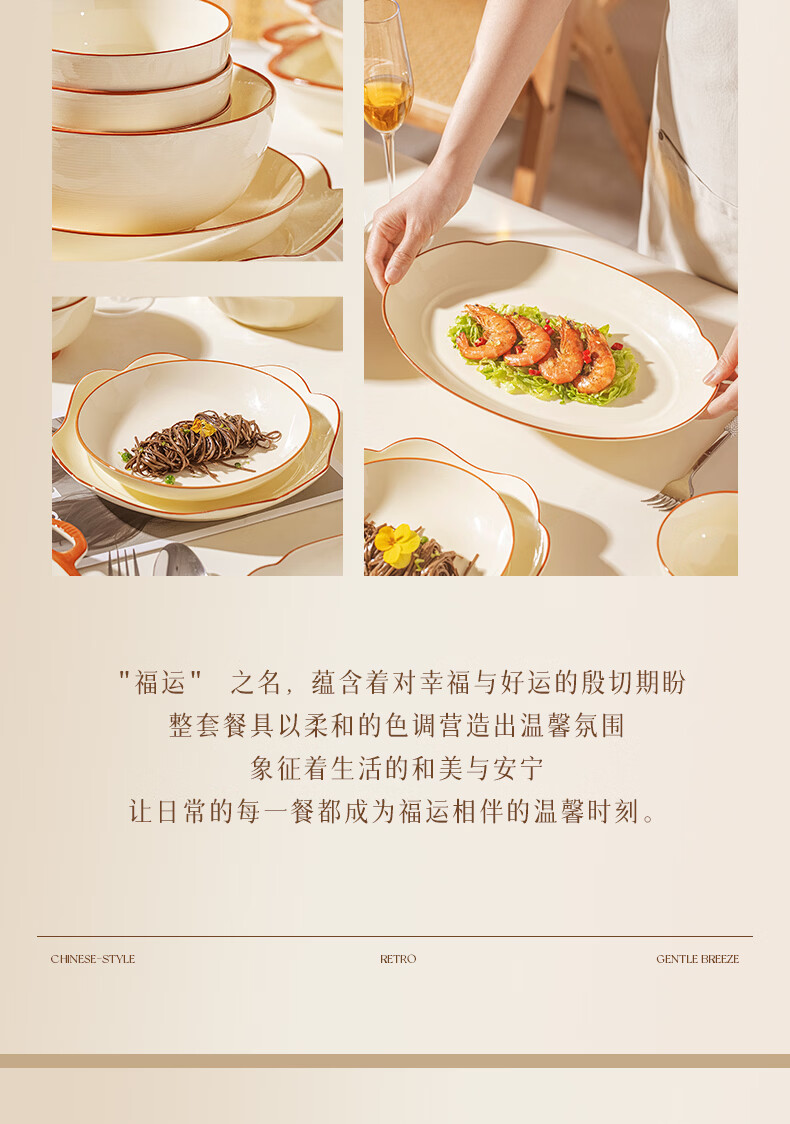 精缔陶瓷JINGDI釉下彩碗碟套装家用2026高颜值奶油风陶瓷餐具套装碗盘筷乔迁碗具 【店长推荐】福运十人食54件套