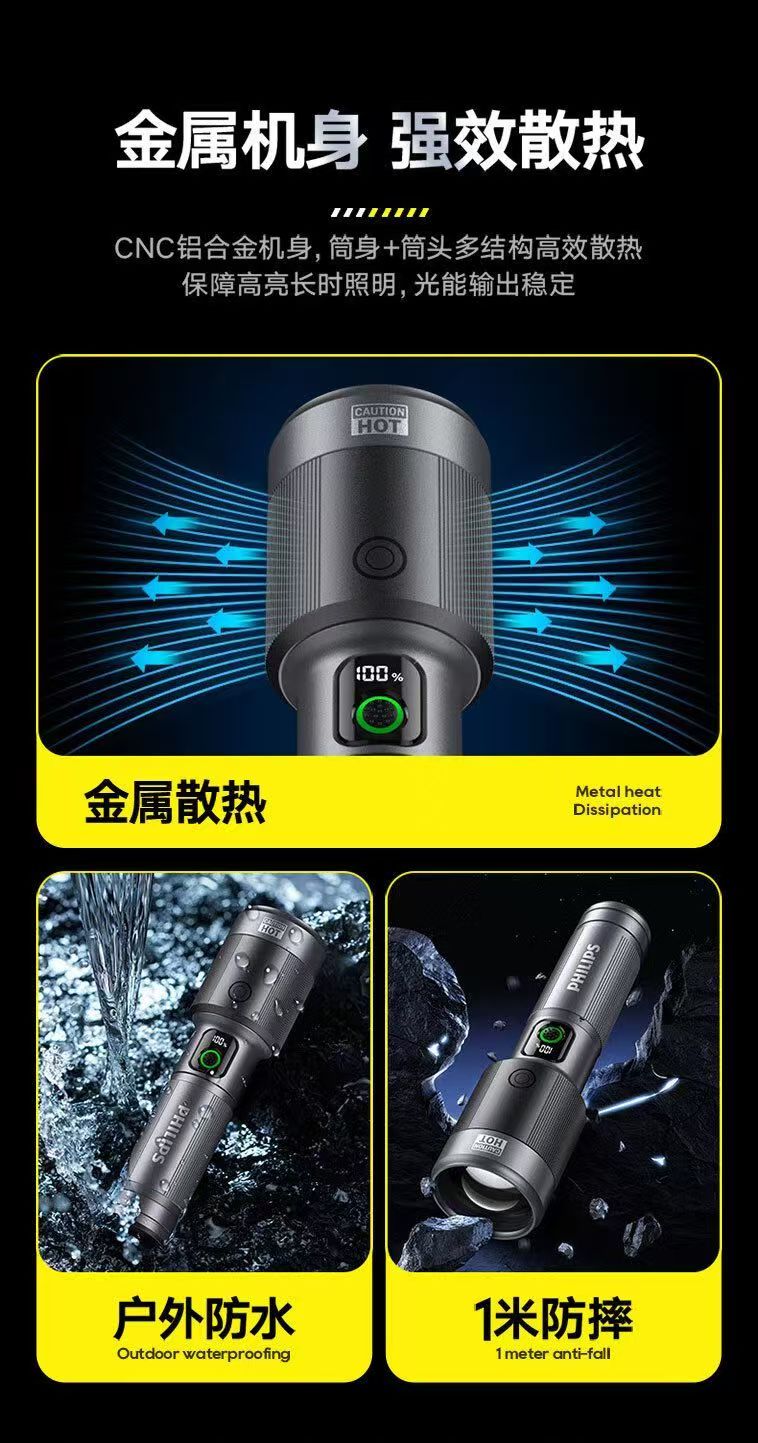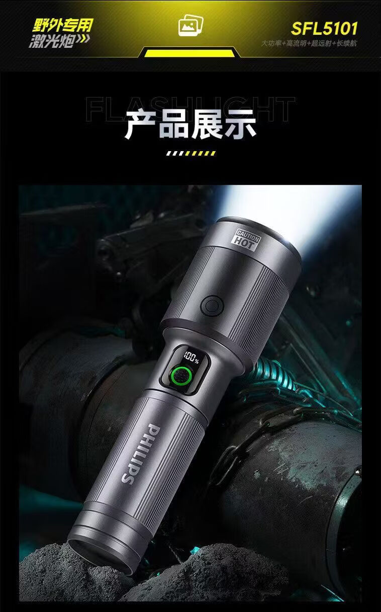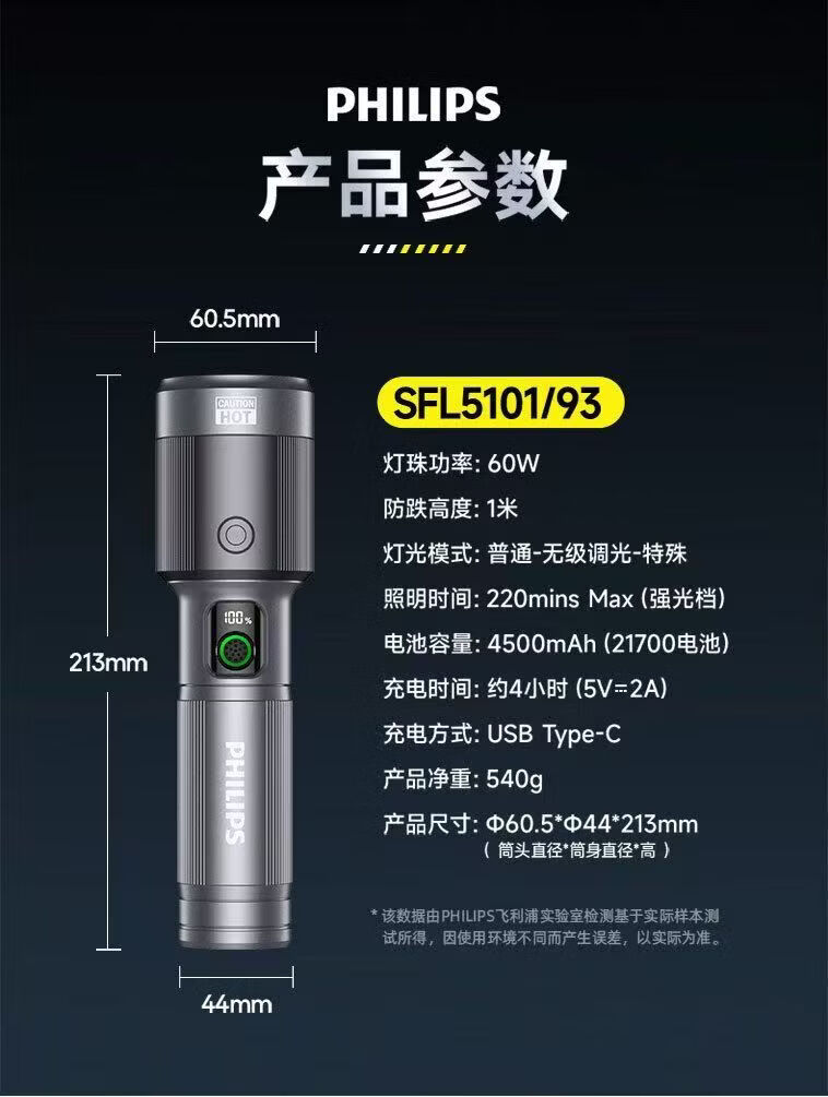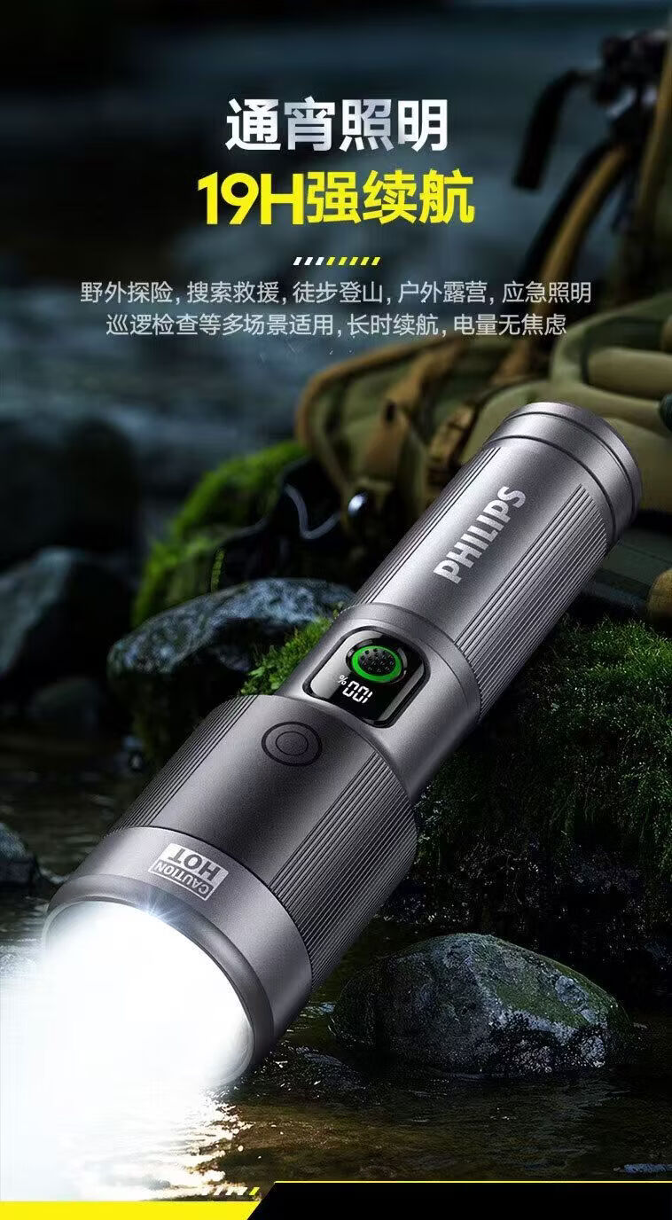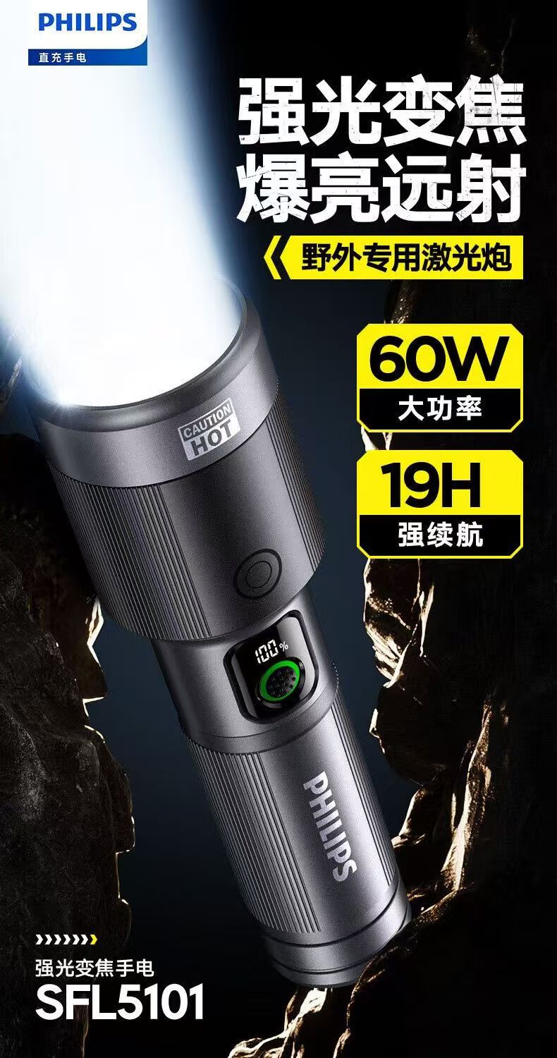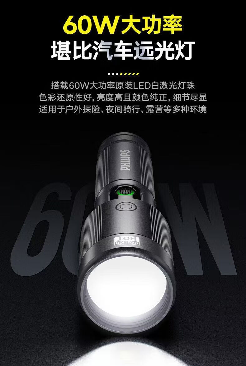 飞利浦手电筒高亮变焦手电强光充电户外远射长久续航户外应急照明手电SFL5101 60W/4500毫安/变焦/SFL5101