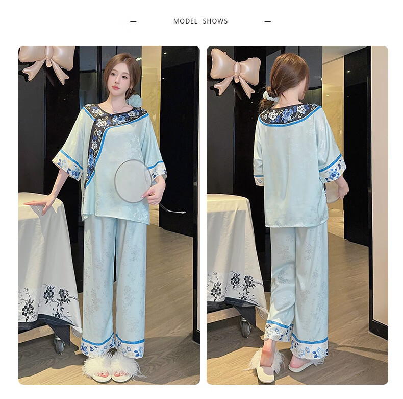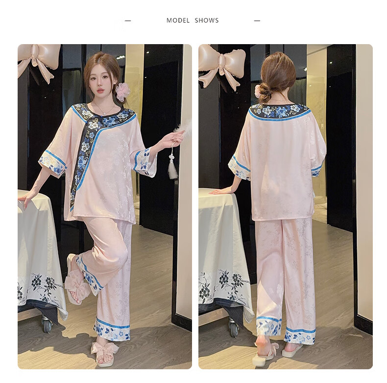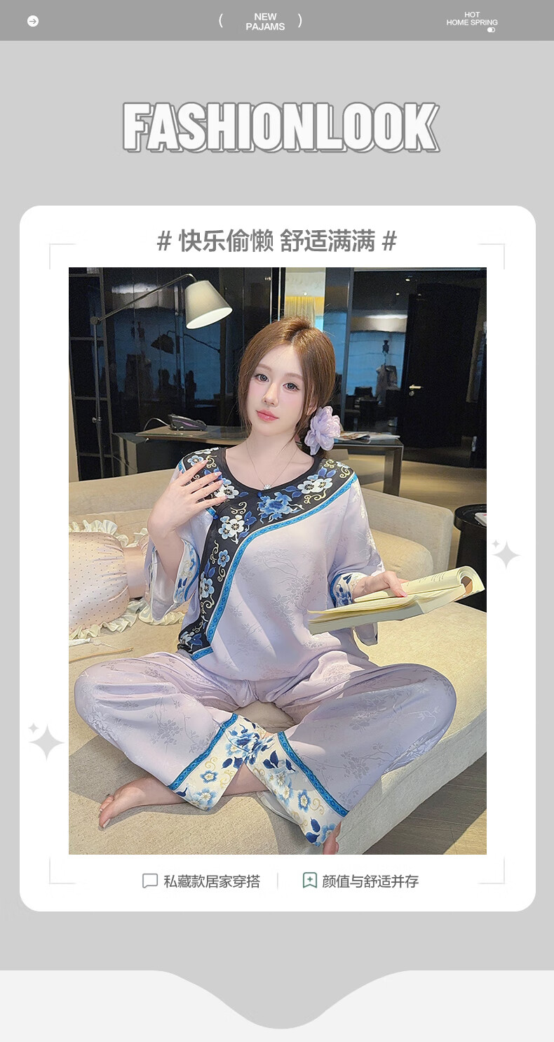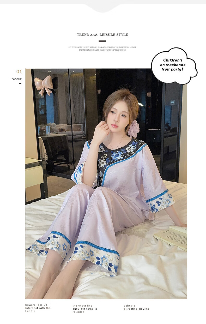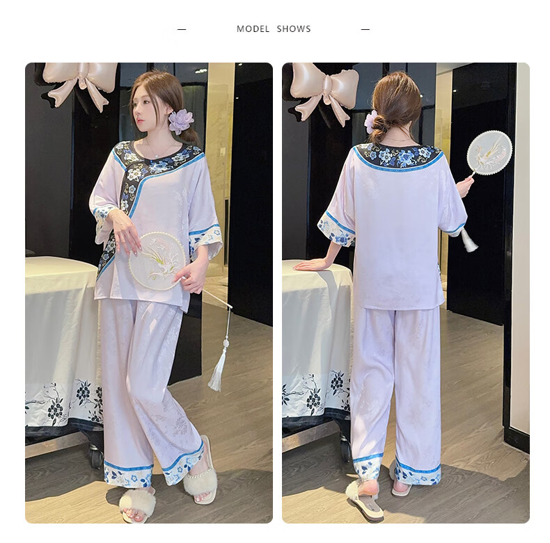萧淑妃新中式国风睡衣女夏季凉感薄款冰丝复古少奶奶半袖长裤家居服套装 紫色 XL