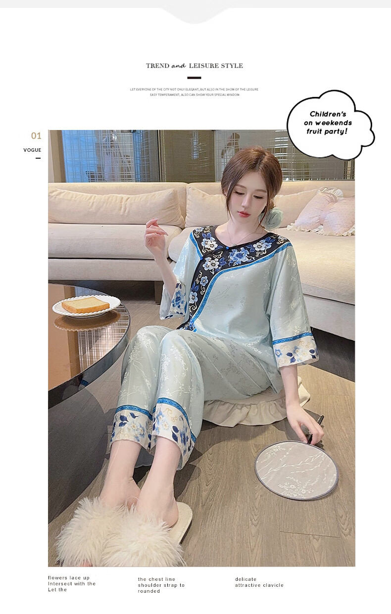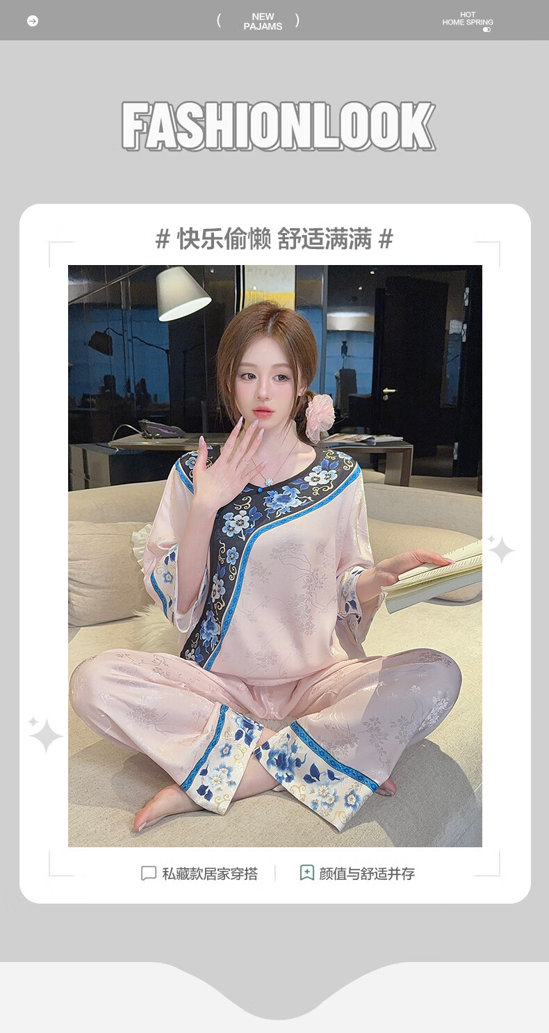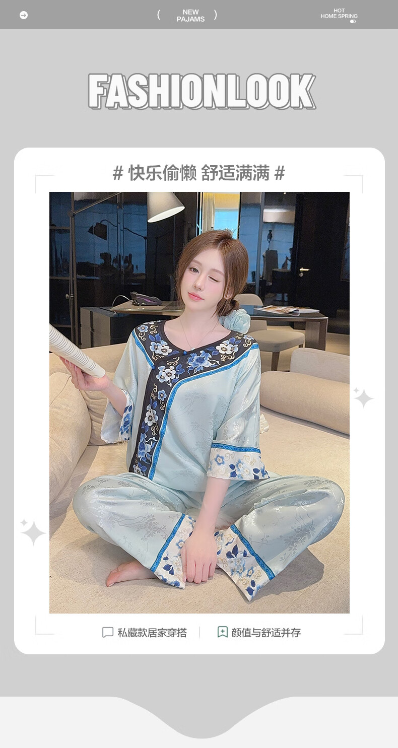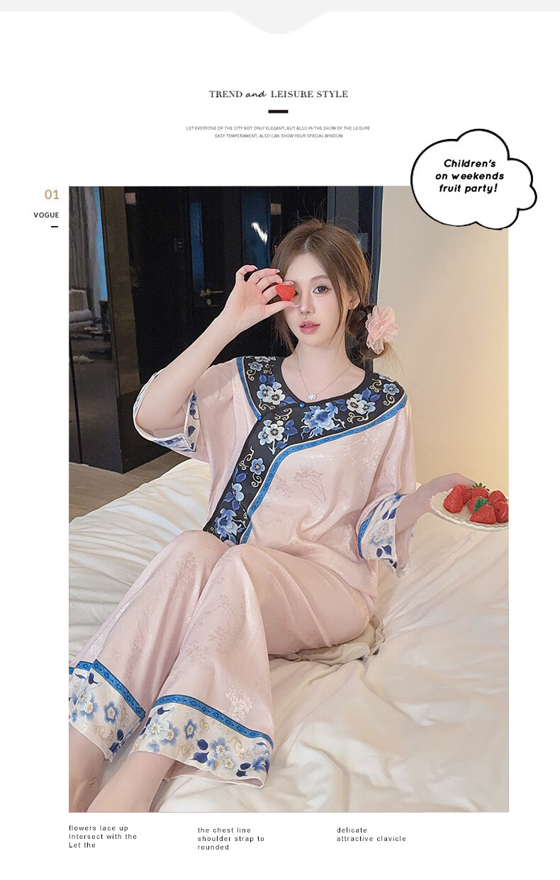 萧淑妃新中式国风睡衣女夏季凉感薄款冰丝复古少奶奶半袖长裤家居服套装 紫色 XL