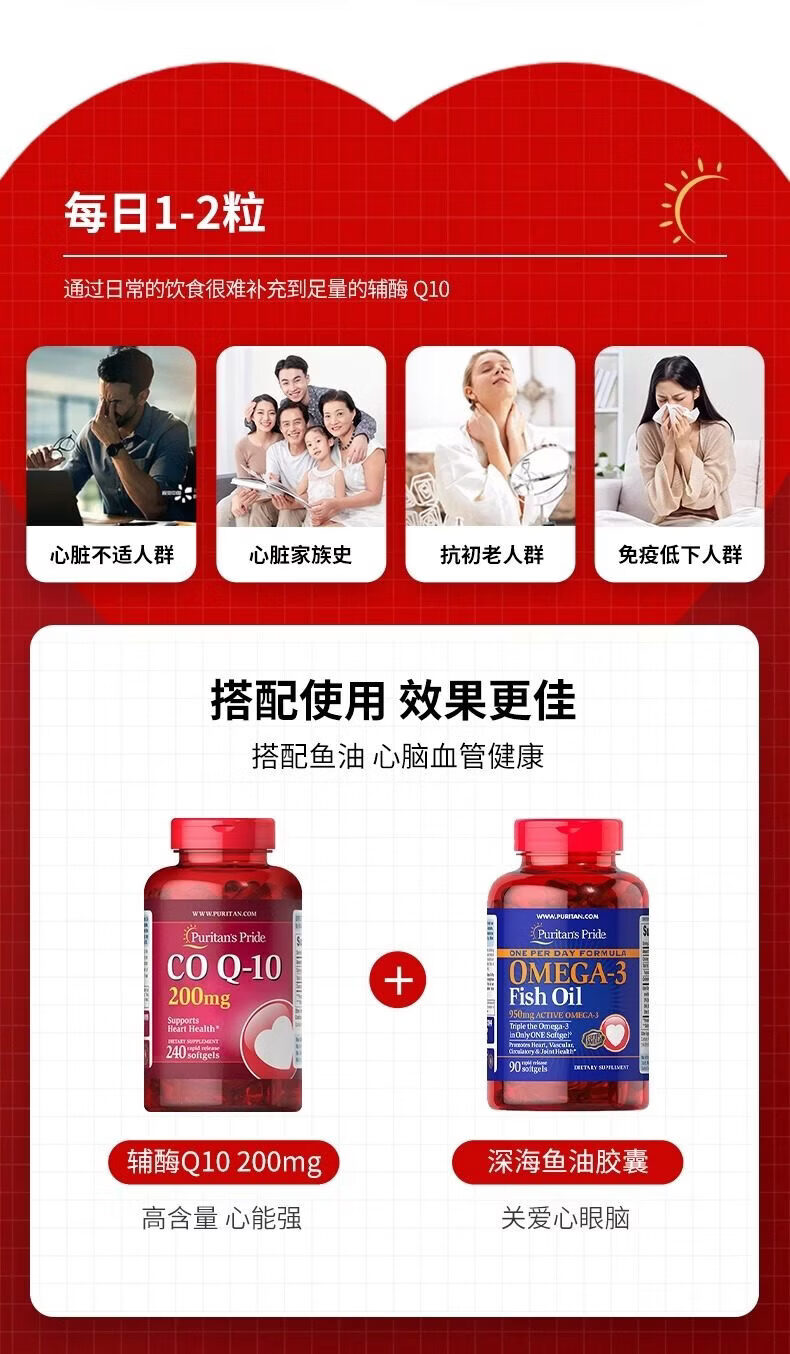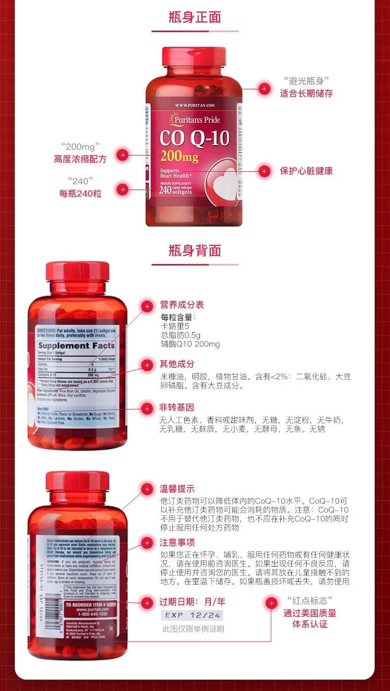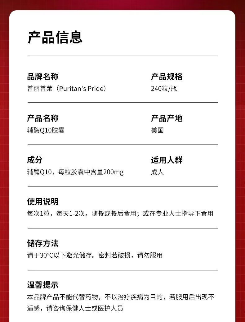 普丽普莱(Puritan's Pride)普丽普莱辅酶q10软胶囊200mg240粒辅酶素q10coq 普丽普莱辅酶q10 240粒*2瓶