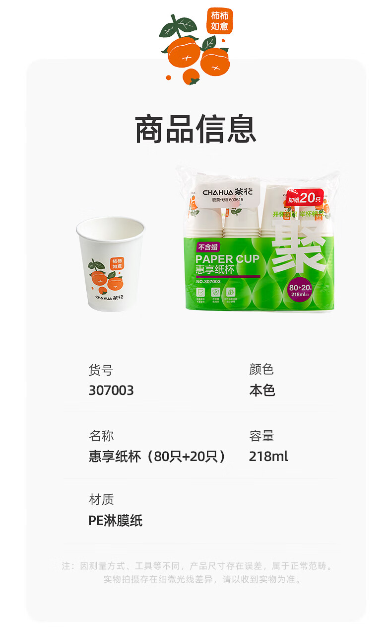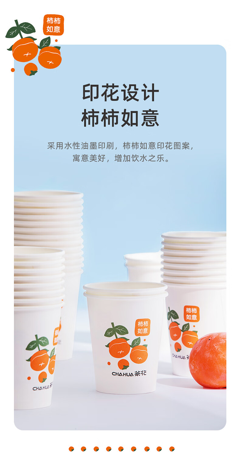 茶花(CHAHUA) 茶花一次性杯子家用办公室加厚咖啡水杯商用惠享纸杯 218ml 100只