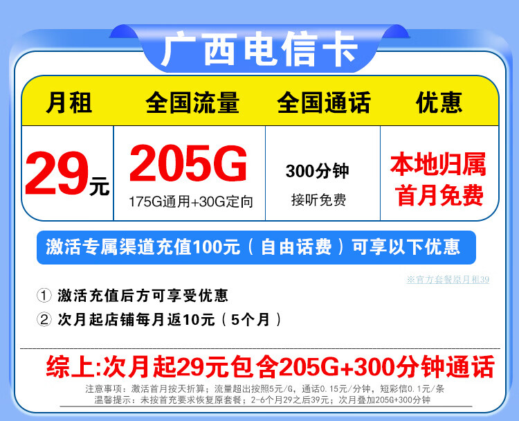 中国电信流量卡电话卡手机卡纯流量卡5G不限速上网卡全国通用无限流量卡非永久流量卡 广东专属-29元205G+100分钟本地超长套餐