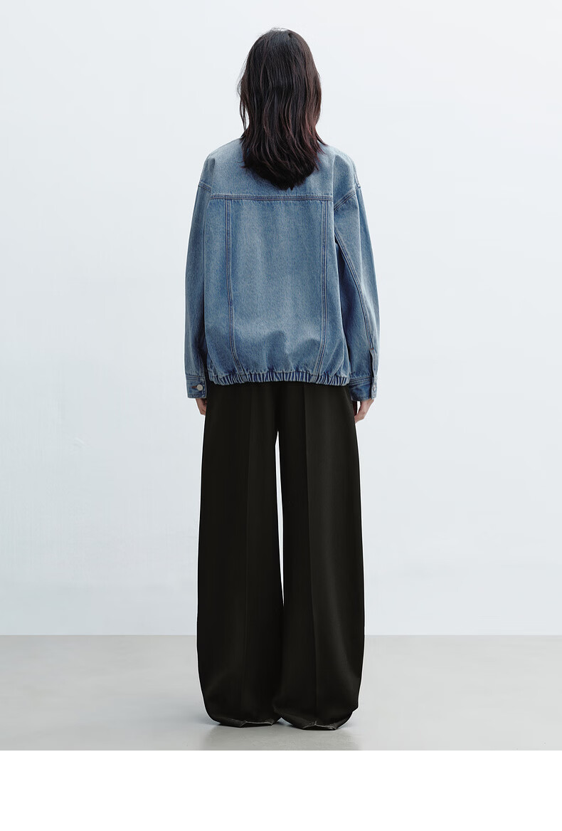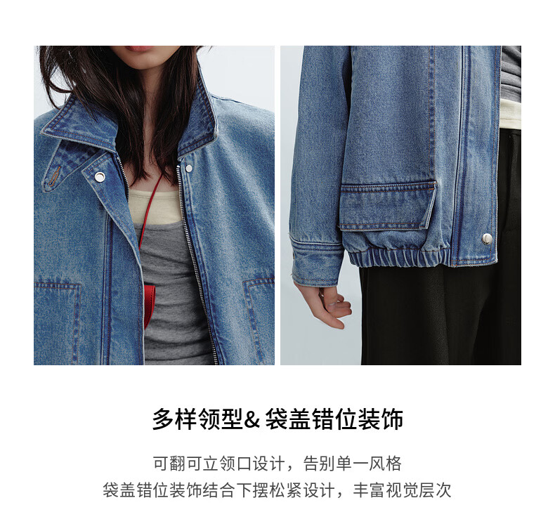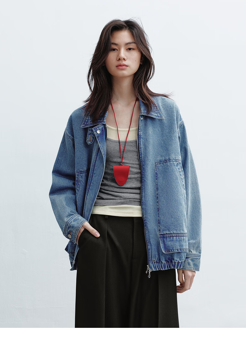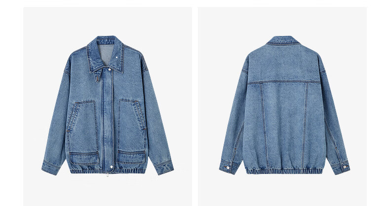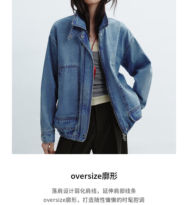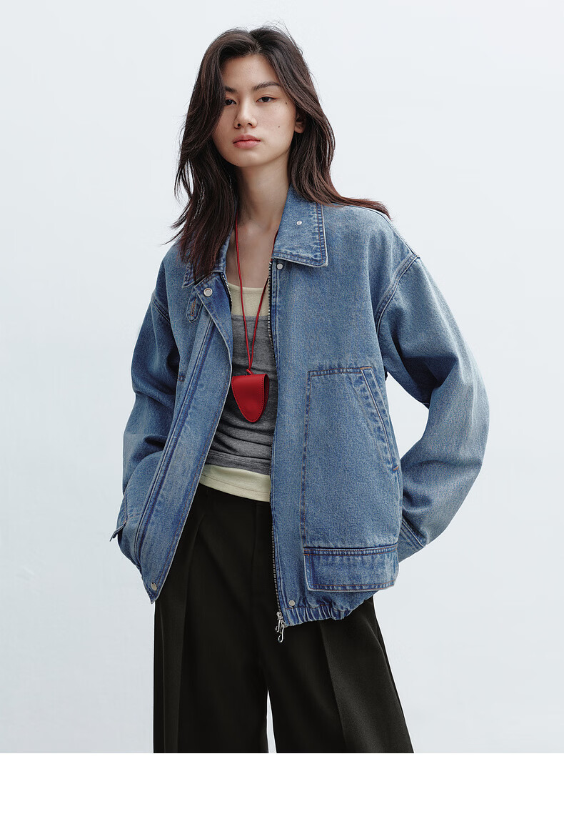 H's纯棉牛仔短外套女26春季新款高级设计宽松廓形双头拉链夹克上衣 牛仔蓝 S