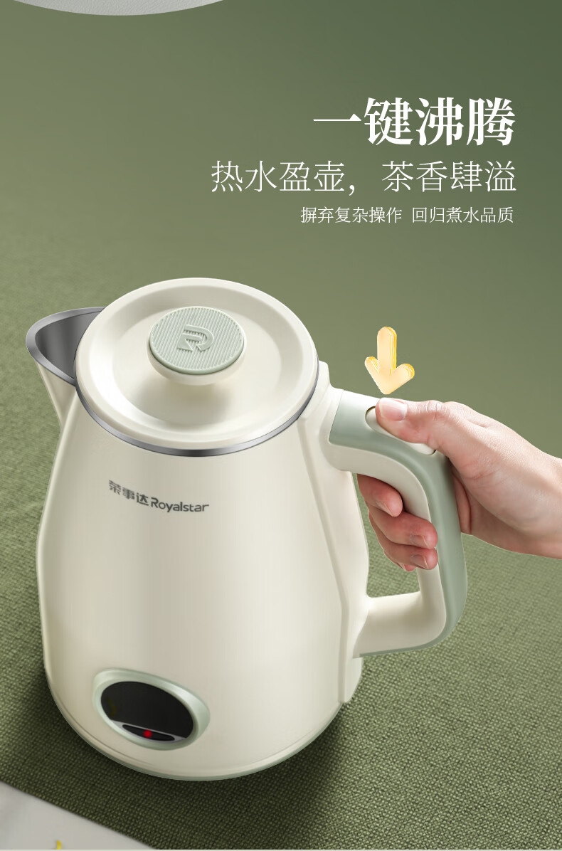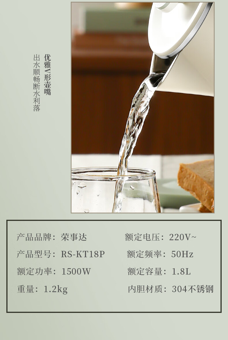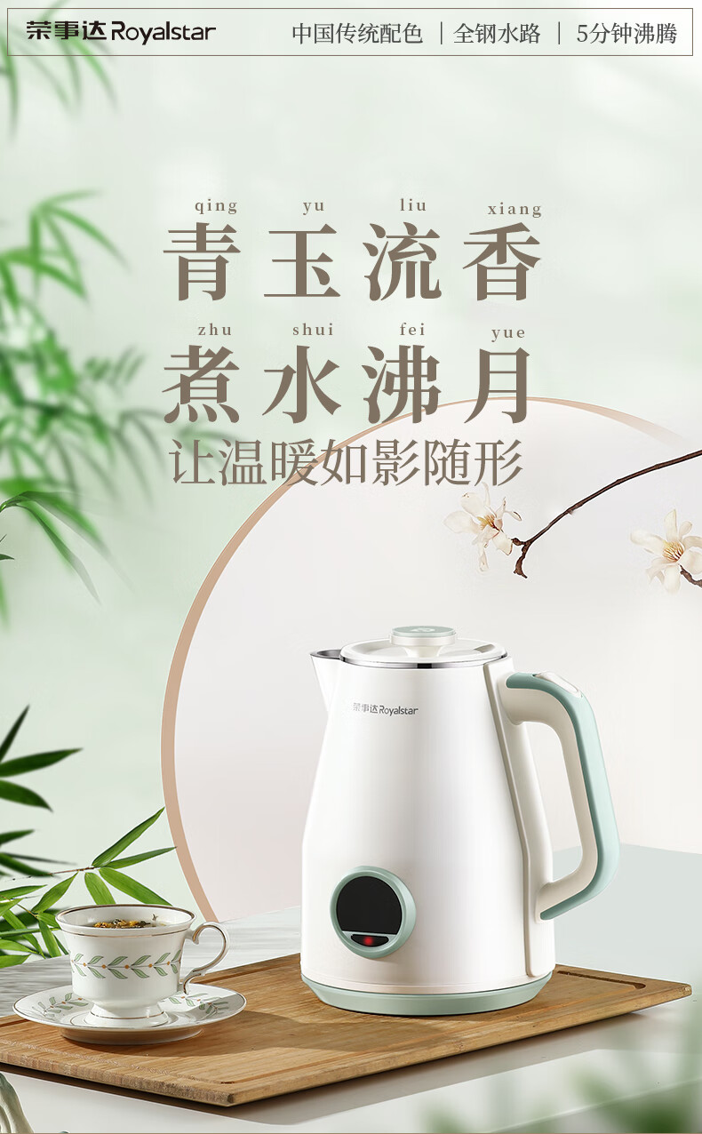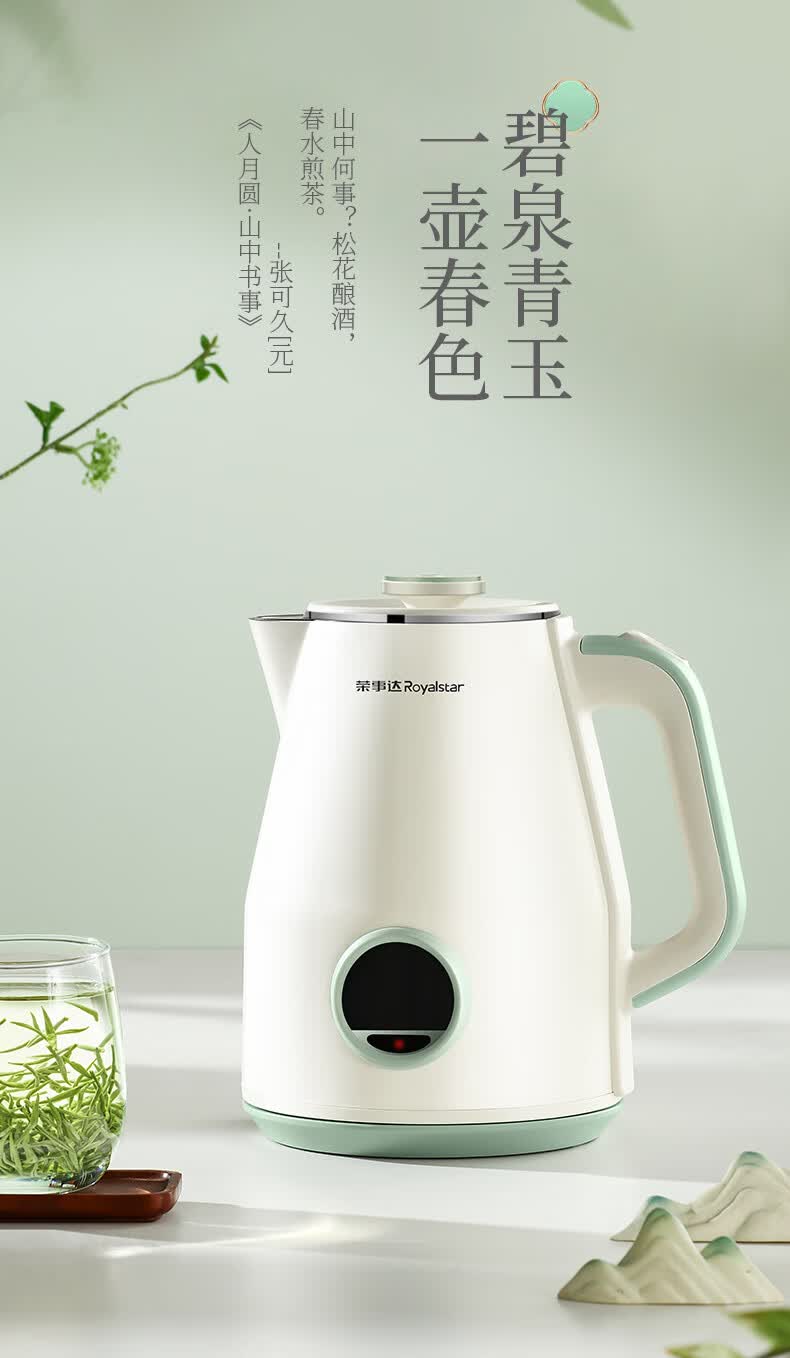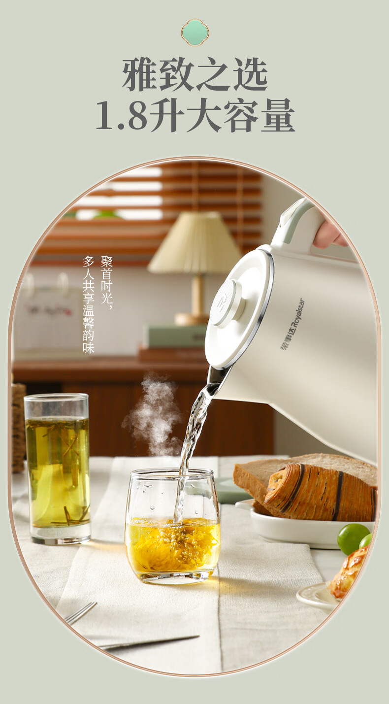 荣事达电热水壶烧水壶1.8L大容量304不锈钢双层防烫办公室家用泡茶饮水速热青玉系列 RS-KT18P