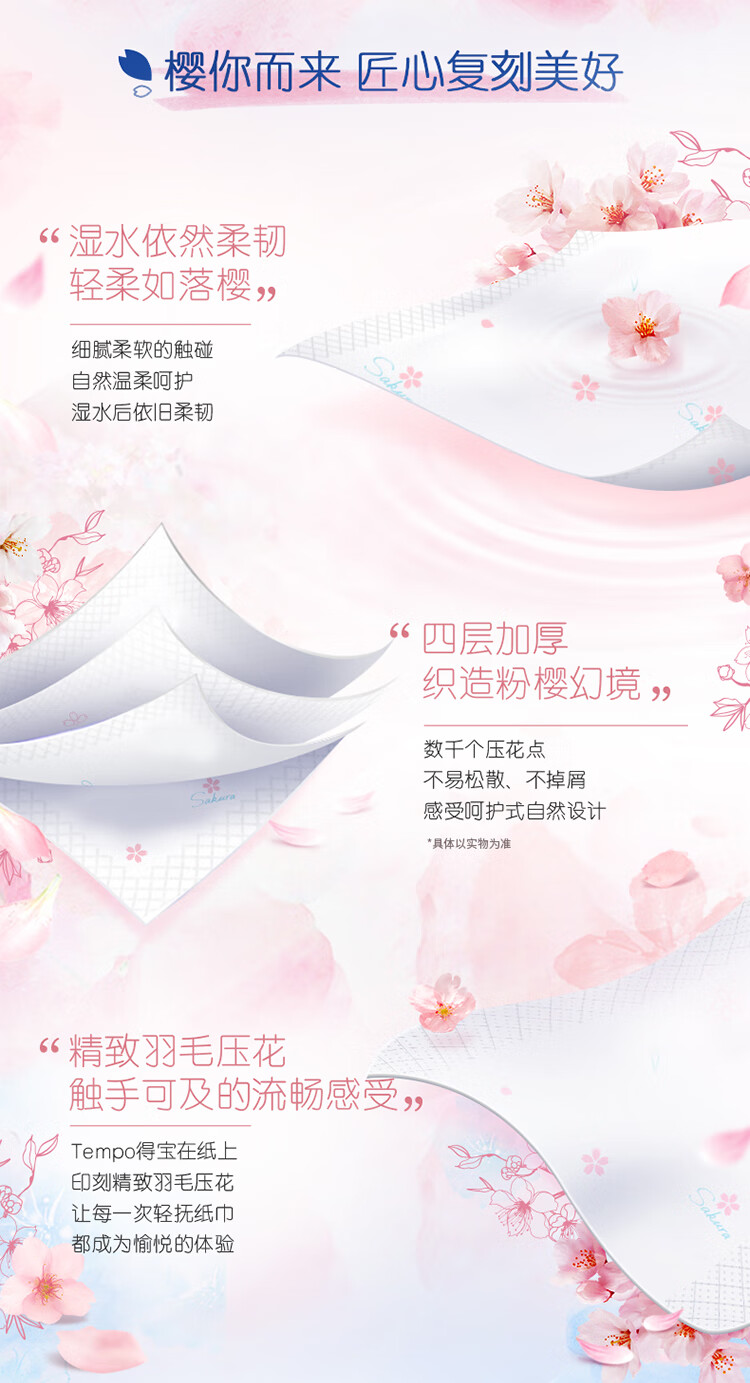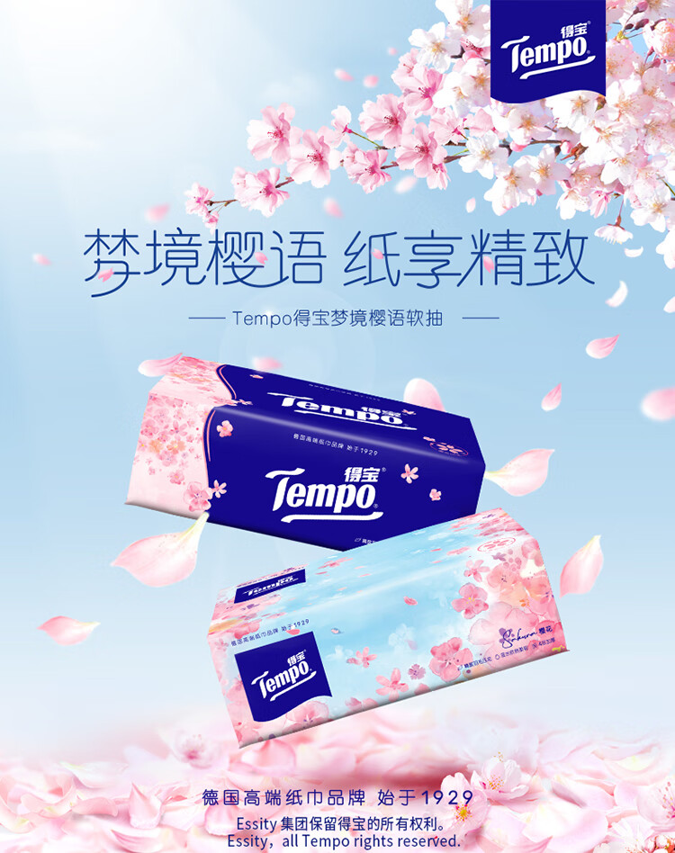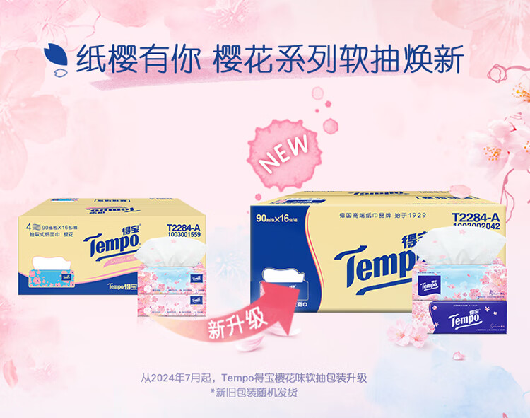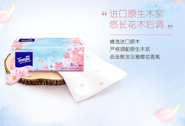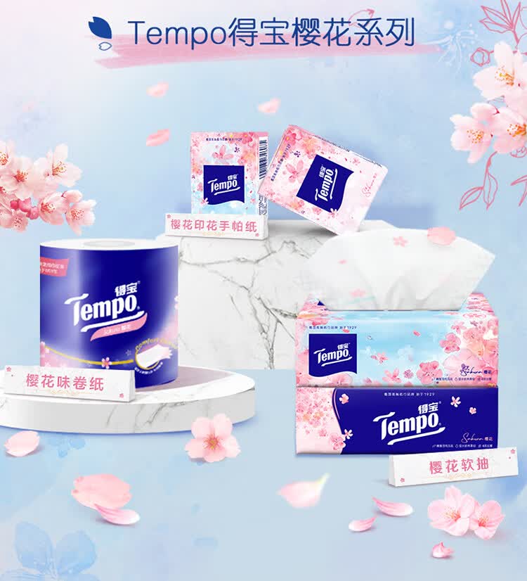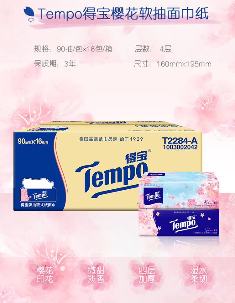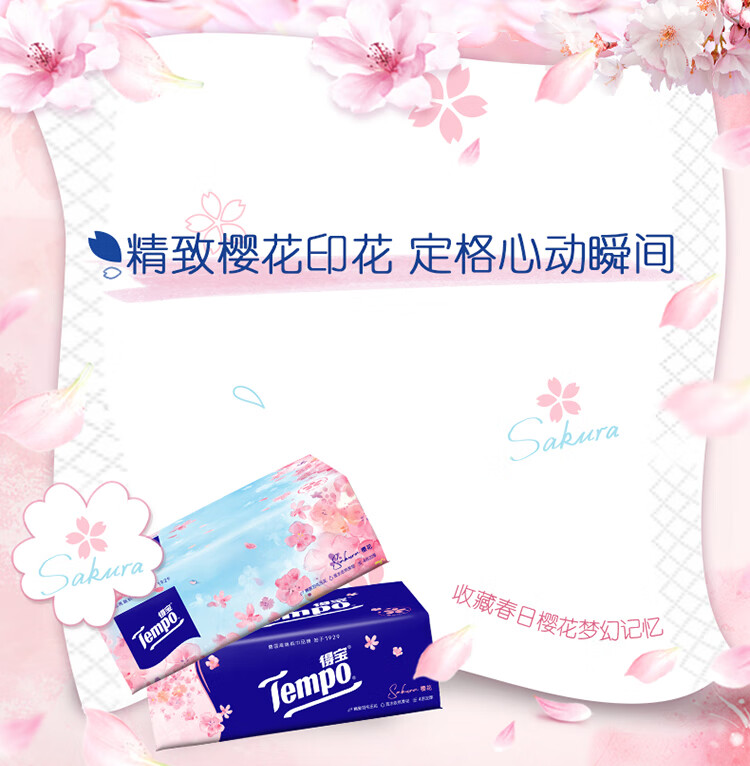 得宝(TEMPO)一博同款 抽纸 真M码 樱花味4层90抽*16包 湿水不易破 纸巾