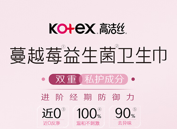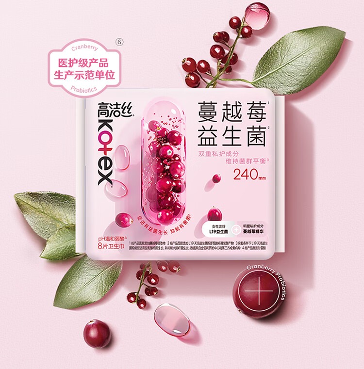 高洁丝【4亿益生菌】蔓越莓益生菌卫生巾日用夜用组合姨妈巾套装 蔓越莓240mm8片*4包