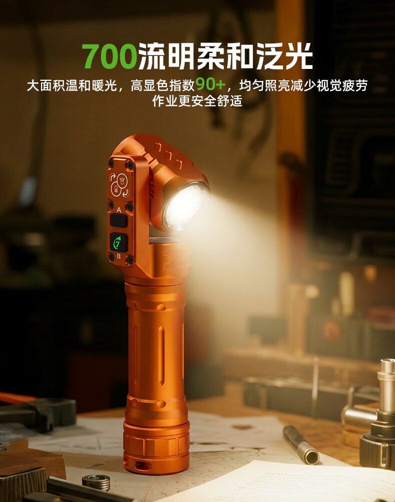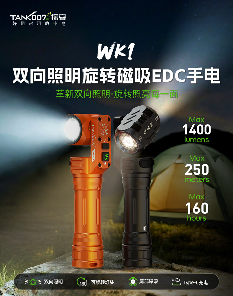 TANK007双向照明手电筒磁吸强光远射户外便携式180度旋转照明检修手电WK1 黑色手电+充电线+精美包装盒