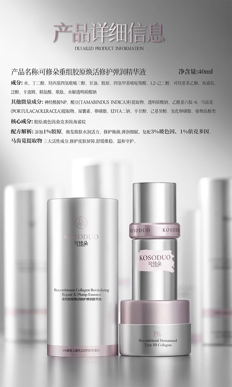 可修朵KOSODUO【女神节礼物】重组胶原焕活修护弹润精华液 重组Ⅲ型胶原蛋白1%高浓净添加量40ml赠送小样 40ml
