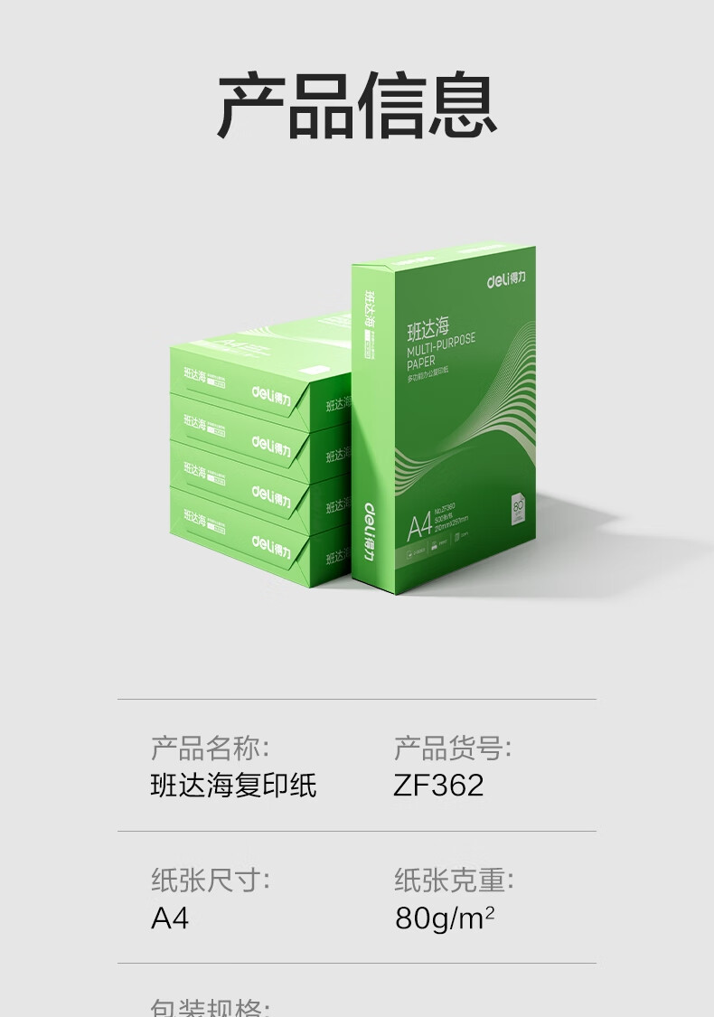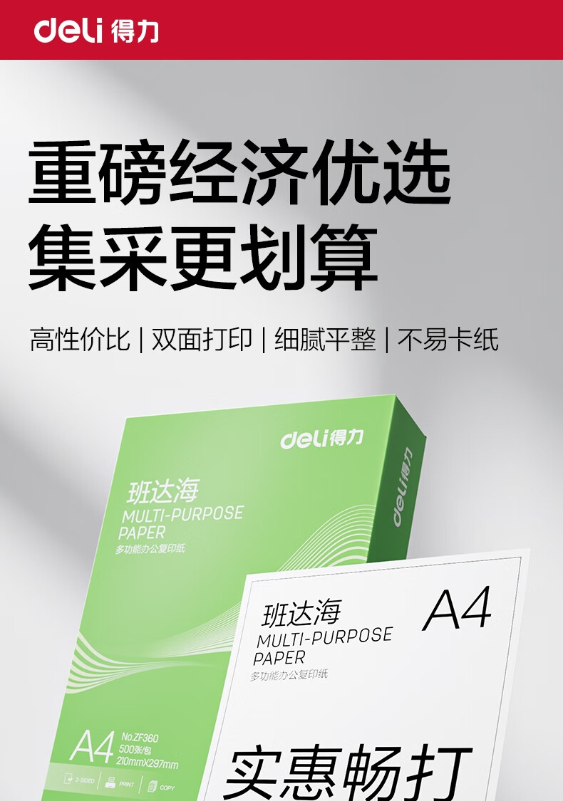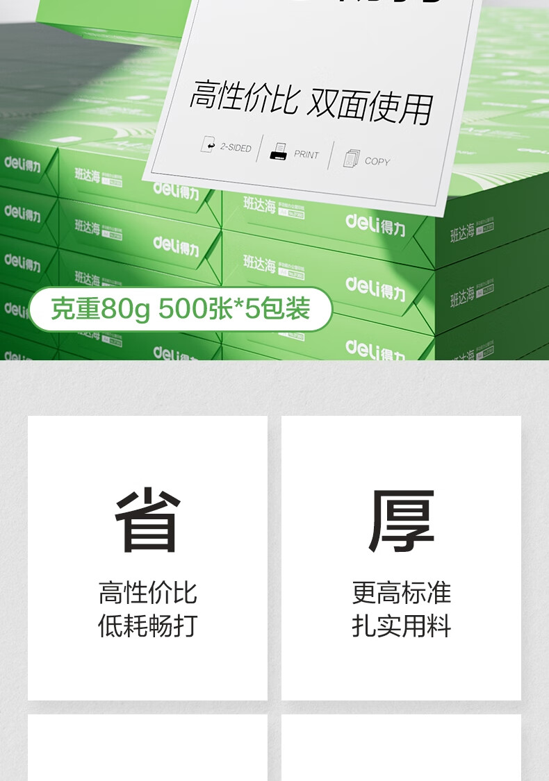 得力(deli)班达海A4打印纸 80g500张*5包一箱 加厚双面复印纸 高性价比草稿纸 整箱2500张ZF362