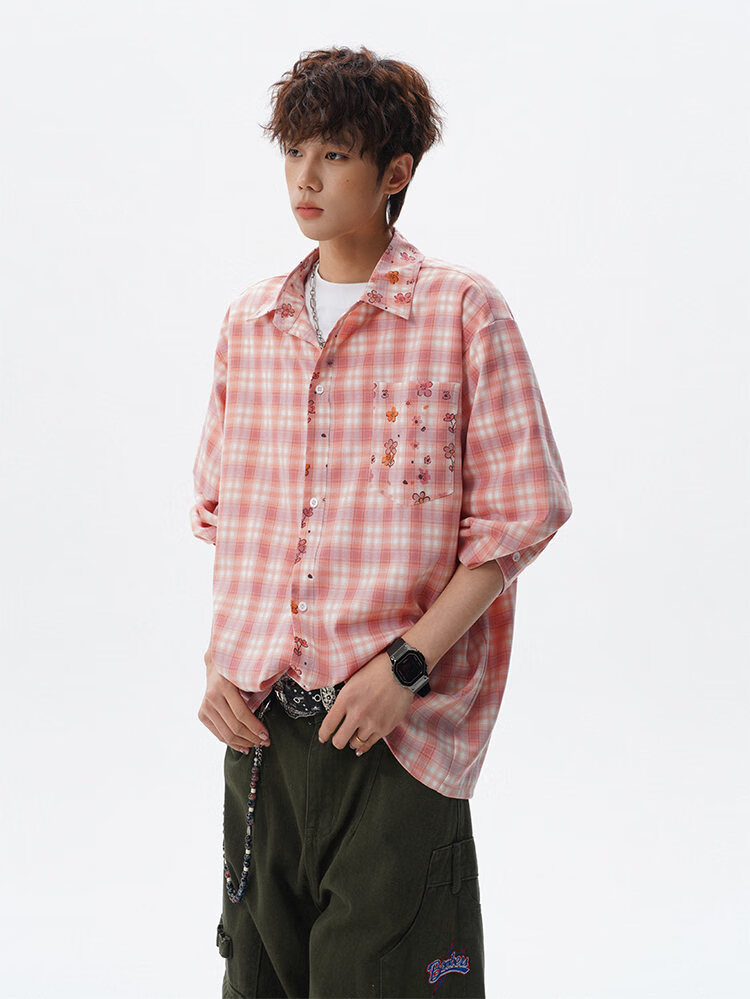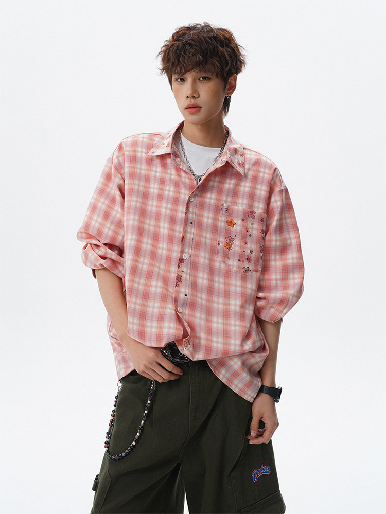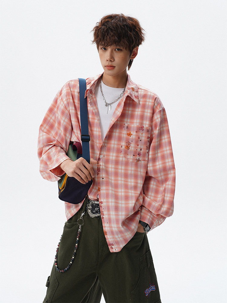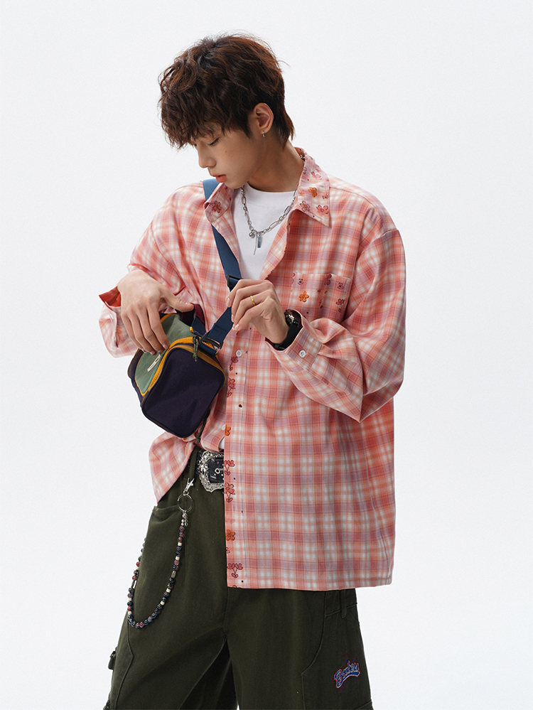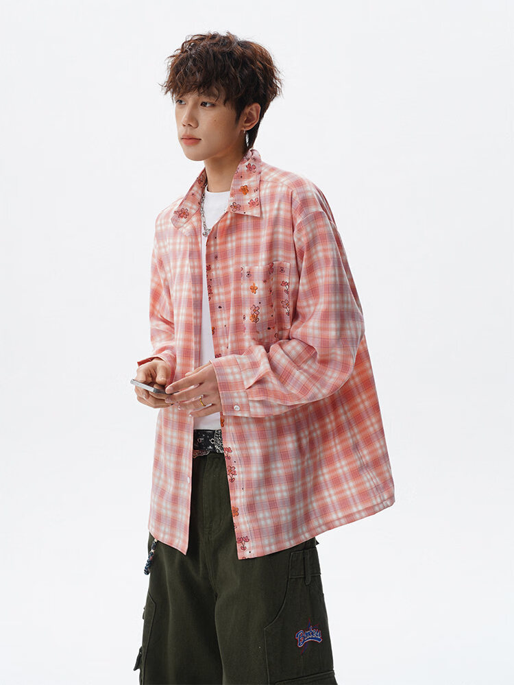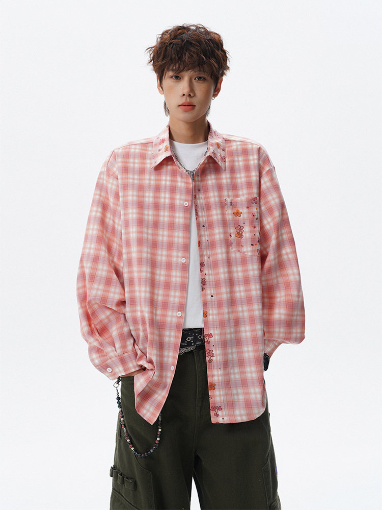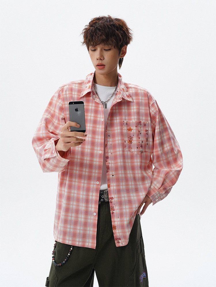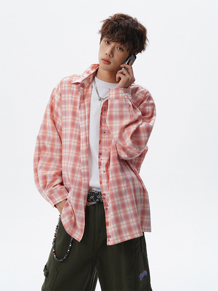 NEW OR MODE美式格子印花长袖衬衫男春季新款潮牌宽松拼接高级感冰丝衬衣外套 粉色【高品质】 M 【建议90-110斤】
